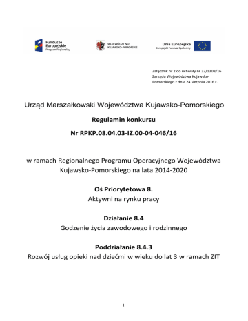 Załącznik nr 2 do uchwały nr 32/1308/16 Zarządu Województwa KujawskoPomorskiego z dnia 24 sierpnia 2016 r. Urząd Marszałkowski Województwa Kujawsko-Pomorskiego Regulamin konkursu Nr RPKP.08.04.03-IZ.00-04-046/16 w ramach Regionalnego Programu Operacyjnego Województwa Kujawsko-Pomorskiego na lata 2014-2020 Oś Priorytetowa 8. Aktywni na rynku pracy Działanie 8.4 Godzenie życia zawodowego i rodzinnego Poddziałanie 8.4.3 Rozwój usług opieki nad dziećmi w wieku do lat 3 w ramach ZIT 1 Informacja/informacja prasowa Zarząd Województwa Kujawsko-Pomorskiego jako Instytucja Zarządzająca Regionalnym Programem Operacyjnym Województwa Kujawsko-Pomorskiego na lata 2014-2020 oraz Miasto Bydgoszcz jako Instytucja Pośrednicząca w ramach instrumentu Zintegrowanych Inwestycji Terytorialnych Regionalnego Programu Operacyjnego Województwa Kujawsko-Pomorskiego na lata 2014-2020 ogłaszają nabór wniosków o dofinansowanie projektu dla Poddziałania 8.4.3 Rozwój usług opieki nad dziećmi w wieku do lat 3 w ramach ZIT Działania 8.4 Godzenie życia zawodowego i rodzinnego w ramach Osi priorytetowej 8. Aktywni na rynku pracy Do wsparcia w ramach konkursu przewidziano następujące typy projektów: Wsparcie tworzenia i funkcjonowania podmiotów świadczących usługi opieki nad dziećmi do lat 3, poprzez: 1. tworzenie nowych miejsc opieki nad dziećmi do lat 3, w tym dostosowanych do potrzeb dzieci z niepełnosprawnościami w istniejących lub nowo tworzonych formach opieki przewidzianych ustawą, 2. sfinansowanie kosztów przeszkolenia zawodowego dziennego opiekuna i niani, 3. pokrycie kosztów wynagrodzenia opiekuna dziennego zatrudnionego przez gminę w części odpowiadającej kosztom opieki nad dzieckiem skierowanym w ramach projektu, 4. dostosowanie miejsc opieki nad dziećmi do lat 3 do potrzeb dzieci z niepełnosprawnościami. Interwencja w ramach Poddziałania 8.4.3 realizowana jest w ramach Zintegrowanych Inwestycji Terytorialnych (ZIT). O wsparcie w ramach konkursu mogą ubiegać się: Wszystkie podmioty z wyłączeniem osób fizycznych (nie dotyczy osób prowadzących działalność gospodarczą lub oświatową na podstawie przepisów odrębnych). Szczegółowe informacje, wzory dokumentów oraz wytyczne dotyczące naboru i oceny projektów zawiera Regulamin konkursu, dostępny na stronie internetowej Instytucji Pośredniczącej ZIT www.zit.btof.pl, Urzędu Marszałkowskiego Województwa Kujawsko-Pomorskiego w Toruniu www.rpo.kujawsko-pomorskie.pl oraz na portalu www.funduszeeuropejskie.gov.pl. Informacji dotyczących konkursu udzielają pracownicy punktów informacyjnych oraz pracownicy Biura ZIT BTOF. Biuro ZIT BTOF, Urząd Miasta Bydgoszczy, ul. Jagiellońska 61, 85-027 Bydgoszcz, Tel. (52) 58 59 446; [email protected] Główny Punkt Informacyjny Funduszy Europejskich w Toruniu Urząd Marszałkowski Województwa Kujawsko-Pomorskiego, Pl. Teatralny 2 tel. (56) 621 82 68; (56) 621 84 86; (56) 621 85 98; [email protected] Główny Punkt Informacyjny Funduszy Europejskich w Bydgoszczy Przedstawicielstwo Urzędu Marszałkowskiego Województwa Kujawsko-Pomorskiego, ul. Jagiellońska 9; tel. (52) 327 68 84; (52) 321 33 42; 797 304 123; [email protected] Lokalne Punkty Informacyjne w Przedstawicielstwach Urzędu Marszałkowskiego Województwa Kujawsko-Pomorskiego w: Grudziądzu, ul. Sienkiewicza 22, tel. (56) 462 45 15; 797 304 124, [email protected] Włocławku, ul. Bechiego 2, tel. (54) 235 67 21; (54) 235 67 12; 797 304 126, [email protected] Inowrocławiu, ul. Roosevelta 36/38, tel. (52) 355 91 95; 797 304 125, [email protected] Więcej informacji na www.rpo.kujawsko-pomorskie.pl 2 Wykaz stosowanych skrótów 1. DW EFS – Departament Wdrażania Europejskiego Funduszu Społecznego; 2. EFS – Europejski Fundusz Społeczny; 3. GWD – Generator Wniosków o Dofinansowanie dla Regionalnego Programu Operacyjnego Województwa Kujawsko-Pomorskiego na lata 2014-2020; 4. Instrukcja – Instrukcja wypełniania wniosku o dofinansowanie projektu w ramach części Regionalnego Programu Operacyjnego Województwa Kujawsko-Pomorskiego na lata 2014-2020 współfinansowanej z EFS stanowiąca załącznik do Regulaminu konkursu; 5. IP – Instytucja Pośrednicząca w ramach instrumentu Zintegrowanych Inwestycji Terytorialnych Regionalnego Programu Operacyjnego Województwa Kujawsko-Pomorskiego na lata 2014-2020, której rolę pełni Miasto Bydgoszcz; 6. IZ RPO WK-P – Instytucja Zarządzająca RPO WK-P 2014-2020, tj. Zarząd Województwa KujawskoPomorskiego pełniący funkcję Instytucji Organizującej Konkurs; adres siedziby: Plac Teatralny 2, 87100 Toruń. 7. JST – jednostka samorządu terytorialnego; 8. KE – Komisja Europejska; 9. KOF-M – Karta oceny formalno-merytorycznej wniosku o dofinansowanie projektu konkursowego stanowiąca załącznik do Regulaminu konkursu; 10. Komitet Monitorujący RPO WK-P 2014-2020 – Komitet Monitorujący Regionalny Program Operacyjny Województwa Kujawsko-Pomorskiego na lata 2014-2020; 11. KOP – Komisja Oceny Projektów powołana do oceny projektów w ramach konkursu; 12. KRS – Krajowy Rejestr Sądowy; 13. PESEL – Powszechny Elektroniczny System Ewidencji Ludności; 14. PFRON – Państwowy Fundusz Rehabilitacji Osób Niepełnosprawnych; 15. PI – priorytet inwestycyjny; 16. Regulamin konkursu – Regulamin konkursu nr RPKP.08.04.03-IZ.00-04-046/16 w ramach Regionalnego Programu Operacyjnego Województwa Kujawsko-Pomorskiego na lata 2014-2020; 17. RPO WK-P 2014-2020 – Regionalny Program Operacyjny Województwa Kujawsko-Pomorskiego na lata 2014-2020; 18. SL2014 – aplikacja główna centralnego systemu teleinformatycznego; 19. SzOOP – Szczegółowy Opis Osi Priorytetowych Regionalnego Programu Operacyjnego Województwa Kujawsko-Pomorskiego na lata 2014-2020; 20. UE – Unia Europejska; 21. Umowa o dofinansowanie projektu – umowa o dofinansowanie projektu w ramach RPO WK-P na lata 2014-2020; 22. Ustawa Pzp – Ustawa z dnia 29 stycznia 2004 