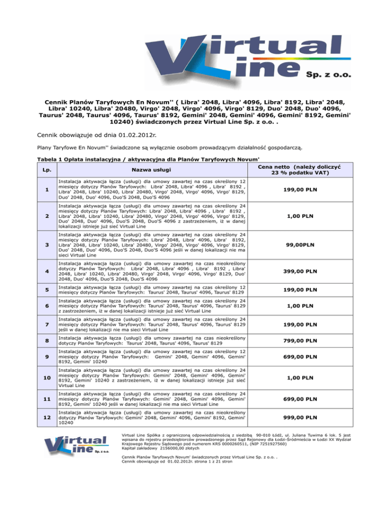 Cennik Planów Taryfowych En Novum'' ( Libra' 2048, Libra' 4096, Libra' 8192, Libra' 2048, Libra' 10240, Libra' 20480, Virgo' 2048, Virgo' 4096, Virgo' 8129, Duo' 2048, Duo' 4096, Taurus' 2048, Taurus' 4096, Taurus' 8192, Gemini' 2048, Gemini' 4096, Gemini' 8192, Gemini' 10240) świadczonych przez Virtual Line Sp. z o.o. . Cennik obowiązuje od dnia 01.02.2012r. Plany Taryfowe En Novum'' świadczone są wyłącznie osobom prowadzącym działalność gospodarczą. Tabela 1 Opłata instalacyjna / aktywacyjna dla Planów Taryfowych Novum' Lp. Nazwa usługi Cena netto (należy doliczyć 23 % podatku VAT) 1 Instalacja aktywacja łącza (usługi) dla umowy zawartej na czas określony 12 miesięcy dotyczy Planów Taryfowych: Libra' 2048, Libra' 4096 , Libra' 8192 , Libra' 2048, Libra' 10240, Libra' 20480, Virgo' 2048, Virgo' 4096, Virgo' 8129, Duo' 2048, Duo' 4096, Duo'S 2048, Duo'S 4096 199,00 PLN 2 Instalacja aktywacja łącza (usługi) dla umowy zawartej na czas określony 24 miesięcy dotyczy Planów Taryfowych: Libra' 2048, Libra' 4096 , Libra' 8192 , Libra' 2048, Libra' 10240, Libra' 20480, Virgo' 2048, Virgo' 4096, Virgo' 8129, Duo' 2048, Duo' 4096, Duo'S 2048, Duo'S 4096 z zastrzeżeniem, iż w danej lokalizacji istnieje już sieć Virtual Line 1,00 PLN 3 Instalacja aktywacja łącza (usługi) dla umowy zawartej na czas określony 24 miesięcy dotyczy Planów Taryfowych: Libra' 2048, Libra' 4096, Libra' 8192, Libra' 2048, Libra' 10240, Libra' 20480, Virgo' 2048, Virgo' 4096, Virgo' 8129, Duo' 2048, Duo' 4096, Duo'S 2048, Duo'S 4096 jeśli w danej lokalizacji nie ma sieci Virtual Line 99,00PLN 4 Instalacja aktywacja łącza (usługi) dla umowy zawartej na czas nieokreślony dotyczy Planów Taryfowych: Libra' 2048, Libra' 4096 , Libra' 8192 , Libra' 2048, Libra' 10240, Libra' 20480, Virgo' 2048, Virgo' 4096, Virgo' 8129, Duo' 2048, Duo' 4096, Duo'S 2048, Duo'S 4096 399,00 PLN 5 Instalacja aktywacja łącza (usługi) dla umowy zawartej na czas określony 12 miesięcy dotyczy Planów Taryfowych: Taurus' 2048, Taurus' 4096, Taurus' 8129 199,00 PLN 6 Instalacja aktywacja łącza (usługi) dla umowy zawartej na czas określony 24 miesięcy dotyczy Planów Taryfowych: Taurus' 2048, Taurus' 4096, Taurus' 8129 z zastrzeżeniem, iż w danej lokalizacji istnieje już sieć Virtual Line 1,00 PLN 7 Instalacja aktywacja łącza (usługi) dla umowy zawartej na czas określony 24 miesięcy dotyczy Planów Taryfowych: Taurus' 2048, Taurus' 4096, Taurus' 8129 jeśli w danej lokalizacji nie ma sieci Virtual Line 199,00 PLN 8 Instalacja aktywacja łącza (usługi) dla umowy zawartej na czas nieokreślony dotyczy Planów Taryfowych: Taurus' 2048, Taurus' 4096, Taurus' 8129 799,00 PLN 9 Instalacja aktywacja łącza (usługi) dla umowy zawartej na czas określony 12 miesięcy dotyczy Planów Taryfowych: Gemini' 2048, Gemini' 4096, Gemini' 8192, Gemini' 10240 699,00 PLN 10 Instalacja aktywacja łącza (usługi) dla umowy zawartej na czas określony 24 miesięcy dotyczy Planów Taryfowych: Gemini' 2048, Gemini' 4096, Gemini' 8192, Gemini' 10240 z zastrzeżeniem, iż w danej lokalizacji istnieje już sieć Virtual Line 1,00 PLN 11 Instalacja aktywacja łącza (usługi) dla umowy zawartej na czas określony 24 miesięcy dotyczy Planów Taryfowych: Gemini' 2048, Gemini' 4096, Gemini' 8192, Gemini' 10240 jeśli w danej lokalizacji nie ma sieci Virtual Line 699,00 PLN 12 Instalacja aktywacja łącza (usługi) dla umowy zawartej na czas nieokreślony dotyczy Planów Taryfowych: Gemini' 2048, Gemini' 4096, Gemini' 8192, Gemini' 10240 999,00 PLN Virtual Line Spółka z ograniczoną odpowiedzialnością z siedzibą 90-010 Łódź, ul. Juliana Tuwima 6 lok. 5 jest wpisana do rejestru przedsiębiorców prowadzonego przez Sąd Rejonowy dla Łodzi-Śródmieścia w Łodzi XX Wydział Krajowego Rejestru Sądowego pod numerem KRS 0000260511, (NIP 7251927560) Kapitał zakładowy 2156000,00 złotych Cennik Planów Taryfowych Novum' świadczonych przez Virtual Line Sp. z o.o. . Cennik obowiązuje od 01.02.2012r. strona 1 z 21 stron Tabela 2 Opłaty Abonamentowe Planów Taryfowych Novum' dla umów zawartych na czas określony 24 miesięcy. Lp. Nazwa usługi Cena netto (należy doliczyć 23 % podatku VAT) 1 Libra' 2048 stały dostęp do sieci Internet z maksymalną prędkością (do | od terminala Abonenta) 2048 kb/s | 512 kb/s stały dostęp do sieci LAN Virtual Line liczba minut w abonamencie : NIE DOTYCZY wewnętrzny stały adres IP: 1 zewnętrzny stały adres IP: 1 Liczba kont pocztowych w domenie operatora |pojemność: 1 |100 MB liczba | pojemność kont pocztowych we własnej domenie Abonenta: NIE dostęp do pakietu usług dodatkowych: TAK serwer wirtualny na stronę Abonenta NIE Serwer PROXY/NAT/FIREWALL: TAK Dostęp do CGI NIE Utrzymanie DNS domeny Abonenta TAK Dostęp do MySQL | Pojemność NIE Gwarantowany czas reakcji na zgłoszenie serwisowe (SLA) NIE 33,00 PLN 2 Libra' 4096 stały dostęp do sieci Internet z maksymalną prędkością (do | od terminala Abonenta) 4096 kb/s | 512 kb/s stały dostęp do sieci LAN Virtual Line liczba minut w abonamencie : NIE DOTYCZY wewnętrzny stały adres IP: 1 zewnętrzny stały adres IP: 1 Liczba kont pocztowych w domenie operatora |pojemność: 1 |100 MB liczba kont pocztowych we własnej domenie Abonenta: NIE dostęp do pakietu usług dodatkowych: TAK serwer wirtualny na stronę Abonenta NIE Serwer PROXY/NAT/FIREWALL: TAK Dostęp do CGI NIE Utrzymanie DNS domeny Abonenta TAK Dostęp do MySQL | Pojemność NIE Gwarantowany czas reakcji na zgłoszenie serwisowe (SLA) NIE 48,00 PLN 3 Libra' 4096+ stały dostęp do sieci Internet z maksymalną prędkością (do | od terminala Abonenta) 4096 kb/s | 1024 kb/s stały dostęp do sieci LAN Virtual Line liczba minut w abonamencie : NIE DOTYCZY wewnętrzny stały adres IP: 1 zewnętrzny stały adres IP: 1 Liczba kont pocztowych w domenie operatora |pojemność: 1 |100 MB liczba kont pocztowych we własnej domenie Abonenta: NIE dostęp do pakie