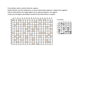 Przy każdym domu umieść zbiornik z gazem. Każdy domek musi być połączony ze swoim zbiornikiem jednym z boków (nie rogiem) Pola ze zbiornikami nie mogą stykać się ze sobą ani bokiem, ani rogiem. Liczby przy brzegach określają ile powinno być zbiorników w rzędzie. 4 1 6 1 3 5 ⌂ ⌂ 3 4 ⌂ 4 ⌂ 4 3 4 ⌂ 4 ⌂ 3 ⌂ 5 ⌂ ⌂ 3 ⌂ 4 ⌂ ⌂ 3 ⌂ 4 3 0 6 0 3 4 2 3 3 3 4 0 7 ⌂ ⌂ ⌂ ⌂ ⌂ ⌂ ⌂ ⌂ ⌂ ⌂ ⌂ ⌂ ⌂ ⌂ ⌂ ⌂ ⌂ ⌂ ⌂ ⌂ ⌂ ⌂ ⌂ ⌂ ⌂ ⌂ ⌂ ⌂ ⌂ ⌂ ⌂ ⌂ ⌂ ⌂ ⌂ ⌂ ⌂ ⌂ ⌂ ⌂