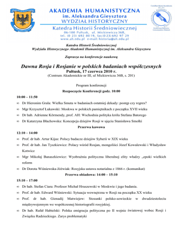 Katedra Historii Średniowiecznej Wydziału Historycznego Akademii Humanistycznej im. Aleksandra Gieysztora Zaprasza na konferencje naukową Dawna Rosja i Rosjanie w polskich badaniach współczesnych Pułtusk, 17 czerwca 2010 r. (Centrum Akademickie nr III, ul Mickiewicza 36B, s. 201) Program konferencji Rozpoczęcie Konferencji godz. 10:00 10:00 – 11:50 • Dr Hieronim Grala: Wielka Smuta w badaniach ostatniej dekady: postęp czy regres? • Mgr Krzysztof Łukawski: Moskwa w polskich pamiętnikach z początku XVII wieku • Dr hab. Adrienne Körmendy, prof. AH: Wschodnia polityka króla Stefana Batorego • Dr Katarzyna Błachowska: Koncepcja dziejów Rosji w ujęciu Stanisława Smolki Przerwa kawowa 12:10 – 14:00 • Prof. dr hab. Artur Kijas: Polscy badacze dziejów Syberii w XIX wieku • Prof. dr hab. Jan Tyszkiewicz: Polacy wśród Rosjan, mongoliści Józef Kowalewski i Władysław Kotwicz • Mgr Mikołaj Banaszkiewicz: Wyobraźnia polityczna liberalnej elity władzy „epoki wielkich reform • Dr Dorota Wiśniewska-Jóźwiak: Rosyjska ustawa notarialna z 1866 r. (komunikat) Przerwa obiadowa: 14:00 – 15:10 15:10 – 17:00 • Dr hab. Stefan Ciara: Profesor Michał Hruszewski w Moskwie i jego badania. • Prof. dr hab. Edward Wiśniewski: Sytuacja wewnętrzna w Rosji na początku XX wieku • Prof. dr hab. Gienadij Matwiejew: Stosunki polsko-sowieckie w dwudziestoleciu międzywojennym we współczesnej historiografii rosyjskiej. • Dr hab. Rafał Habielski: Polska emigracja polityczna po II wojnie światowej wobec Rosji i Związku Radzieckiego. Zarys problematyki
