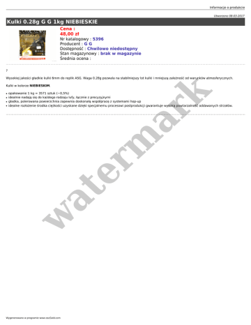 Informacje o produkcie Utworzono 08-03-2017 Kulki 0.28g G G 1kg NIEBIESKIE Cena : 48,00 zł Nr katalogowy : 5396 Producent : G G Dostępność : Chwilowo niedostępny Stan magazynowy : brak w magazynie Średnia ocena : ? Wysokiej jakości gładkie kulki 6mm do replik ASG. Waga 0.28g pozwala na stabilniejszy lot kulki i mniejszą zależność od warunków atmosferycznych. ● ● ● opakowanie 1 kg = 3571 sztuk (~0,5%) idealnie nadają się do każdego rodzaju lufy, łącznie z precyzyjnymi gładka, polerowana powierzchnia zapewnia doskonałą współpracę z systemami hop-up idealne rozłożenie środka ciężkości uzyskane dzięki specjalnemu procesowi postprodukcji gwarantuje wysoką powtarzalność oddawanych strzałów. w at ● er m ar k Kulki w kolorze NIEBIESKIM. Wygenerowano w programie www.oscGold.com