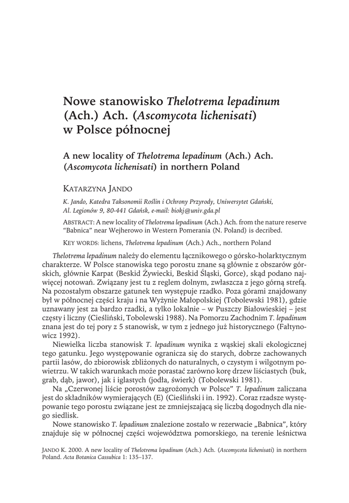 Nowe stanowisko Thelotrema lepadinum (Ach.) Ach. (Ascomycota lichenisati) w Polsce północnej A new locality of Thelotrema lepadinum (Ach.) Ach. (Ascomycota lichenisati) in northern Poland KATARZYNA JANDO K. Jando, Katedra Taksonomii Roślin i Ochrony Przyrody, Uniwersytet Gdański, Al. Legionów 9, 80-441 Gdańsk, e-mail: [email protected] ABSTRACT: A new locality of Thelotrema lepadinum (Ach.) Ach. from the nature reserve “Babnica” near Wejherowo in Western Pomerania (N. Poland) is decribed. KEY WORDS: lichens, Thelotrema lepadinum (Ach.) Ach., northern Poland Thelotrema lepadinum należy do elementu łącznikowego o górsko-holarktycznym charakterze. W Polsce stanowiska tego porostu znane są głównie z obszarów górskich, głównie Karpat (Beskid Żywiecki, Beskid Śląski, Gorce), skąd podano najwięcej notowań. Związany jest tu z reglem dolnym, zwłaszcza z jego górną strefą. Na pozostałym obszarze gatunek ten występuje rzadko. Poza górami znajdowany był w północnej części kraju i na Wyżynie Małopolskiej (Tobolewski 1981), gdzie uznawany jest za bardzo rzadki, a tylko lokalnie – w Puszczy Białowieskiej – jest częsty i liczny (Cieśliński, Tobolewski 1988). Na Pomorzu Zachodnim T. lepadinum znana jest do tej pory z 5 stanowisk, w tym z jednego już historycznego (Fałtynowicz 1992). Niewielka liczba stanowisk T. lepadinum wynika z wąskiej skali ekologicznej tego gatunku. Jego występowanie ogranicza się do starych, dobrze zachowanych partii lasów, do zbiorowisk zbliżonych do naturalnych, o czystym i wilgotnym powietrzu. W takich warunkach może porastać zarówno korę drzew liściastych (buk, grab, dąb, jawor), jak i iglastych (jodła, świerk) (Tobolewski 1981). Na „Czerwonej liście porostów zagrożonych w Polsce” T. lepadinum zaliczana jest do składników wymierających (E) (Cieśliński i in. 1992). Coraz rzadsze występowanie tego porostu związane jest ze zmniejszającą się liczbą dogodnych dla niego siedlisk. Nowe stanowisko T. lepadinum znalezione zostało w rezerwacie „Babnica”, który znajduje się w północnej części województwa pomorskiego, na terenie leśnictwa JANDO K. 2000. A new locality of Thelotrema lepadinum (Ach.) Ach. (Ascomycota lichenisati) in northern Poland. Acta Botanica Cassubica 1: 135–137. 136 Katarzyna Jando Ryc. 1. Położenie rezerwatu „Babnica” (wg Fałtynowicz 1988) 1 – granica rezerwatu, 2 – linie oddziałowe, 3 – drogi Fig. 1. Location of the nature reserve “Babnica” 1 – boundary of the nature reserve, 2 – boundaries of forest sections, 3 – roads (acc. to Fałtynowicz 1988) Białogóra w nadleśnictwie Choczewo (ryc. 1; kwadrat ATPOL Ac36). Rezerwat ten utworzono w celu ochrony zachodniopomorskiego acydofilnego lasu bukowo-dębowego Fago-Quercetum porastającego wydmę paraboliczną. Dodatkowym walorem tego fragmentu lasu jest obecność wielu gatunków porostów, w tym rzadkich i bardzo rzadkich w skali nie tylko Pomorza, ale i całej Polski (Fałtynowicz 1988). Nieliczne, ale zdrowe i dobrze wykształcone plechy T. lepadinum rosły na korze starego buka. Znalezienie tego rzadkiego gatunku, uważanego za relikt lasów pierwotnych, podkreśla naturalny charakter fitocenoz występujących w rezerwacie. Okaz zielnikowy znajduje się w UGDA-L (leg. Bzoma, 03.02.1992). Podziękowania. Dziękuję prof. dr. hab. Wiesławowi Fałtynowiczowi za sprawdzenie oznaczenia. Nowe stanowisko Thelotrema lepadinum... w Polsce Północnej 137 Praca zrealizowana w ramach projektu badawczego finansowanego przez Komitet Badań Naukowych (grant nr 0946/PO4/98/15). Summary Thelotrema lepadinum (Ach.) Ach. is very rare species in northern Poland and it has five localities in Western Pomerania only. A new locality is placed in the nature reserve “Babnica”, about 800 m from the Baltic shore. T. lepadinum grows on beech bark in a small patch of an old deciduous forest. Literatura CIEŚLIŃSKI S., CZYŻEWSKA K., FABISZEWSKI J. 1992. Czerwona lista porostów zagrożonych w Polsce. – W: Zarzycki K., Wojewoda W., Heinrich Z. (red.). Lista roślin zagrożonych w Polsce. Wyd. 2. Inst. Bot. im. W. Szafera, PAN, Kraków, s. 57–74. CIEŚLIŃSKI S., TOBOLEWSKI Z. 1988. Porosty (Lichenes) Puszczy Białowieskiej i jej zachodniego przedpola. – Phytocoenosis 1 (N.S.), Suppl., Cartographiae Geobotanicae 1: 3–216. FAŁTYNOWICZ W. 1988. Projektowany rezerwat florystyczno-leśny „Kaszebskie Liszaje” w Białogórze na Pomorzu Zachodnim. – Parki Narodowe i Rezerwaty Przyrody 9.1: 27–32. FAŁTYNOWICZ W. 1992. The lichens of Western Pomerania (NW Poland). An ecogeographical study. – Polish Bot. Stud. 4: 1–182. NOWAK J., TOBOLEWSKI Z. 1975. Porosty polskie. PWN, Warszawa–Kraków, ss.1177. TOBOLEWSKI Z. 1981. Porosty (Lichenes). 7. Atlas rozmieszczenia roślin zarodnikowych w Polsce. III. PWN, Warszawa–Poznań.