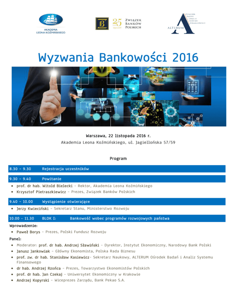 Wyzwania Bankowości 2016 Warszawa, 22 listopada 2016 r. Akademia Leona Koźmińskiego, ul. Jagiellońska 57/59 Program 8.30 – 9.30 Rejestracja uczestników 9.30 – 9.40 Powitanie prof. dr hab. Witold Bielecki – Rektor, Akademia Leona Koźmińskiego Krzysztof Pietraszkiewicz – Prezes, Związek Banków Polskich 9.40 – 10.00 Wystąpienie otwierające Jerzy Kwieciński – Sekretarz Stanu, Ministerstwo Rozwoju 10.00 - 11.30 BLOK I: Bankowość wobec programów rozwojowych państwa Wprowadzenie: Paweł Borys – Prezes, Polski Fundusz Rozwoju Panel: Moderator: prof. dr hab. Andrzej Sławiński – Dyrektor, Instytut Ekonomiczny, Narodowy Bank Polski Janusz Jankowiak – Główny Ekonomista, Polska Rada Biznesu prof. zw. dr hab. Stanisław Kasiewicz– Sekretarz Naukowy, ALTERUM Ośrodek Badań i Analiz Systemu Finansowego dr hab. Andrzej Rzońca – Prezes, Towarzystwo Ekonomistów Polskich prof. dr hab. Jan Czekaj – Uniwersytet Ekonomiczny w Krakowie Andrzej Kopyrski – Wiceprezes Zarządu, Bank Pekao S.A. 11.30 – 12.00 Przerwa kawowa 12.00 – 13.30 BLOK II: Wpływ obciążeń fiskalnych i regulacyjnych na sytuację banków Wprowadzenie: prof. dr hab. Krzysztof Kalicki – Prezes Zarządu, Deutsche Bank Polska S.A., prof. Akademii Leona Koźmińskiego Panel: Moderator: dr Marek Radzikowski – Doradca Zarządu, Związek Banków Polskich Wiesław Janczyk – Sekretarz Stanu, Ministerstwo Finansów prof. dr hab. Monika Marcinkowska – Uniwersytet Łódzki Wiesław Thor – Członek Rady Nadzorczej, mBank S.A. dr Marek Rozkrut – Partner, EY prof. dr hab. Dominik Gajewski – Szkoła Główna Handlowa 13.30 – 14.30 Przerwa obiadowa 14.30 – 16.00 BLOK III: Cyberbezpieczeństwo i compliance Wprowadzenie: Piotr Czarnecki – Prezes Zarządu, Raiffeisen Bank Polska S.A. Panel: Moderator: dr Mieczysław Groszek – Wiceprezes, Związek Banków Polskich prof. dr hab. Tadeusz Winkler-Drews – Akademia Leona Koźmińskiego gen. Włodzimierz Nowak – Dyrektor, Ministerstwo Cyfryzacji prof. dr hab. Mirosław Kutyłowski – Politechnika Wrocławska Joanna Grynfelder – Ekspert Compliance Tomasz Piwowarski – Dyrektor, Urząd Komisji Nadzoru Finansowego 16.00 – 16.15 Podsumowanie i zamknięcie konferencji dr Lech Kurkliński – Dyrektor, Alterum www.aleBank.pl/WB