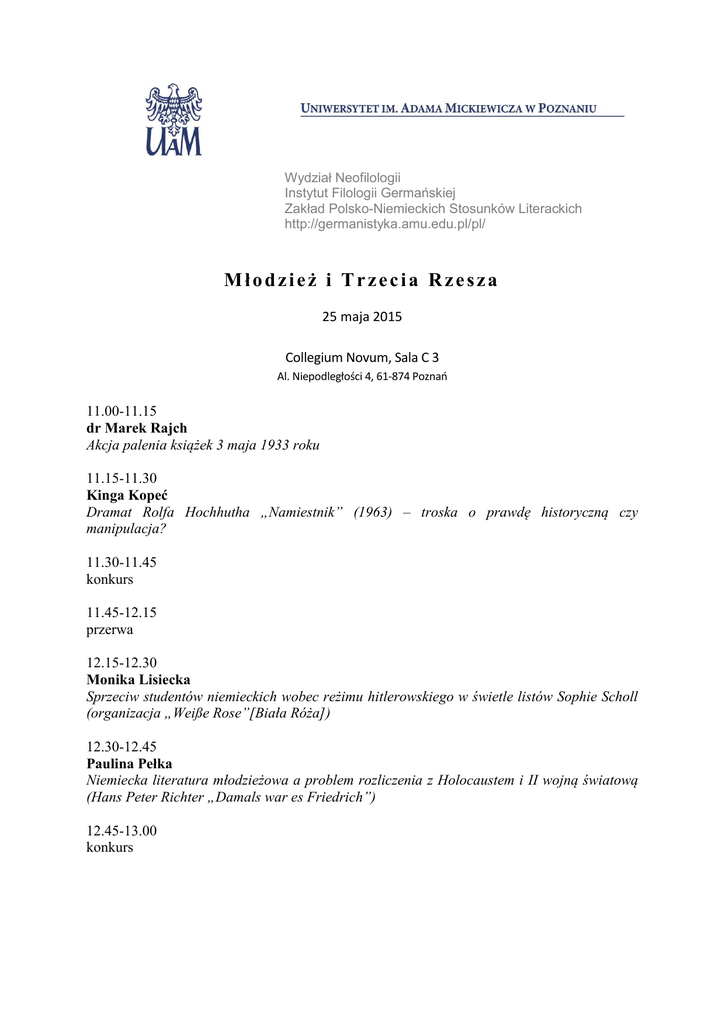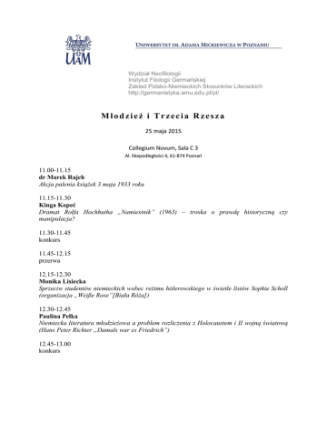 Wydział Neofilologii Instytut Filologii Germańskiej Zakład Polsko-Niemieckich Stosunków Literackich http://germanistyka.amu.edu.pl/pl/ Młodzież i Trzecia Rzesza 25 maja 2015 Collegium Novum, Sala C 3 Al. Niepodległości 4, 61-874 Poznań 11.00-11.15 dr Marek Rajch Akcja palenia książek 3 maja 1933 roku 11.15-11.30 Kinga Kopeć Dramat Rolfa Hochhutha „Namiestnik” (1963) – troska o prawdę historyczną czy manipulacja? 11.30-11.45 konkurs 11.45-12.15 przerwa 12.15-12.30 Monika Lisiecka Sprzeciw studentów niemieckich wobec reżimu hitlerowskiego w świetle listów Sophie Scholl (organizacja „Weiße Rose”[Biała Róża]) 12.30-12.45 Paulina Pełka Niemiecka literatura młodzieżowa a problem rozliczenia z Holocaustem i II wojną światową (Hans Peter Richter „Damals war es Friedrich”) 12.45-13.00 konkurs