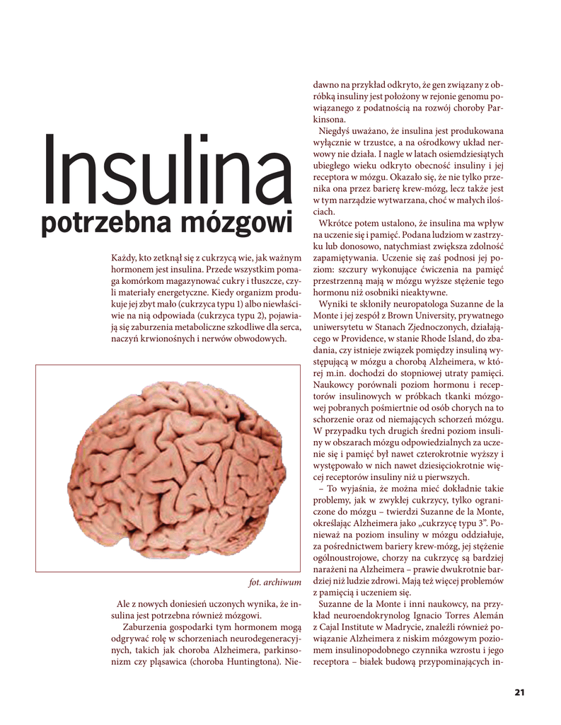 Insulina potrzebna mózgowi Każdy, kto zetknął się z cukrzycą wie, jak ważnym hormonem jest insulina. Przede wszystkim pomaga komórkom magazynować cukry i tłuszcze, czyli materiały energetyczne. Kiedy organizm produkuje jej zbyt mało (cukrzyca typu 1) albo niewłaściwie na nią odpowiada (cukrzyca typu 2), pojawiają się zaburzenia metaboliczne szkodliwe dla serca, naczyń krwionośnych i nerwów obwodowych. fot. archiwum Ale z nowych doniesień uczonych wynika, że insulina jest potrzebna również mózgowi. Zaburzenia gospodarki tym hormonem mogą odgrywać rolę w schorzeniach neurodegeneracyjnych, takich jak choroba Alzheimera, parkinsonizm czy pląsawica (choroba Huntingtona). Nie- dawno na przykład odkryto, że gen związany z obróbką insuliny jest położony w rejonie genomu powiązanego z podatnością na rozwój choroby Parkinsona. Niegdyś uważano, że insulina jest produkowana wyłącznie w trzustce, a na ośrodkowy układ nerwowy nie działa. I nagle w latach osiemdziesiątych ubiegłego wieku odkryto obecność insuliny i jej receptora w mózgu. Okazało się, że nie tylko przenika ona przez barierę krew-mózg, lecz także jest w tym narządzie wytwarzana, choć w małych ilościach. Wkrótce potem ustalono, że insulina ma wpływ na uczenie się i pamięć. Podana ludziom w zastrzyku lub donosowo, natychmiast zwiększa zdolność zapamiętywania. Uczenie się zaś podnosi jej poziom: szczury wykonujące ćwiczenia na pamięć przestrzenną mają w mózgu wyższe stężenie tego hormonu niż osobniki nieaktywne. Wyniki te skłoniły neuropatologa Suzanne de la Monte i jej zespół z Brown University, prywatnego uniwersytetu w Stanach Zjednoczonych, działającego w Providence, w stanie Rhode Island, do zbadania, czy istnieje związek pomiędzy insuliną występującą w mózgu a chorobą Alzheimera, w której m.in. dochodzi do stopniowej utraty pamięci. Naukowcy porównali poziom hormonu i receptorów insulinowych w próbkach tkanki mózgowej pobranych pośmiertnie od osób chorych na to schorzenie oraz od niemających schorzeń mózgu. W przypadku tych drugich średni poziom insuliny w obszarach mózgu odpowiedzialnych za uczenie się i pamięć był nawet czterokrotnie wyższy i występowało w nich nawet dziesięciokrotnie więcej receptorów insuliny niż u pierwszych. – To wyjaśnia, że można mieć dokładnie takie problemy, jak w zwykłej cukrzycy, tylko ograniczone do mózgu – twierdzi Suzanne de la Monte, określając Alzheimera jako „cukrzycę typu 3”. Ponieważ na poziom insuliny w mózgu oddziałuje, za pośrednictwem bariery krew-mózg, jej stężenie ogólnoustrojowe, chorzy na cukrzycę są bardziej narażeni na Alzheimera – prawie dwukrotnie bardziej niż ludzie zdrowi. Mają też więcej problemów z pamięcią i uczeniem się. Suzanne de la Monte i inni naukowcy, na przykład neuroendokrynolog Ignacio Torres Alemán z Cajal Institute w Madrycie, znaleźli również powiązanie Alzheimera z niskim mózgowym poziomem insulinopodobnego czynnika wzrostu i jego receptora – białek budową przypominających in21 sulinę i jej receptor. „Zasugerowaliśmy, że choroba Alzheimera wynika z głębokiego niedoboru IGF1(czynnik wzrostu) w mózgu” – mówi Torres Alemán. Niektóre nowe badania wiążą również insulinę i IGF1 z chorobami Parkinsona i Huntingtona. Wśród cierpiących na tę drugą chorobę, cukrzyca występuje siedmiokrotnie częściej niż w zwykłej populacji, a spośród chorych na parkinsonizm co najmniej połowa ma zaburzenia metabolizmu glukozy. Najważniejszym pytaniem pozostaje, w jaki sposób niedobór insuliny i IGF1 może szkodzić mózgowi. To podstawowa sprawa, której poświęcamy najwięcej wysiłku i czasu – mówi de la Monte. Niektórzy badacze sądzą, że insulina związana jest z produkcją złogów białkowych obecnych w mózgach pacjentów cierpiących na Alzheimera i parkinsonizm. Chociaż jak dotąd nie znamy szczegółów, tylko nieliczni specjaliści powątpiewają w znaczenie in- suliny i IGF1 w chorobach neurodegeneracyjnych. Trwają poszukiwania terapii przywracającej normalne działanie insuliny, w nadziei, że pozwoli to opóźnić lub wyhamować, a może nawet zatrzymać neurodegenerację, czyli po prostu powolne otępienie i zanik możliwości samodzielnego radzenia sobie z problemami codzienności. Wykazano na przykład, że związki wzmacniające odpowiedź mózgu i innych narządów na insulinę opóźniają zanik funkcji poznawczych we wczesnych etapach choroby Alzheimera. Naukowcy uważają, że znaleźli wreszcie kierunek, w którym należy podążać, prowadząc badania nad znaczeniem i źródłami insuliny nie tylko w walce z cukrzycą, ale także chorobami lęgnącymi się w mózgu, które stopniowo niszczą więzi człowieka ze światem zewnętrznym i wewnętrznym, pogrążając go w mrokach nieświadomości i wegetacji. Opr. Janusz Niczyporowicz Tłuste jedzenie może osłabiać pamięć Niezdrowy posiłek może pogarszać pamięć u starszych osób z cukrzycą typu 2 – informuje pismo „Nutrition Research”. Jak wykazali naukowcy z University of Toronto, chorzy na cukrzycę typu 2, którzy spożywają wysokotłuszczowe posiłki mogą tuż po nich mieć problemy z pamięcią. Cukrzyca wiąże się z przewlekłym stresem oksydacyjnym – czyli występowaniem dużych ilości szkodliwych, wolnych rodników w organizmie. Po niezdrowym posiłku ich poziom jeszcze się podnosi, co – między innymi – zaburza zachodzące w mózgu procesy pamięciowe. Niekorzystnym skutkom tłustych posiłków mogą zapobiegać przeciwutleniacze, na przykład witaminy C i E, jednak najlepszą obroną przed takimi problemami jest zdrowa, bogata 22 w warzywa i owoce dieta, regularna aktywność fizyczna i zaangażowanie w życie społeczne – zaznaczają autorzy badań. Artykuł pochodzi z serwisu Moja Cukrzyca i jest dostępny pod adresem: http://www.cukrzyca.akcjasos.pl