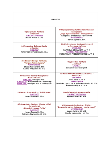 2011/2012 Ogólnopolski Konkurs Olimpusek II MIEJSCE w Polsce Michał Waluś kl. II c IV Międzyszkolny Multimedialny Konkurs Ekologiczny „Mogę żyć oszczędnie i ekologicznie!” kategoria: prezentacja PowerPoint WYRÓŻNIENIE Bartek Dynia kl. III C I Mistrzostwa Dolnego Śląska w Sudoku I MIEJSCE PATRYCJA SZYMAŃSKA kl. VI A VI Międzyszkolny Konkurs Recytacji w Języku Angielskim III MIEJSCE PATRYCJA SZYMAŃSKA kl. VI A NAGRODA PUBLICZNOŚCI PRZEMYSŁAW PAŹDZIERKIEWICZ kl. VI C Międzynarodowego Konkursu "Kangur Matematyczny" WYRÓŻNIENIE Błażej Konwent kl. III C Kamila Krzysztoń kl. III C Wojewódzki Konkurs „Sudoku” LAUREAT Sławomir Kasenberg III C Wrocławski Turniej Koszykówki "BASKETMANIA" I MIEJSCE - drużyna klas I II MIEJSCE - drużyna klas IV - dziewcząt III MIEJSCE - drużyna klas IV - chłopców XI WOJEWÓDZKIE BIENNALE GRAFIKI I MINIATURY NAGRODA Julia Janas kl. IV A WYRÓŻNIENIE Dominika Ląd kl. IV A Julia Markiewicz kl. IV A Kornelia Wójcik kl. IV A V Konkurs Przyrodniczy "SUPERSOWA" II MIEJSCE Hanna Turska kl. VI A Turniej Młodych Matematyków LAUREAT III STOPNIA Agrawal Anadi kl. VI A Międzyszkolny Konkurs Wiedzy o Unii Europejskiej „W podróży przez Polskę" II MIEJSCE Hanna Turska kl. VI A Patrycja Szymańska kl. VI A VI Międzyszkolny Konkurs Biblijny "Ewangelia wg św. Mateusza - czy ją znam?" WYRÓŻNIENIE Jason Jarikre- kl. VI B Klaudia Laskowska - kl. V A Szkolny Turniej Czytelniczy dla klas III "ZIMA MUMINKÓW" I MIEJSCE - kl.3 A Mateusz Gawroński, Wiktoria Kubera, Gabriela Murdza II MIEJSCE - kl.3 B Aleksandra Grzybowska, Adrian Lenartowicz, Tomasz Soróbka I MIEJSCE - kl.3 C Aleksandra Koczar, Błażej Konwant, Zofia Thornborrow Szkolny Konkurs Recytatorski kl. 0 -III kategoria klas 0 i I I MIEJSCE - Błażej Szymański kl. 0 B II MIEJSCE - Małgorzata Zioło kl. 1 B III MIEJSCE - Weronika Matyla kl. 1 B kategoria klas II i III I MIEJSCE - Jakub Szygulski kl. 2 B II MIEJSCE - Jessica Jarikre kl. 3 C III MIEJSCE - Marcelina Magierowicz kl. 2 B Wrocławski Konkurs Plastyczny "ETNOPORTRET" NAGRODA JAGODA SYPUŁA kl. V A Wojewódzki Konkurs Plastyczny "CZTERY PORY ROKU" NAGRODA KAMILA SIENIEWICZ kl. VI C Międzyszkolny Konkurs Plastyczny "Zdrowe dzieci nie jedzą śmieci" kategoria: grafika komputerowa I MIEJSCE JAGODA LORETH kl. II C Szkolny Konkurs Recytatorski kl. IV - VI I MIEJSCE DOMINIK MISZTUR kl. IV C II MIEJSCE PATRYCJA SZYMAŃSKA kl. VI A MATEUSZ BARAŃSKI kl. 4 B III MIEJSCE KLAUDIA LASKOWSKA kl. V A KAROLINA ŁUKASIK kl. 5B WYRÓŻNIENIE EMILIA STEĆ kl. IV C ALEKSANDRA DEMBIŃSKA kl. 5 B LAUREAT Ogólnopolskiego Konkursu Matematycznego "Alfik" BŁAŻEJ KONWANT kl. III C 3 MIEJSCE w województwie dolnośląskim 40 MIEJSCE w Polsce Konkurs Radosnych Obchodów Święta Niepodległości Prace zakwalifikowane na wystawę: "Ilustracje do polskich baśni i legend" - grafika komputerowa MACIEJ BARAN kl. III A "Zrób sobie flagę" praca plastyczna MARCEL CIULĘBA kl. V A Szkolny Konkurs Grafiki Komputerowej "Śladami polskich legend" WYRÓŻNIENIE MATEUSZ BARAN kl. III A WYRÓŻNIENIE ŁUKASZ BORSIAK kl. III A WYRÓŻNIENIE OLAF STRĘK kl. III A Szkolny Konkurs Plastyczno-Literacki „Błogosławiony Jan Paweł II - człowiek modlitwy”. I MIEJSCE MAGDALENA STRENT kl. IV A KINGA KLUSKO kl. IV A II MIEJSCE JULIA MARKIEWICZ kl. IV A III MIEJSCE JULIA MARKIEWICZ kl. IV A WYRÓŻNIENIE kategoria: wiersz NATALIA PENAR kl. V B 2010/2011 IV Międzyszkolny Konkurs Plastyczny XI WOJEWÓDZKIE BIENNALE GRAFIKI I RYSUNKU "Bezpiecznie i pewnie z rowerem i na rowerze" WYRÓŻNIENIE kategoria: grafika komputerowa DOMINIKA MAŚLANY kl. VI C II MIEJSCE KAROLINA ŁUKASIK kl. V B JULIA JANAS kl. III A Międzyszkolny Konkurs Wiedzy o Unii Europejskiej „W podróży przez Czechy" III MIEJSCE ALICJA BIENIEK kl. VI B NATALIA WÓJCIK kl. VI B ZUZANNA KLUK kl. VI B XIII Międzyszkolny Konkurs Plastyczny "KWIATY DLA MAMY" III MIEJSCE NAGRODA HANNA ŻARCZYŃSKA kl. VI C MARTYNA IDASIAK kl. VI C DOMINIKA MAŚLANY kl. VI C WYRÓŻNIENIE JULIA SKÓRKA kl. IV A KAMILA DYMKOWSKA kl.V C Międzyszkolny Konkurs ArtystycznoMultimedialny "Pracze Odrzańskie - bogactwo przyrodnicze i kulturowe" kategoria: poster WYRÓŻNIENIE OLIWIA DUSZEŃKO kl. IV A JAGODA SYPUŁA kl. IV A IX EUROPEJSKI PRZEGLĄD SZKÓŁ "PRZEDSIĘBIORCZOŚĆ W SZKOLE" pod patronatem Dolnośląskiego Kuratora Oświaty w kategorii prezentacji multimedialnej WYRÓŻNIENIE JULIA JANAS kl. III A Mistrzostwa Wrocławia TURNIEJ BASKETMANII DZIEWCZĄT KLAS VI I miejsce we Wrocławiu ZAWODY SPORTOWE MINISIATKÓWKA II miejsce we Wrocławiu kl. V - chłopcy Mistrzostwa Wrocławia TURNIEJ BASKETMANII CHŁOPCÓW KLAS III I miejsce we Wrocławiu Konkurs Wiedzy o Lwowie i Kresach Południowo-Wschodnich FINAŁ ALEKSANDRA KALINOWSKA kl. VI A XVII Międzyszkolny Mecz Matematyczny dla uczniów klas V - SP 107 II MIEJSCE ANADI AGRAWAL kl. V A PATRYCJA SZYMAŃSKA kl. V A VIII Internetowy Konkurs Grafiki Komputerowej "Bezpieczna droga do szkoły" II MIEJSCE PAULINA NYCZ - kl. III C Konkurs Plastyczny III Międzyszkolny Konkurs Graficzno-Plastyczny "STWORY MITYCZNE, ISTOTY Z LEGEND, BAŚNI "KOLOROWY ŚWIAT ZDROWIA" ... I SNÓW" kategoria: grafika komputerowa NAGRODA III MIEJSCE KAMILA DYMKOWSKA kl. V C JULIA JANAS kl. III A WYRÓŻNIENIE KACPER BŁASIAK kl. III A ANNA DEJNAK kl. "0" II Ogólnopolski Konkurs Grafiki Komputerowej "PISANKA WIELKANOCNA" pod patronatem Dolnośląskiego Kuratora Oświaty WYRÓŻNIENIE SZYMON GRABEK kl. IV A Międzyszkolny Konkurs Twórczości Prośrodowiskowej "NIECH KAŻDY SIĘ DOWIE JAK DBAĆ O ZDROWIE" pod patronatem Dolnośląskiego Kuratora Oświaty kategoria: prezentacja multimedialna II MIEJSCE zespołowo MARTYNA IDASIAK kl. VI C NATALIA ZAJĄC kl. VI C Ogólnopolski Konkurs "THE BAT KID" II MIEJSCE MARTYNA IDASIAK kl. VI C Finał Konkursu Lingwistycznego "WIEŻA BABEL" III MIEJSCE MARTYNA IDASIAK kl. VI C Międzyszkolny Konkurs Recytacji w Języku Angielskim I MIEJSCE MARIA KULAK - kl.