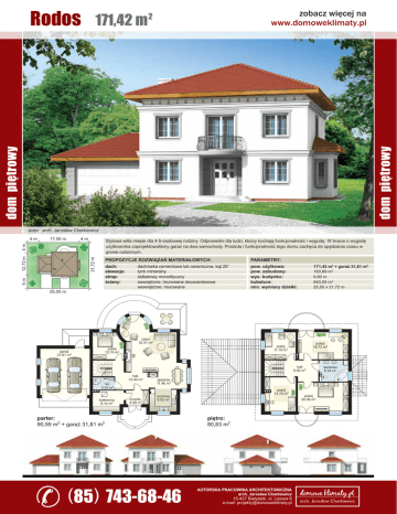 dom piętrowy 171,42 m dom piętrowy Rodos zobacz więcej na www.domoweklimaty.pl 2 autor: arch. Jarosław Charkiewicz 17,55 m 4m Stylowa willa miejsk dla 4-5-osobowej rodziny. Odpowiedni dla ludzi, którzy kochają funkcjonalność i wygodę. W trosce o wygodę użytkownika zaprojektowaliśmy garaż na dwa samochody. Prostota i funkcjonalność tego domu zachęca do spędzania czasu w gronie rodzinnym. 5m 21,72 m 12,72 m 4m 4m PROPOZYCJE ROZWIĄZAŃ MATERIAŁOWYCH: PARAMETRY: dach: elewacje: strop: ściany: pow. użytkowa: pow. zabudowy: wys. budynku: kubatura: min. wymiary działki: 25,55 m dachówka cementowa lub ceramiczna, kąt 25° tynk mineralny żelbetowy monolityczny zewnętrzne: murowane dwuwarstwowe wewnętrzne: murowane salon 32.51 m2 pokój 18.73 m2 pokój 11.19 m2 pokój 10.74 m2 garaż 31.81 m2 171,42 m2 + garaż 31,81 m2 160,89 m2 9,80 m 840,59 m3 25,55 x 21,72 m hall 8.82 m2 wc 3.20 m2 kotłownia 8.14 m2 hall. 12.44 m2 przeds. 4.08 m2 jadalnia 11.46 m2 pokój 13.79 m2 kuchnia 8.02 m2 parter: 90,59 m2 + garaż 31,81 m2 (85) 743-68-46 piętro: 80,83 m2 AUTORSKA PRACOWNIA ARCHITEKTONICZNA arch. Jarosław Charkiewicz 15-427 Białystok, ul. Lipowa 6 e-mail: [email protected] pokój 20.06 m2 łazienka 8.24 m2