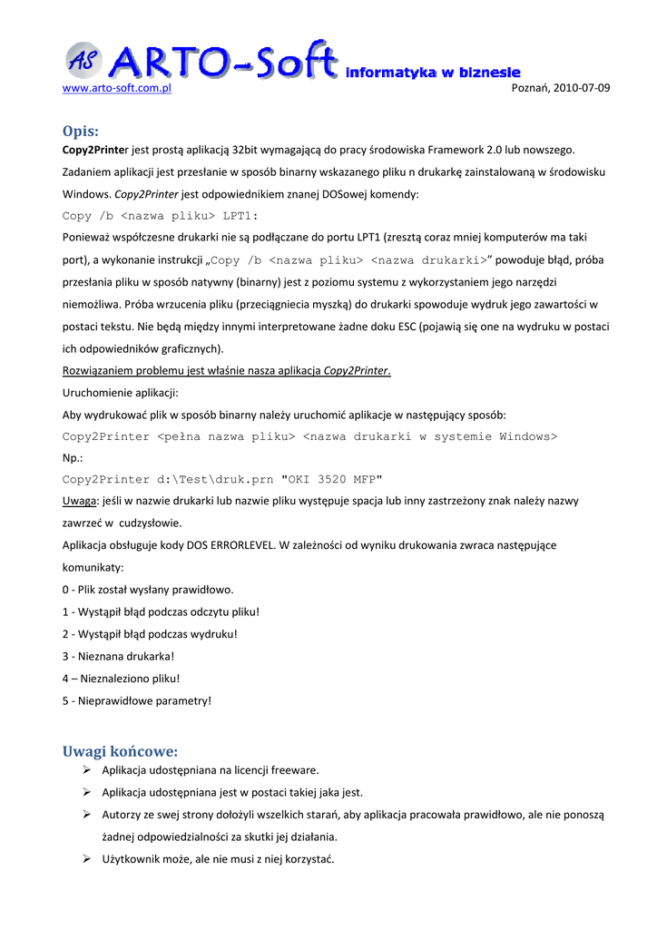 www.arto-soft.com.pl Poznań, 2010-07-09 Opis: Copy2Printerr jest prostą aplikacją 32bit wymagającą do pracy środowiska Framework 2.0 lub nowszego. Zadaniem aplikacji jest przesłanie w sposób binarny wskazanego pliku n drukarkę zainstalowaną w środowisku Windows. Copy2Printer jest est odpowiednikiem odpowie znanej DOSowej komendy: Copy /b <nazwa pliku> LPT1: Ponieważ współczesne drukarki nie są podłączane do portu LPT1 (zresztą coraz mniej komputerów ma taki port), a wykonanie instrukcji „Copy Copy /b <nazwa pliku> <nazwa drukarki>” drukarki> powoduje błąd, próba przesłania pliku w sposób natywny (binarny) jest z poziomu systemu z wykorzystaniem jego narzędzi niemożliwa. Próba wrzucenia pliku (przeciągniecia (p myszką)) do drukarki spowoduje wydruk jego zawartości w postaci tekstu. Nie będą między innymi interpretowane żadne doku ESC (pojawią się one na wydruku w postaci ich odpowiedników graficznych). Rozwiązaniem problemu jest właśnie nasza aplikacja Copy2Printer. Uruchomienie aplikacji: Aby wydrukować plik w sposób binarny należy uruchomić aplikacje w następujący sposób: Copy2Printer Printer <pełna nazwa pliku> <nazwa drukarki w systemie systemi Windows> Np.: Copy2Printer d:\Test\druk.prn druk.prn "OKI 3520 MFP" Uwaga: jeśli w nazwie drukarki lub nazwie pliku występuje spacja lub inny zastrzeżony zastrzeżony znak należy nazwy zawrzeć w cudzysłowie. Aplikacja obsługuje kody DOS ERRORLEVEL. ERRORLEVEL W zależności od wyniku drukowania zwraca następujące komunikaty: 0 - Plik został wysłany prawidłowo. 1 - Wystąpił błąd podczas odczytu pliku! 2 - Wystąpił błąd podczas wydruku! 3 - Nieznana drukarka! 4 – Nieznaleziono pliku! 5 - Nieprawidłowe parametry! Uwagi końcowe: Aplikacja udostępniana na licencji freeware. f Aplikacja udostępniana jest w postaci takiej jaka jest. Autorzy ze swej strony dołożyli wszelkich starań, ń, aby aplikacja pracowała prawidłowo, ale nie ponoszą żadnej odpowiedzialności za skutki jej działania. działania Użytkownik może, ale nie musi z niej korzystać.