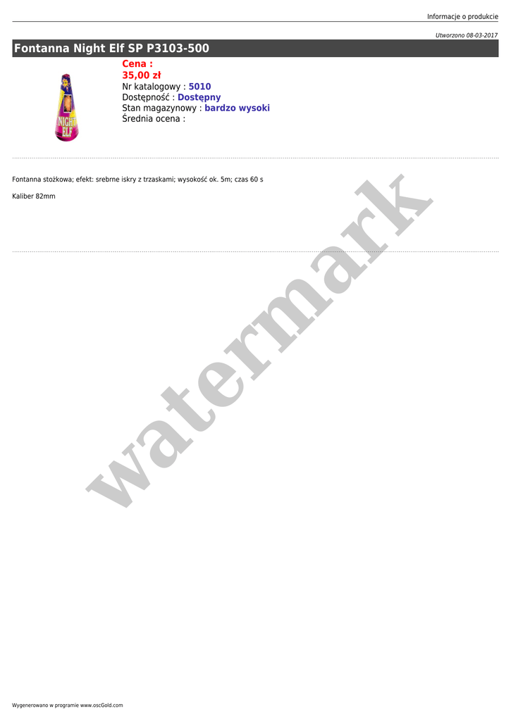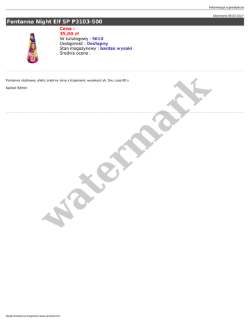 Informacje o produkcie Utworzono 08-03-2017 Fontanna Night Elf SP P3103-500 Cena : 35,00 zł Nr katalogowy : 5010 Dostępność : Dostępny Stan magazynowy : bardzo wysoki Średnia ocena : Fontanna stożkowa; efekt: srebrne iskry z trzaskami; wysokość ok. 5m; czas 60 s w at er m ar k Kaliber 82mm Wygenerowano w programie www.oscGold.com