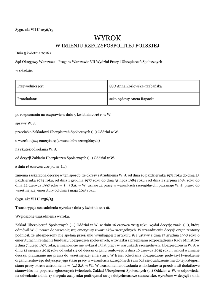 Sygn. akt VII U 1256/15 WYROK W IMIENIU RZECZYPOSPOLITEJ POLSKIEJ Dnia 5 kwietnia 2016 r. Sąd Okręgowy Warszawa - Praga w Warszawie VII Wydział Pracy i Ubezpieczeń Społecznych w składzie: Przewodniczący: SSO Anna Kozłowska-Czabańska Protokolant: sekr. sądowy Aneta Rapacka po rozpoznaniu na rozprawie w dniu 5 kwietnia 2016 r. w W. sprawy W. J. przeciwko Zakładowi Ubezpieczeń Społecznych (...) Oddział w W. o wcześniejszą emeryturę (z warunków szczególnych) na skutek odwołania W. J. od decyzji Zakładu Ubezpieczeń Społecznych (...) Oddział w W. z dnia 16 czerwca 2015r., nr (...) zmienia zaskarżoną decyzję w ten sposób, że okresy zatrudnienia W. J. od dnia 16 października 1971 roku do dnia 23 października 1974 roku, od dnia 1 grudnia 1977 roku do dnia 31 lipca 1984 roku i od dnia 1 sierpnia 1984 roku do dnia 22 czerwca 1997 roku w (...) S.A. w W. uznaje za pracę w warunkach szczególnych, przyznaje W. J. prawo do wcześniejszej emerytury od dnia 1 maja 2015 roku. Sygn. akt VII U 1256/15 Transkrypcja uzasadnienia wyroku z dnia 5 kwietnia 201 6t. Wygłoszone uzasadnienia wyroku. Zakład Ubezpieczeń Społecznych (...) Oddział w W. w dniu 16 czerwca 2015 roku, wydał decyzję znak (...), którą odmówił W. J. prawa do wcześniejszej emerytury z warunków szczególnych. W uzasadnieniu decyzji organ rentowy podniósł, że ubezpieczony nie spełnia przesłanki wynikającej z artykułu 184 ustawy z dnia 17 grudnia 1998 roku o emeryturach i rentach z funduszu ubezpieczeń społecznych, w związku z przepisami rozporządzenia Rady Ministrów z dnia 7 lutego 1973 roku, a mianowicie nie wykazał 15 lat pracy w warunkach szczególnych. Ubezpieczonym W. J. w dniu 12 sierpnia 2015 roku odwołał się od decyzji organu rentowego z dnia 16 czerwca 2015 roku i wniósł o zmianę decyzji, przyznanie mu prawa do wcześniejszej emerytury. W treści odwołania ubezpieczony podważył twierdzenie organu rentowego dotyczące jego stażu pracy w warunkach szczególnych i zwrócił się o zaliczenie mu do tej kategorii stanu pracy okresu zatrudnienia w (...) S.A. w W.. W uzasadnieniu odwołania wnioskodawca przedstawił dodatkowe stanowisko na poparcie zgłoszonych twierdzeń. Zakład Ubezpieczeń Społecznych (...) Oddział w W. w odpowiedzi na odwołanie z dnia 17 sierpnia 2015 roku podtrzymał swoje dotychczasowe stanowisko, wyrażone w decyzji z dnia 16 czerwca 2015 roku i wniósł o oddalenie odwołania na podstawie artykułu 477 ze znaczkiem 14 paragraf 1 Kpc. W treści odpowiedzi na odwołanie organ rentowy wskazał, że [ns 00:06:12.921] postępowaniu administracyjnego przedłożył świadectwo pracy w warunkach szczególnych, wystawione przez (...) Zakłady (...), które jednak [ns 00:06:25.141] nie spełniało wymogów [ns 00:06:28.441] do zaakcentowania wymaga, że do zamknięcia rozprawy w dniu 5 kwietnia 2016 roku, strona odwołująca nie modyfikowała zgłoszonego tu stanowiska i konsekwentnie wnosiła o zmianę spornej decyzji. Natomiast organ rentowy zmodyfikował swoje pierwotne stanowisko i pozostawił rozstrzygnięcie do uznania Sądu. Sąd Okręgowy ustalił następujący stan faktyczny, ubezpieczony W. J. urodzony [? 00:07:02.818] (...) roku, jest, w maju 11 maja 2015 wystąpił do Zakładu Ubezpieczeń Społecznych (...) Oddział w W., z wnioskiem o prawo do wcześniejszej emerytury z tak zwanych [ns 00:07:24.847] Do wniosku ubezpieczony dołączył informacje dotyczące okresów składkowych i nieskładkowych, oraz całą dokumentację dotyczącą wynagrodzenia, jakie w okresie zatrudnienia pobierał. Jeżeli chodzi, złożenie wniosku skutkowało oczywiście wszczęciem przez organ rentowy postępowania wyjaśniającego w toku, którego ZUS ustalił, że ubezpieczony legitymuje się łącznym stażem pracy w wymiarze 30 lat 2miesięcy i 27 dni. Dodatkowo organ rentowy w ramach postępowania administracyjnego nie wziął pod uwagę złożonego przez wnioskodawcę świadectwa wykonywania pracy w szczególnych warunkach w (...) Zakładach (...) głównie wskazując, iż to przedmiotowe świadectwo nie spełnia wymogów rozporządzenia Rady Ministrów z dnia 7 lutego 83 roku. Na podstawie powyższych ustaleń organ rentowy w dniu 16 czerwca 2015 roku, wydał decyzję znak (...), który odmówił wnioskodawcy prawa do wcześniejszej emerytury z warunków szczególnych. Od decyzji z dnia 16 czerwca 2015 roku numer (...) W. J. odwołał się, co skutkowano zainicjowaniem postępowania sądowego, w toku, którego w zakresie robienia tego odwołania ustalono, że ubezpieczony od dnia 1 września 1968 roku do dnia 30 września 1997 roku, roku był zatrudniony w (...) S.A. w W., w wymiarze pełnego etatu na stanowisku kresera tworzyw i operatora wtryskarki. Takie stanowiska zostały wpisane w świadectwie pracy w warunkach szczególnych. Praca zdaniem Sądu mając na uwadze, że treści zeznań, które zostały złożone przed Sądem, ponieważ Sąd przesłuchał go w charakterze strony nie, Sąd nie przesłuchiwał żadnych w tym postępowaniu sądowym żadnych świadków, ponieważ świadkowie nie zostali przez wnioskodawcę, wnioskodawcę zgłoszeni, stwierdził pan wnioskodawca, że nie ma możliwości z nimi się skontaktowania i to są ludzie, którzy w dużej mierze już nie żyją. Praca wykonywana przez wnioskodawcę od dnia 13 października 71 roku, do dnia 22 czerwca 1997 roku była zdaniem Sądu wykonywana w warunkach szczególnych. Ten stan faktyczny Sąd ustalił na podstawie materiału dowodowego z akt sprawy, z akt elementarnych, dowodu z przesłuchania ubezpieczonego w charakterze strony, i też na podstawie akt osobowych ubezpieczonego i dowodu z opinii biegłego sądowego z zakresu BHP powołanego w sprawie. Dowodów w zakresie, w jakim Sąd [ns 00:11:44.576] swoje ustalenia są spójne, logiczne i wzajemnie się uzupełniają. Sąd za bezsporny uznał materiał dowodowy, dotyczące warunki stażu pracy ubezpieczonego w tym niesporny był materiał d