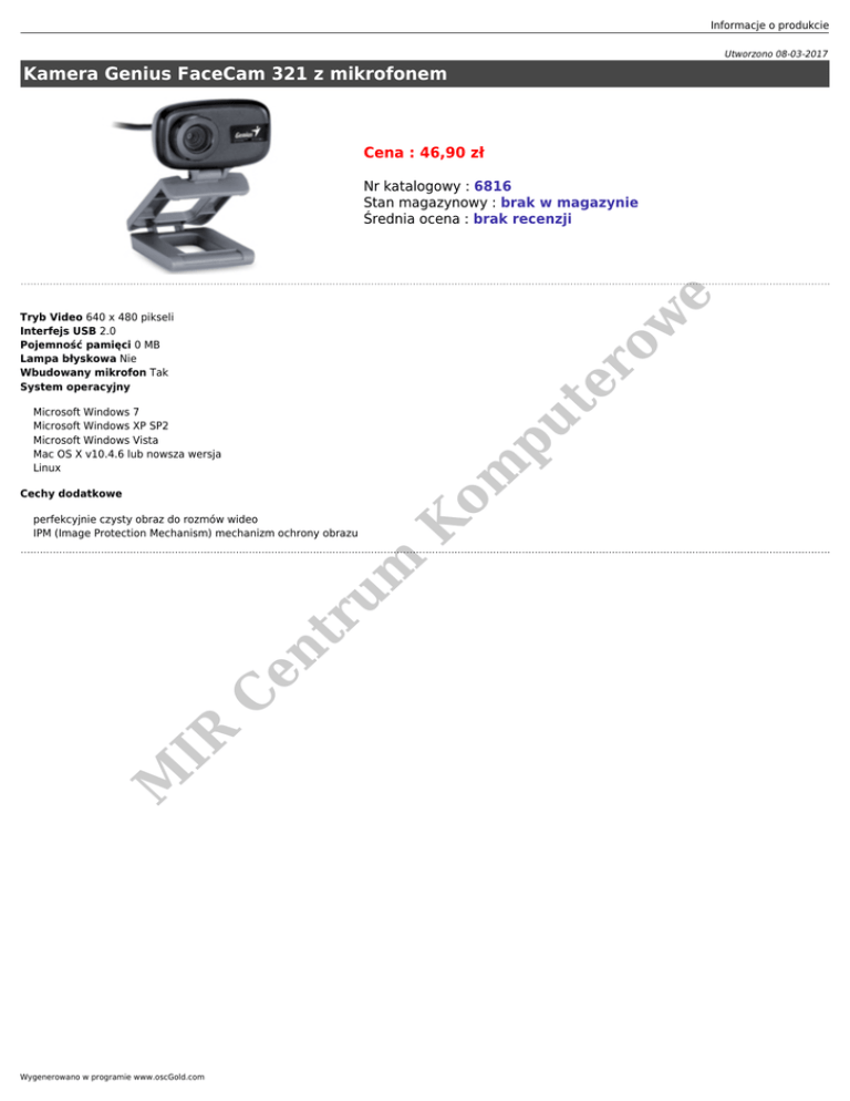Informacje o produkcie Utworzono 08-03-2017 Kamera Genius FaceCam 321 z mikrofonem Cena : 46,90 zł e Nr katalogowy : 6816 Stan magazynowy : brak w magazynie Średnia ocena : brak recenzji om pu te r ow Tryb Video 640 x 480 pikseli Interfejs USB 2.0 Pojemność pamięci 0 MB Lampa błyskowa Nie Wbudowany mikrofon Tak System operacyjny Microsoft Windows 7 Microsoft Windows XP SP2 Microsoft Windows Vista Mac OS X v10.4.6 lub nowsza wersja Linux M IR C en tr um perfekcyjnie czysty obraz do rozmów wideo IPM (Image Protection Mechanism) mechanizm ochrony obrazu K Cechy dodatkowe Wygenerowano w programie www.oscGold.com