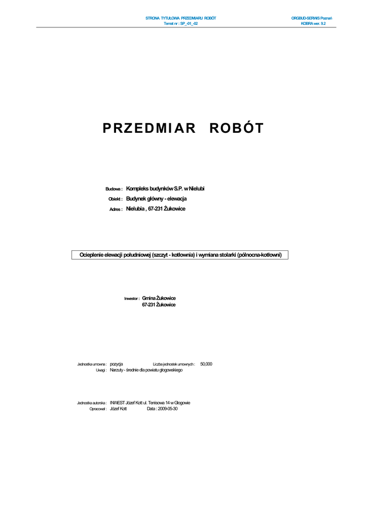 STRONA TYTUŁOWA PRZEDMIARU ROBÓT Temat nr : SP_-01_-02 P RZ EDMI AR Budowa : ROBÓT Kompleks budynków S.P. w Nielubi Obiekt : Budynek główny - elewacja Adres : Nielubia , 67-231 śukowice Ocieplenie elewacji południowej (szczyt - kotłownia) i wymiana stolarki (pólnocna-kotłowni) Inwestor : Jednostka umowna : pozycja Gmina śukowice 67-231 śukowice Liczba jednostek umownych : Uwagi : Narzuty - średnie dla powiatu głogowskiego Jednostka autorska : INWEST Józef Kott ul. Tenisowa 14 w Głogowie Opracował : Józef Kott Data : 2009-05-30 50,000 ORGBUD-SERWIS Poznań KOBRA wer. 9.2 PRZEDMIAR ROBÓT Temat nr : SP_-01_-02 ORGBUD-SERWIS Poznań KOBRA wer. 9.2 Ocieplenie elewacji południowej (szczyt - kotłownia) i wymiana stolarki (pólnocna-kotłowni) Budowa : Kompleks budynków S.P. w Nielubi Obiekt : Budynek główny - elewacja Adres : Nielubia , 67-231 śukowice Data : 2009-06-09 Lp. Podstawa kalkulacji / opis pozycji Str: 1 Ilość Jedn. miary A. Elewacja A.a. Stolarka drzwiowa - wymiana 1. DemontaŜ istniejących drzwi stalowych wraz z ościeŜnicą 1,000 kpl. 2. OścieŜnice stalowe specjalne do drzwi wzmocnionych i przeciwpoŜarowych, malowane na budowie farbą farbą 1,000 szt podkładową i emalią ftalową - typ ościeŜnic: FD10w - Analogia: drzwi dwuskrzydłowe stalowe o wym. 1,7x2,1 3. Drzwi stalowe przeciwpoŜarowe, o powierzchni ponad 2 m2, z osadzeniem i pomalowaniem farbą olejną - 3,570 m2 dwuskrzydłowe, antywłamaniowe, dwa zamki patentowe, zabezpieczone antykorozyjnie, o wym. 1,70x2,10=3,57m2 4. Wykonanie pasów tynków zwykłych kategorii III, pokrywających bruzdy w ścianach,uprzednio zamurowane cegłami 5,900 m lub dachówkami - pasy o szerokości: ponad 15,0 do 30,0 cm, przy uŜyciu ciasta wap., o wym. 2x2,1+1,7=5,9m 5. Malowanie dwukrotne farbami emulsyjnymi starych tynków wewnętrznych: na ścianach, o wym. 5,9x0,4=2,36m2 2,360 m2 PRZEDMIAR ROBÓT Temat nr : SP_-01_-02 ORGBUD-SERWIS Poznań KOBRA wer. 9.2 Ocieplenie elewacji południowej (szczyt - kotłownia) i wymiana stolarki (pólnocna-kotłowni) A. Elewacja A.b. Stolarka okienna Data : 2009-06-09 Lp. Str: 2 Podstawa kalkulacji / opis pozycji Ilość Jedn. miary A.b. Stolarka okienna 6. DemontaŜ okna drewnianego 1,000 szt. 7. Okna z kształtowników z wysokoudarowego PCW, o powierzchni: ponad 0,6 do 1,0 m2, mont.przy uŜyciu łącz.rozpor. - 0,430 m2 profil ciepły, kolor biały, skrzydła otwierane i otwierano-uchylne, szkło k=1,1, układ szkła: 6F/14/4 zew. bezpieczna, o wym. 0,95x0,45=0,43m2 8. Wykonanie pasów tynków zwykłych kategorii III, pokrywających bruzdy w ścianach,uprzednio zamurowane cegłami 2,350 m lub dachówkami - pasy o szerokości: ponad 15,0 do 30,0 cm, przy uŜyciu ciasta wap., o wym. 0,95x2+0,45=2,35m 9. Malowanie dwukrotne farbami emulsyjnymi starych tynków wewnętrznych: na ścianach, o wym. 2,35x0,3=0,7m2 0,700 m2 PRZEDMIAR ROBÓT Temat nr : SP_-01_-02 ORGBUD-SERWIS Poznań KOBRA wer. 9.2 Ocieplenie elewacji południowej (szczyt - kotłownia) i wymiana stolarki (pólnocna-kotłowni) A. Elewacja A.c. Elewacja ocieplenie - szczytu kotłowni Data : 2009-06-09 Lp. Str: 3 Podstawa kalkulacji / opis pozycji Ilość Jedn. miary A.c. Elewacja ocieplenie - szczytu kotłowni 10. Rusztowania zewnętrzne rurowe o wysokości: do 10 m, o wym. 11x10=110m2 11. Odbicie tynków wewnętrznych o powierzchni ponad 5,0 m2 na ścianach, filarach i pilastrach bez względu na rodzaj 1,100 100 m2 10,000 m2 podłoŜa, z ewentualnym usunięciem osiatkowania lub dranic - tynki z zaprawy: cementowo-wapiennej - spękanych tynków 12. Umocowanie siatki tynkarskiej cięto-ciągnionej na: ścianach, filarach, pilastrach, o wym. 52,50x10,8 10,000 m2 13. Wypełnienie zaprawą cementową oczek siatki ciętociągnionej, umocowanej na ścianach i stropach, 10,000 m2 14. Osłony okien: folią polietylenową, 0,430 m2 15. Spadki pod obróbki blacharskie z zaprawy - pod podokienniki, o wym. 0,45x0,15=0,07m2 0,070 m2 16. Wymiana: okapników blaszanych - podokienników z bl. ocynk. powlekanej kol. popielaty, z kapinosem o wym. 0,5x 1,000 szt 0,35m 17. Wymiana pokrycia murów ogniowych, pasów pod i nadrynnowych, wyskoków i pasów elewacyjnych oraz gzymsów i 4,940 m2 krawędzi balkonowych, z blachy: ocynkowanej 0,55mm - mury ogniowe pogrubiowne o ocieplenie i kapinos , o wym. 9,5x(0,3+0,12+0,05+0,05)=4,94m2 18. Izolacje cieplne i przeciwdźwiękowe poziome z płyt pilśniowych porowatych, układane: na sucho, jedna warstwa - 3,990 m2 wzmocnienie pod ibróbke blacharska z płyt wiórowe typ OSB -3 grubości 18mm, o wym. 9,5x(0,3+0,12)=3,99m2 19. Docieplenie ścian pełnych z otworami, płytami styropianowymi EPS 70-040 grub. 10cm z przyklejeniem styropianu i 100,500 m2 jednej warstwy siatki oraz pokrycie wyprawami elewacyjnymi powierzchni: z fakturą grysową , o wym. 11x9,58=105,38m2 - okno (0,95*0,45*1) - drzwi (1,70*2,10) - czopuch zew. (1,20*0,9) = 100,50m2 20. Docieplenie ścian pełnych z otworami, płytami styropianowymi EPS 70-040, grub. 8cm z przyklejeniem styropianu i 7,960 m2 jednej warstwy siatki oraz pokrycie wyprawami elewacyjnymi mozaikowe Cerasit 77, powierzchni: z fakturą grysową cokół , o wym. (10,40-1,25pochylnia) x 0,87m2 =7,96 21. Docieplenie ościeŜy płytami styropianowymi EPS grub. 4cm z przyklejeniem styropianu i jednej warstwy siatki oraz 1,310 m2 pokrycie wyprawami elewacyjnymi - otwory okienne i drzwiowe, o wym. (0,45+2*0,95)+ (1,7+2x21) = 6,55*0,20 = 1,31m2 22. Docieplenie ościeŜy - przyklejenie jednej warstwy siatki i pokrycie wyprawami elewacyjnymi - dodatkowo na parterze, o 9,800 m2 wym. 2x(9,5-1,7)=9,80m2m2 23. Docieplenie ościeŜy płytami styropianowymi z przyklejeniem styropianu i jednej warstwy siatki oraz pokrycie wyprawami 30,150 m2 elewacyjnymi - nakładki gr. 3cm pod kolorystkę elewacji, o wym. 100,50x30%=30,15m2 24. Ochrona naroŜników wypukłych na styropianie z dodatkowym wzmocnieniem jedną warstwą siatki /przy uŜyciu 26,850 m kątownika walcowanego rów