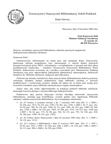 Towarzystwo Nauczycieli Bibliotekarzy Szkół Polskich Rada Główna __________________________________________ Warszawa, dnia 19 kwietnia 2008 roku Pani Katarzyna Hall Minister Edukacji Narodowej Al. Szucha 25, 00-918 Warszawa Dotyczy: postulatów nauczycieli bibliotekarzy odnośnie prawnych uregulowań funkcjonowania bibliotek szkolnych. Szanowna Pani! Zainteresowani informacjami na temat prac nad zmianami Karty Nauczyciela, planowaną reformą programową oraz innowacjami w innych aktach prawnych przygotowywanymi przez MEN, wnioskujemy o uwzględnienie w pracach nad nimi głosu przedstawicieli środowiska – członków Towarzystwa Nauczycieli Bibliotekarzy Szkół Polskich. Jednocześnie zwracamy się z prośbą o powołanie przy Ministerstwie Edukacji Narodowej oraz przy odpowiednich jednostkach administracji samorządowej, fachowych doradców ds. bibliotek szkolnych, znających specyfikę pracy. Nieliczni już doradcy metodyczni służą nauczycielom bibliotekarzom fachową pomocą, wskazując działania służące podniesieniu rangi biblioteki szkolnej w procesie dydaktycznym i wychowaniu uczniów. Jednak ich opinie nie są brane pod uwagę przy tworzeniu warunków pracy bibliotek szkolnych przez organy samorządowe. Zależy nam, aby osoby odpowiedzialne za kondycję polskich bibliotek szkolnych, dostrzegły korzyści płynące z ich prawidłowego funkcjonowania. Podstawowe akty prawne dotyczące oświaty określają stanowisko nauczyciela bibliotekarza, uściślają jego kwalifikacje, wymiar godzin oraz organizację biblioteki szkolnej i zadania nauczyciela bibliotekarza. Są to następujące dokumenty: 1. art. 67 Ustawy o systemie oświaty z dn. 7 września 1991 roku (Dz. U. z 2004 r. Nr 256, poz. 2572, Nr 273, poz. 2703 i Nr 281, poz. 2781, z 2005 r. Nr 17, poz. 141, Nr 94, poz. 788, Nr 122, poz. 1020, Nr 131, poz. 1091, Nr 167, poz. 1400 i Nr 249, poz. 2104, z 2006 r. Nr 144, poz. 1043, Nr 208, poz. 1532 i Nr 227, poz. 1658 oraz z 2007 r. Nr 42, poz. 273, Nr 80, poz. 542, Nr 115, poz. 791, Nr 120, poz. 818, Nr 180, poz. 1280 i Nr 181, poz. 1292) 2. art. 42 Ustawy Karta Nauczyciela z dnia 26 stycznia 1982 roku. (Dz. U. z 2003 r. Nr 118, poz. 1112) 3. art. 22.1 Ustawy o bibliotekach z dnia 27 czerwca 1997 roku (Dz. U. z 1997 r. Nr 85, poz. 539, z 1998 r. Nr 106, poz. 668, z 2001 r. Nr 129, poz. 1440, z 2002 r. Nr 113, poz. 984, z 2004 r. Nr 230, poz.2390) 1 4. Zarządzenie Ministra Edukacji Narodowej z dnia 4 czerwca 1997 r. w sprawie liczby uczniów, na których przysługuje etat nauczyciela bibliotekarza (Dz. U. z 1997 r. Nr 56, poz. 357) 5. § 8 Rozporządzenia Ministra Edukacji Narodowej z dnia 21 maja 2001 r. w sprawie ramowych statutów publicznego przedszkola i publicznych szkół (Dz. U. Nr 61, poz. 624 z 2001 r., z późn. zm.) Aktualne przepisy nie odzwierciedlają współczesnej roli biblioteki w szkole, jej przemian w kierunku wyspecjalizowanej pracowni multimedialnej i centrum edukacyjnego środowiska. Nauczyciel bibliotekarz, zgodnie z Podstawą programową kształcenia ogólnego, nie tylko wspomaga użytkownika biblioteki w poszukiwaniu informacji, ale także kształtuje umiejętność jej wartościowania oraz sposoby wykorzystania. Poniżej przedstawiamy postulaty środowiska nauczycieli bibliotekarzy dotyczące organizacji i pracy bibliotek szkolnych, które winny być uregulowane stosownymi zapisami w wymienionych aktach prawnych. 1. Utrzymanie restrykcyjnego zakazu łączenia bibliotek szkolnych i pedagogicznych z bibliotekami innych typów ze względu na ich różne funkcje i zadania oraz inny profil użytkownika. 2. Ujednolicenie norm zatrudnienia nauczycieli bibliotekarzy z uwzględnieniem zmian wynikłych z reformy oświaty oraz powstania Internetowych Centrów Informacji Multimedialnej w każdej szkole. Przyjęte normy winny uwzględniać specyfikę placówki, tj. liczbę użytkowników, liczbę zbiorów, stopień skomputeryzowania, układ przestrzenny biblioteki, zadania wykonywane na rzecz środowiska itp. 3. Uwzględnienie wymogów eksploatacyjnych Internetowych Centrów Informacji Multimedialnej poprzez zabezpieczenie odpowiedniej liczby godzin dla informatyka, który zapewni nadzór techniczny i będzie odpowiadał za prawidłowe funkcjonowanie ICIM. 4. Zapewnienie bibliotekom szkolnym stałych środków na systematyczne uzupełnianie zbiorów poprzez rozporządzenie zobowiązujące organy samorządowe do wydzielenia procentowej części budżetu oświatowego na ten cel. Pragniemy dodatkowo zwrócić uwagę na inny (negatywny) aspekt pracy nauczyciela bibliotekarza, występujący w wielu placówkach. Dotyczy on poleceń służbowych wykonywania nieodpłatnych zastępstw za nieobecnych nauczycieli przedmiotów. Utrudnia to, czasem wręcz uniemożliwia realizację zadań wynikających z planu pracy biblioteki. Problem ten winien być rozwiązany administracyjnie, ponieważ jest to zjawisko nagminne, a niezgodne z Kodeksem Pracy. Terenowe oddziały TNBSP wypracowały standardy pracy bibliotek szkolnych. Jesteśmy przygotowani do przedstawienia naszych opracowań i podjęcia rozmów na ten temat. Liczymy, iż postulaty naszego środowiska będą brane pod uwagę podczas tworzenia nowych rozwiązań prawnych i odbywać się to będzie z udziałem naszych przedstawicieli, czynnie wykonujących zawód nauczyciela bibliotekarza. Zapobiegnie to formułowaniu przepisów prawnych nieadekwatnych do rzeczywistych wymagań i stanu współczesnego bibliotekarstwa szkolnego. Pragniemy, aby biblioteka szkolna - jedyna w szkole pracownia interdyscyplinarna mogła zgodnie z europejskimi i światowymi tendencjami zaspokajać potrzeby edukacyjne i informacyjne użytkowników oraz rozwijać ich kreatywność. Równolegle należy zapewnić 2 możliwości kształtowania tradycyjnej kultury czytelniczej młodego pokolenia. Takiego wzorca biblioteki zabrakło w projekcie nowej podstawy programowej. Misją współczesnej biblioteki jest zapobieganie analfabetyzmowi funkcjonaln