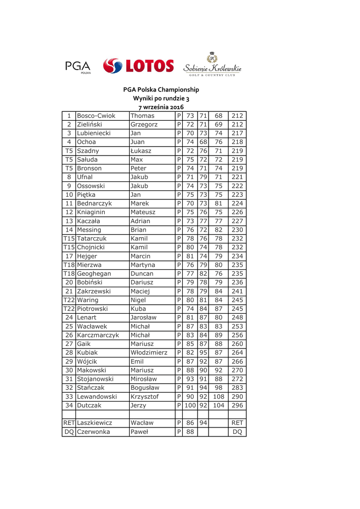 PGA Polska Championship Wyniki po rundzie 3 7 września 2016 1 2 3 4 T5 T5 T5 8 9 10 11 12 13 14 T15 T15 17 T18 T18 20 21 T22 T22 24 25 26 27 28 29 30 31 32 33 34 Bosco-Cwiok Zieliński Lubieniecki Ochoa Szadny Sałuda Bronson Ufnal Ossowski Piętka Bednarczyk Kniaginin Kaczała Messing Tatarczuk Chojnicki Hejger Mierzwa Geoghegan Bobiński Zakrzewski Waring Piotrowski Lenart Wacławek Karczmarczyk Gaik Kubiak Wójcik Makowski Stojanowski Stańczak Lewandowski Dutczak RET Laszkiewicz DQ Czerwonka Thomas Grzegorz Jan Juan Łukasz Max Peter Jakub Jakub Jan Marek Mateusz Adrian Brian Kamil Kamil Marcin Martyna Duncan Dariusz Maciej Nigel Kuba Jarosław Michał Michał Mariusz Włodzimierz Emil Mariusz Mirosław Bogusław Krzysztof Jerzy P P P P P P P P P P P P P P P P P P P P P P P P P P P P P P P P P P 73 72 70 74 72 75 74 71 74 75 70 75 73 76 78 80 81 76 77 79 78 80 74 81 87 83 85 82 87 88 93 91 90 100 71 68 71 69 73 74 68 76 76 71 72 72 71 74 79 71 73 75 73 75 73 81 76 75 77 77 72 82 76 78 74 78 74 79 79 80 82 76 78 79 79 84 81 84 84 87 87 80 83 83 84 89 87 88 95 87 92 87 90 92 91 88 94 98 92 108 92 104 Wacław Paweł P 86 94 P 88 212 212 217 218 219 219 219 221 222 223 224 226 227 230 232 232 234 235 235 236 241 245 245 248 253 256 260 264 266 270 272 283 290 296 RET DQ