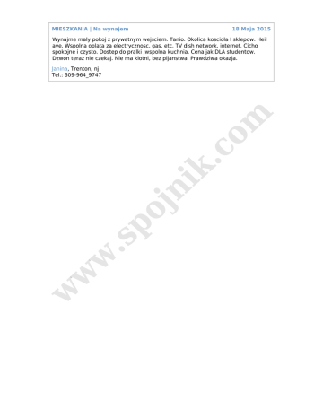 MIESZKANIA | Na wynajem 18 Maja 2015 Wynajme maly pokoj z prywatnym wejsciem. Tanio. Okolica kosciola I sklepow. Heil ave. Wspolna oplata za electrycznosc, gas, etc. TV dish network, internet. Cicho spokojne i czysto. Dostep do pralki ,wspolna kuchnia. Cena jak DLA studentow. Dzwon teraz nie czekaj. Nie ma klotni, bez pijanstwa. Prawdziwa okazja. w w w .s po jn ik .c o m Janina, Trenton, nj Tel.: 609-964_9747
