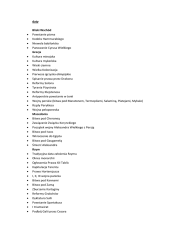 daty Bliski Wschód Powstanie pisma Kodeks Hammurabiego Niewola babilońska Panowanie Cyrusa Wielkiego Grecja Kultura minojska Kultura mykeńska Wieki ciemne Wielka Kolonizacja Pierwsze igrzyska olimpijskie Spisanie prawa przez Drakona Reformy Solona Tyrania Pizystrata Reformy Klejstenesa Antyperskie powstanie w Jonii Wojny perskie (bitwa pod Maratonem, Termopilami, Salaminą, Platejami, Mykale) Rządy Peryklesa Wojna peloponeska Macedonia Bitwa pod Cheroneą Zawiązanie Związku Korynckiego Początek wojny Aleksandra Wielkiego z Persją Bitwa pod Issos Wkroczenie do Egiptu Bitwa pod Gaugamelą Śmierć Aleksandra Rzym Tradycyjna data założenia Rzymu Okres monarchii Ogłoszenia Prawa XII Tablic Kapitulacja Tarentu Prawo Hortensjusza I, II, III wojna punicka Bitwa pod Kannami Bitwa pod Zamą Zburzenie Kartaginy Reformy Grakchów Dyktatura Sulli Powstanie Spartakusa I triumwirat Podbój Galii przez Cezara Wojna domowa Przekroczenie Rubikonu przez Cezara Bitwa pod Farsalos Zabójstwo Cezara II triumwirat Bitwa pod Akcjum Ustanowienie pryncypatu Klęska w Lesie Teutoburskim Pożar Rzymu Wybuch Wezuwiusza Edykt Karakalli Wprowadzenie dominatu Wprowadzenie systemu tetrarchii Edykty Dioklecjana przeciwko chrześcijanom Edykt mediolański Religia chrześcijańska religią państwową Podział cesarstwa Bitwa pod Adrianopolem (śmierć Walensa) Atak Wizygotów na Rzym Atak Wandalów na Rzym Bitwa z Hunami na Polach Katalaunijskich Obalenie Romulusa Augustulusa Odesłanie insygniów do Konstantynopola przez Odoakera