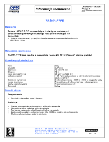 Informacje techniczne Utworzono: 14/02/007 Wersja: 4 Anuluje i zastępuje wszystkie poprzednie wersje TAŚMA PTFE Działanie Taśma 100% P.T.F.E, zapewniająca izolację na metalowych połączeniach gwintowych każdego rodzaju i ułatwiająca ich demontaż: Izolacja obwodów wody gorącej lub zimnej w systemach ogrzewania i sanitarnych (ECFS) do 15 bar. Oznaczenia i zezwolenia TAŚMA PTFE jest zgodna z europejską normą EN 751-3 (Klasa F: cienkie gwinty). Charakterystyka techniczna Kolor Grubość Szerokość Długość Masa powierzchniowa Izolacja połączeń biały 0,075 mm 12 mm i 19 mm 12 m 30 g/m² (gęstość: 0,4) < 3/8 ‘’ przy połączeniach, w których element męski jest stożkowy (ISO 7) Doskonała pomiędzy –260°C a +260°C w przypadku wody Niewrażliwa na środki pomocnicze i mikroorganizmy Nie zmienia smaku wody Łatwy Stabilność wymiarowa Inercja chemiczna Cechy organoleptyczne Demontaż Sposób użycia Przygotowanie Oczyścić połączenia z kurzu i tłuszczu. Instrukcje Owinąć taśmę wokół gwintu męskiego w kierunku skręcania. Nie naciskać silnie na taśmę podczas owijania. Pod koniec nakładania, odciąć i zawinąć taśmę na gwincie. Zastosować naprężenie wstępne między 50 a 150 N.m, zależnie od zastosowania. Możliwe natychmiastowe podanie ciśnienia. GEB S.A. – BP 62062 – Tremblay en France 95972 Roissy Charles de Gaulle Cédex - Francja Tel. (33) 01 48 17 99 99 - Faks (33) 01 48 17 98 00 N °S I R E T 3 5 1 4 1 7 1 7 5 0 0 0 3 8 str: 1 z 1 Przechowywanie Produkt nie podlega degradacji w czasie. Czas przechowywania ponad 10 lat. Uwagi W przypadku gwintów tworzonych ręcznie lub zużytych, lepiej stosować TAŚMA PTFE WYSOKA GĘSTOŚĆ. W przypadku gwintów ponad 3/8’’ zaleca się stosowanie TAŚMA PTFE do dużych średnic. Dane dotyczące bezpieczeństwa są dostępne pod nr. Tel : +48 (22) 630 22 40. Informacje zawarte w niniejszych informacjach technicznych podane są w dobrej wierze i wynikają z pomiarów dokonanych w naszych laboratoriach. Biorąc pod uwagę różnorodność materiałów, różnice jakości i różnorodność metod, zalecamy użytkownikom wykonanie wstępnych prób w rzeczywistych warunkach stosowania. Niniejszy dokument może być modyfikowany bez uprzedzenia w zależności od zmian w produktach lub stanie naszej wiedzy. Zalecamy upewnienie się przed zastosowaniem, że korzystają Państwo z najnowszej wersji. GEB S.A. – BP 62062 – Tremblay en France 95972 Roissy Charles de Gaulle Cédex - Francja Tel. (33) 01 48 17 99 99 - Faks (33) 01 48 17 98 00 N °S I R E T 3 5 1 4 1 7 1 7 5 0 0 0 3 8 str: 2 z 2