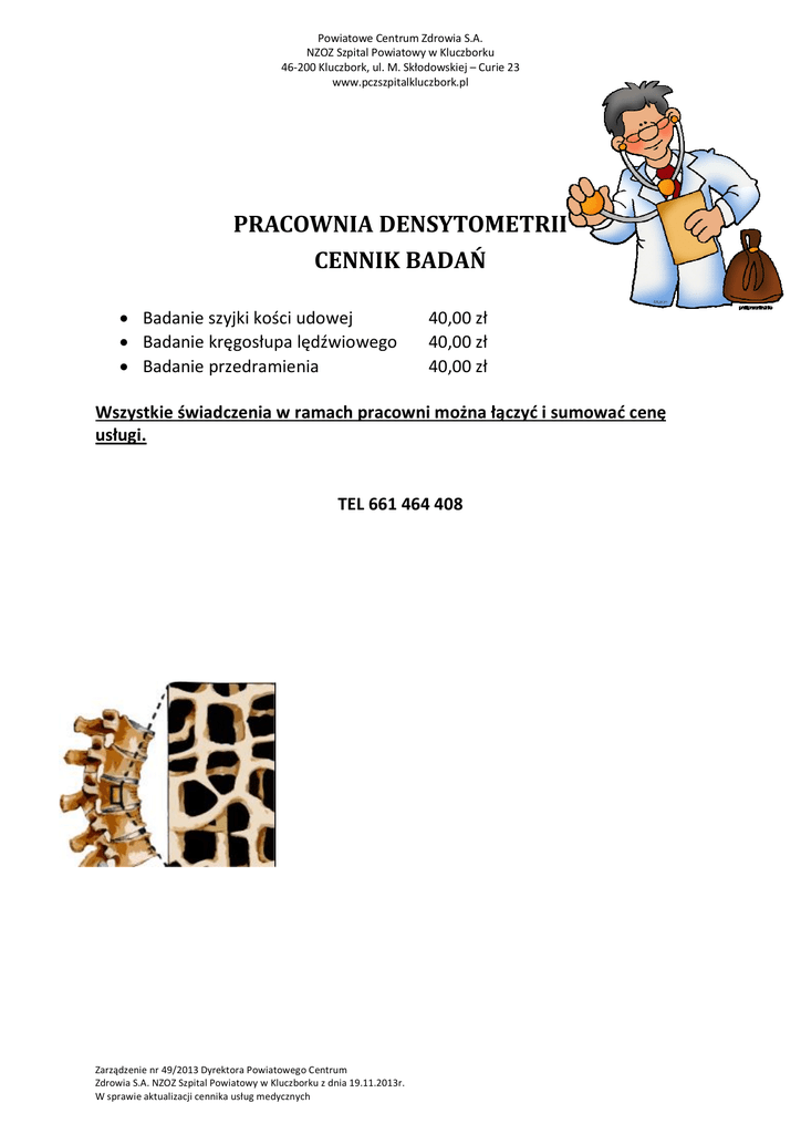 Powiatowe Centrum Zdrowia S.A. NZOZ Szpital Powiatowy w Kluczborku 46-200 Kluczbork, ul. M. Skłodowskiej – Curie 23 www.pczszpitalkluczbork.pl PRACOWNIA DENSYTOMETRII CENNIK BADAŃ  Badanie szyjki kości udowej  Badanie kręgosłupa lędźwiowego  Badanie przedramienia 40,00 zł 40,00 zł 40,00 zł Wszystkie świadczenia w ramach pracowni można łączyć i sumować cenę usługi. TEL 661 464 408 Zarządzenie nr 49/2013 Dyrektora Powiatowego Centrum Zdrowia S.A. NZOZ Szpital Powiatowy w Kluczborku z dnia 19.11.2013r. W sprawie aktualizacji cennika usług medycznych