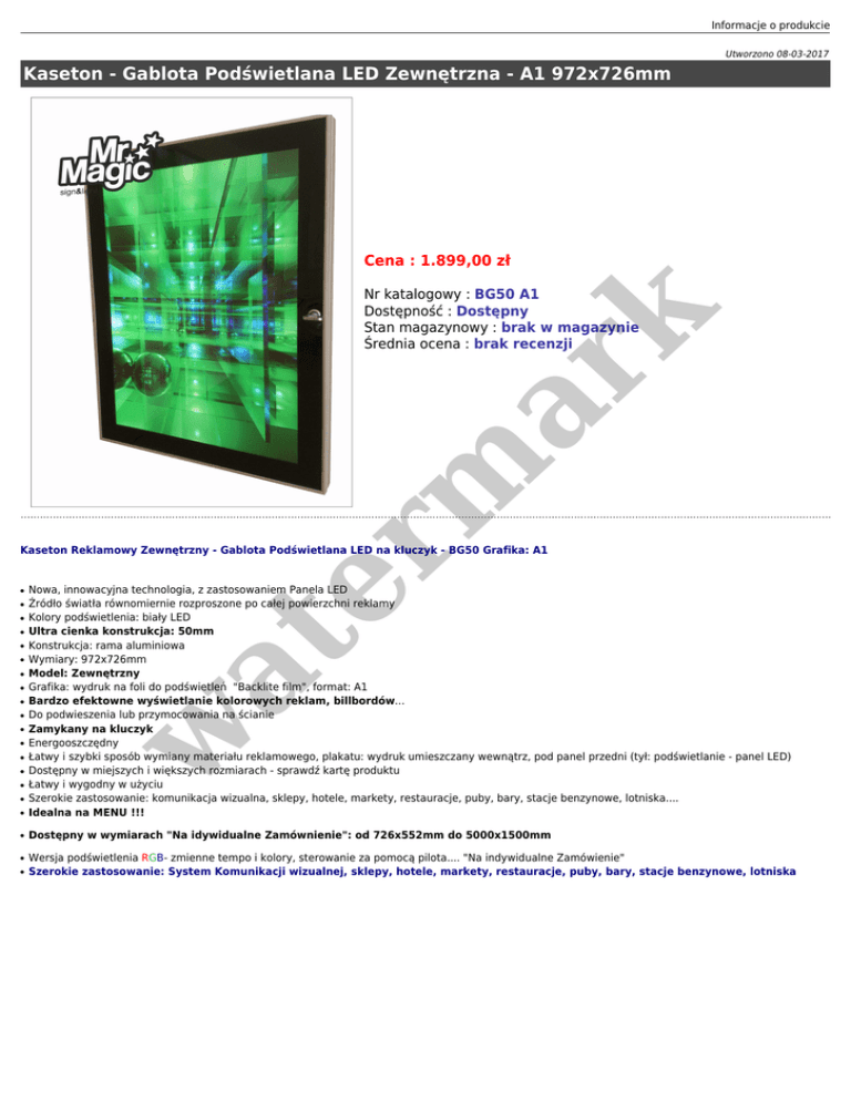 Informacje o produkcie Utworzono 08-03-2017 Kaseton - Gablota Podświetlana LED Zewnętrzna - A1 972x726mm Cena : 1.899,00 zł er m ar k Nr katalogowy : BG50 A1 Dostępność : Dostępny Stan magazynowy : brak w magazynie Średnia ocena : brak recenzji Kaseton Reklamowy Zewnętrzny - Gablota Podświetlana LED na kluczyk - BG50 Grafika: A1 ● ● ● ● ● ● ● ● ● ● ● ● ● ● ● ● ● ● Nowa, innowacyjna technologia, z zastosowaniem Panela LED Źródło światła równomiernie rozproszone po całej powierzchni reklamy Kolory podświetlenia: biały LED Ultra cienka konstrukcja: 50mm Konstrukcja: rama aluminiowa Wymiary: 972x726mm Model: Zewnętrzny Grafika: wydruk na foli do podświetleń "Backlite film", format: A1 Bardzo efektowne wyświetlanie kolorowych reklam, billbordów... Do podwieszenia lub przymocowania na ścianie Zamykany na kluczyk Energooszczędny Łatwy i szybki sposób wymiany materiału reklamowego, plakatu: wydruk umieszczany wewnątrz, pod panel przedni (tył: podświetlanie - panel LED) Dostępny w miejszych i większych rozmiarach - sprawdź kartę produktu Łatwy i wygodny w użyciu Szerokie zastosowanie: komunikacja wizualna, sklepy, hotele, markety, restauracje, puby, bary, stacje benzynowe, lotniska.... Idealna na MENU !!! at ● w ● Dostępny w wymiarach "Na idywidualne Zamównienie": od 726x552mm do 5000x1500mm Wersja podświetlenia RGB- zmienne tempo i kolory, sterowanie za pomocą pilota.... "Na indywidualne Zamówienie" Szerokie zastosowanie: System Komunikacji wizualnej, sklepy, hotele, markety, restauracje, puby, bary, stacje benzynowe, lotniska er m ar k ● Gablota - Ultra cienka konstrukcja: zaledwie 50mm w at Zamykana na kluczyk ● Zastosowanie: wewnątrz i na zewnątrz - Wodoodporny Bardzo efektowne wyświetlanie kolorowych reklam, billbordów... w ● at er m ar k Informacje o produkcie Dane techniczne: er m ar k ----------------------------------------------------------------------------------Rozmiar: 972x726mm ( format grafiki umieszczanej wewnątrz: A1 ) Konstrukcja: rama aluminiowa, panel świetlny LED, płyta przednia: akryl, przewód, zasilacz. Źródło światła: diody LED Temperatura pracy: -10 /+55 stopni C przy wilgotności: 0% - 90% Temperatura przechowywania: -15 /+ 60 stopni C Zasilanie: zasilacz: AC 110-240V/50Hz, napięcie wyjściowe: 12V 2A Grubość: 50 mm Bezpieczeństwo: nie emituje promieniowania Ultrafioletowego Żywotność: min 50.000 godzin Gwarancja: 1 rok Certyfikaty: CE, RoHs Stosowany materiał reklamowy, umieszczany wewnątrz: wydruk na foli Backlit Film at Szukaj załączonej karty produktu............................. w ●