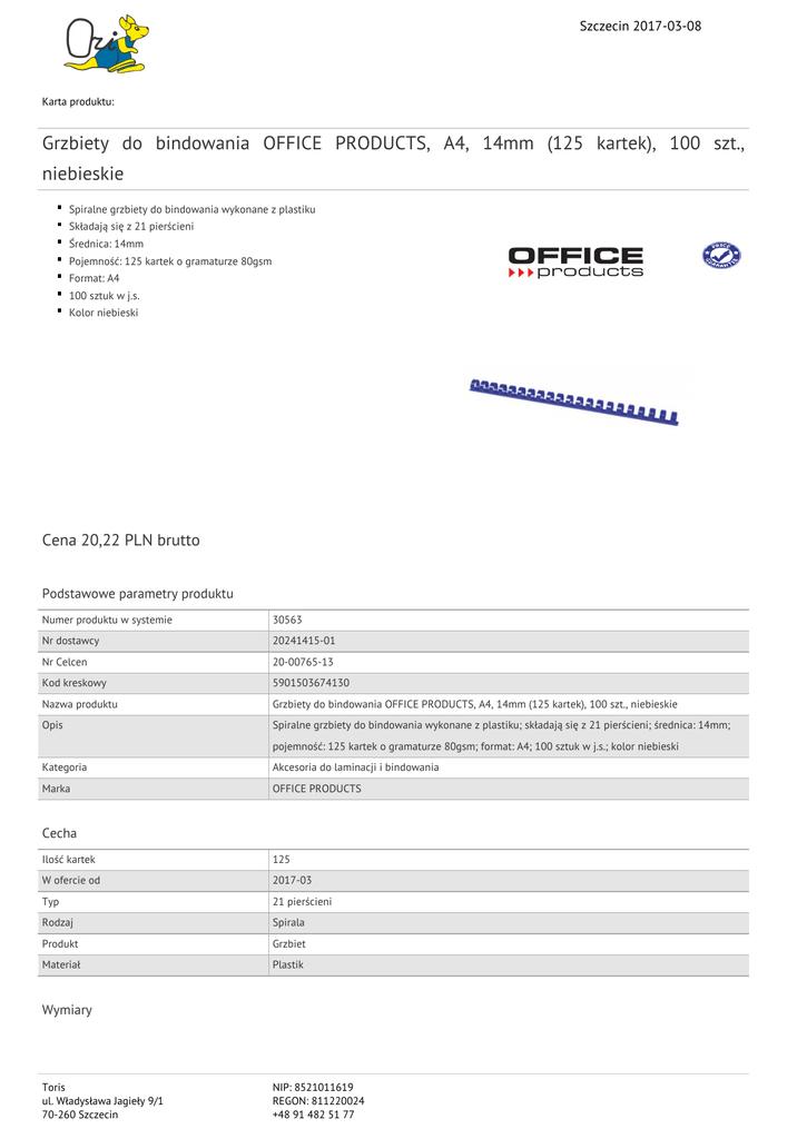 Szczecin 2017-03-08 Karta produktu: Grzbiety do bindowania OFFICE PRODUCTS, A4, 14mm (125 kartek), 100 szt., niebieskie Spiralne grzbiety do bindowania wykonane z plastiku Składają się z 21 pierścieni Średnica: 14mm Pojemność: 125 kartek o gramaturze 80gsm Format: A4 100 sztuk w j.s. Kolor niebieski Cena 20,22 PLN brutto Podstawowe parametry produktu Numer produktu w systemie 30563 Nr dostawcy 20241415-01 Nr Celcen 20-00765-13 Kod kreskowy 5901503674130 Nazwa produktu Grzbiety do bindowania OFFICE PRODUCTS, A4, 14mm (125 kartek), 100 szt., niebieskie Opis Spiralne grzbiety do bindowania wykonane z plastiku; składają się z 21 pierścieni; średnica: 14mm; pojemność: 125 kartek o gramaturze 80gsm; format: A4; 100 sztuk w j.s.; kolor niebieski Kategoria Akcesoria do laminacji i bindowania Marka OFFICE PRODUCTS Cecha Ilość kartek 125 W ofercie od 2017-03 Typ 21 pierścieni Rodzaj Spirala Produkt Grzbiet Materiał Plastik Wymiary Toris ul. Władysława Jagieły 9/1 70-260 Szczecin NIP: 8521011619 REGON: 811220024 +48 91 482 51 77 Szczecin 2017-03-08 Karta katalogowa produktu cd. Grzbiety do bindowania OFFICE PRODUCTS, A4, 14mm (125 kartek), 100 szt., niebieskie Rozmiar 14mm Format A4 Wspólny słownik zamówień CPV 30124000-4 Części i akcesoria do maszyn biurowych Certyfikaty Nowy produkt w ofercie Standard Hit Standard Kolor Kolor Niebieski Pozostałe zdjęcia produktu Serdecznie zapraszamy do współpracy Toris zespół. Toris ul. Władysława Jagieły 9/1 70-260 Szczecin NIP: 8521011619 REGON: 811220024 +48 91 482 51 77