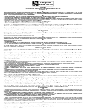 REGULAMIN REGULAMIN PARKINGU PODZIEMNEGO PRZY NARODOWYM FORUM MUZYKI WE WROCŁAWIU I. ZASADY OGÓLNE Art. 1 Zarządcą Parkingu podziemnego przy Narodowym Forum Muzyki we Wrocławiu (zwanego dalej „Parkingiem”) jest Gmina Wrocław – z siedzibą we Wrocławiu pl. Nowy Targ 1/8, 50-141 Wrocław, w imieniu i na rzecz której działają Wrocławskie Inwestycje Sp. z o.o. z siedzibą we Wrocławiu, przy ul. Ofiar Oświęcimskich 36, 50 – 059 Wrocław, wpisana do Krajowego Rejestru Sądowego pod nr KRS 0000285920, prowadzonego przez Sąd Rejonowy dla Wrocławia Fabrycznej, VI Wydział Gospodarczy Krajowego Rejestru Sądowego; („Zarządca Parkingu”). Art. 2 1. Parking jest płatny, niestrzeżony. Parking może być udostępniany nieodpłatnie na oznaczone okresy promocyjne, które wskazuje Zarządca Parkingu, jednakże Parking pozostaje niestrzeżony. 2. Parking przeznaczony jest dla każdej osoby chcącej zaparkować swój pojazd, który odpowiada parametrom wskazanym w art. 5 niniejszego Regulaminu. 3. Każdorazowo poprzez wjazd na teren Parkingu, właściciel lub użytkownik pojazdu wjeżdżającego na Parking („Użytkownik Parkingu”) zawiera z Zarządcą Parkingu umowę o odpłatne (a w okresie promocyjnym - bezpłatne) korzystanie z miejsca parkingowego zlokalizowanego na Parkingu. Umowa, o której mowa w zdaniu poprzedzającym, zawierana jest na czas określony, do chwili uiszczenia opłaty parkingowej i wyjazdu z Parkingu (a w czasie okresu promocyjnego do czasu wyjazdu z Parkingu), z zastrzeżeniem przypadków określonych w niniejszym regulaminie („Regulamin”). 4. Poprzez wjazd na teren Parkingu, Użytkownik Parkingu wyraża zgodę na brzmienie Regulaminu i zobowiązuje się do jego przestrzegania. 5. Regulamin i cennik udostępniane są na terenie Parkingu, jak również na stronie Internetowej www.wroclaw.pl oraz www.wi.wroc.pl Art. 3 Parking jest czynny od 4 września 2015 roku. Godziny funkcjonowania Parkingu są następujące: od Poniedziałek do Niedzieli od 05:30 do 00:00. Zarządca Parkingu może zmienić godziny otwarcia Parkingu. Zmiana ta nie wymaga zmiany Regulaminu oraz opublikowania takiej informacji na stronie internetowej Zarządcy Parkingu lub wywieszenia takiej informacji przy wjeździe na Parking. Art. 4 Wjazd na teren Parkingu odbywa się od Strony ul. Krupniczej (od dnia 01.12.2016 również od strony ul. Kazimierza Wielkiego) przez bramę w tunelu podziemnym oznaczoną jako „wjazd”. Art. 5 Parking przeznaczony jest dla motocykli, pojazdów osobowych, samochodów dostawczych, ciężarowych o dopuszczalnej masie do 3,5 t i wysokości maksymalnej do 2,0 metrów. Wjazd innych pojazdów jest zakazany, chyba że zostanie uprzednio udzielona pisemna zgoda przez Zarządcę Parkingu. II. OPŁATY PARKINGOWE Art. 6 W ramach opłaty parkingowej (a w okresie promocyjnym bez opłaty), Użytkownik Parkingu uprawniony jest do wjazdu na teren Parkingu oraz postoju (parkowania) pojazdu na terenie Parkingu przez czas od wjazdu na Parking do uiszczenia opłaty i wyjazdu z Parkingu, jednak nie dłużej, niż do czasu zamknięcia Parkingu. Art. 7 Opłaty parkingowe zostaną ustalone do końca 2015 roku i opublikowane w Cenniku Opłat. Art. 8 Osoby legitymujące się kartą parkingową dla osoby niepełnosprawnej zobowiązane są przy wjeździe pojazdu na Parking do umieszczenia jej w widocznym miejscu, za przednią szybą pojazdu, w sposób umożliwiający jej skontrolowanie i identyfikację posiadacza karty, z wyłączeniem okresu promocyjnego (tj. bez pobierania opłaty), w którym przedmiotowy wymóg nie obowiązuje. Art. 9 Ustala się następujące zwolnienia z opłat parkingowych: : 1) pojazdów służb ratowniczych; 2) funkcjonariuszy organu powołanego do ochrony bezpieczeństwa publicznego, wykonujących na terenie Narodowego Forum Muzyki czynności służbowe dotyczące zabezpieczenia Imprezy; 3) osób, które uzyskają pisemną zgodę Zarządcy Parkingu i okażą ją do wglądu na wezwanie Zarządcy Parkingu lub innej wskazanej przez niego jednostki, w szczególności powołanej do ochrony obiektu. Art. 10 Czas wynikający z przebywania pojazdu na Parkingu z takich przyczyn jak awaria lub nieprawidłowe funkcjonowanie pojazdu, kontrola policyjna lub przeprowadzona przez inne uprawnione służby, nie jest podstawą do pomniejszenia opłaty o ten czas lub naliczenia opłaty w mniejszej wysokości. III. ZASADY RUCHU I POSTOJU POJAZDÓW Art. 11 Do zasad ruchu pojazdów na terenie Parkingu stosuje się odpowiednio przepisy ustawy z dn. 20 czerwca 1997 r. prawo o ruchu drogowym (j.t. Dz. U. z 2012 r., poz. 1137 z późn. zm.). Na terenie parkingu obowiązuje ograniczenie prędkości do 5 km/h. Art. 12 Pojazdy wolno zatrzymywać i zostawiać tylko na wyznaczonym w tym celu terenie postojowym, z wyjątkiem miejsc zarezerwowanych. W przypadku niezastosowania się do powyższego ustalenia, jak i innych wskazanych w Regulaminie wymagań, Zarządca Parkingu jest upoważniony do odholowania pojazdu lub przestawienia pojazdu, na koszt i ryzyko Użytkownika Parkingu. Art. 13 Pojazd pozostawiony na Parkingu powinien być należycie zabezpieczony przed samoczynnym (mechanicznym) przemieszczeniem, zapaleniem i uszkodzeniem. Zaparkowany samochód powinien mieć również szczelnie zamknięte okna, aby dostęp do wnętrza był niemożliwy. Ryzyko skutków niezabezpieczenia lub nienależytego zabezpieczenia pojazdu ponosi Użytkownik Parkingu. Art. 14 Użytkownicy Parkingu zobowiązani są do przestrzegania wszelkich poleceń obsługi ( w tym ochrony) Parkingu, jak również innych osób uprawnionych przez Zarządcę Parkingu do wydawania poleceń w zakresie organizacji ruchu na terenie Parkingu. Art. 15 Na terenie Parkingu zabronione jest: 1) na miejscach parkingowych, drogach wewnętrznych oraz rampach wjazdowych i wyjazdowych: mycie, odkurzanie pojazdów, wymiana płynów chłodzących, paliwa lub oleju oraz inne podobne czynności. W przypadku awarii pojazdu, fakt ten 