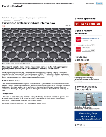 ZALOGUJ SIĘ Dostęp do kilkudziesięciu serwisów informacyjnych już od 90 groszy. Dostęp do Piano jest odpłatny kliknij Polskie Radio » Gospodarka » Informacje » Przyszłość grafenu w rękach internautów Udostępnij Lubię to! Serwis specjalny 0 Przyszłość grafenu w rękach internautów 09.05.2014 Bądź z nami w kontakcie gospodarka.polskieradio.pl Lubię to! 1 268 Obserwuj @Gospodarka_PRSA Polskie Radio YouTube 999+ Fundusze Europejskie Model struktury grafenu, foto: AlexanderAlUS/wikipedia Nie eksperci, lecz głos tłumu wskaże naukowcom kierunek badań nad superwęglem i jego najbardziej prawdopodobne zastosowania informuje "Puls Biznesu". W jakich dziedzinach możliwe jest zastosowanie grafenu? Polacy postanowili "zapytać Kowalskiego". Agencja Rozwoju Przemysłu (ARP), kontrolująca wraz z KGHM TFI spółkę Nano Carbon, wspierającą grafenowe badania, uruchomiła platformę internetową L.E.M. Nano, na której zarejestrowani uczestnicy typują, na jakich rynkach uda się zastosować innowacyjny węgiel. Każdy może mieć pomysł Fundusze europejskie: więcej pieniędzy pod większą kontrolą Na razie większość zarejestrowanych to osoby związane z rynkiem badań dotyczących zastosowania grafenu. Za kilka tygodni planujemy jednak mocniej wypromować platformę, by w typowaniu udział brały także osoby niemające wiedzy o rynku grafenowym tłumaczy Kamil Kulesza, kierownik Centrum Zastosowań Matematyki i Inżynierii Systemów Polskiej Akademii Nauk, które zbudowało platformę dla ARP. Słownik Funduszy Europejskich Trwają badania W Polsce na razie analizujemy możliwość rozwoju technologii i rynkowych zastosowań grafenu, ale w kolejnym etapie będziemy także sprawdzać prawdopodobieństwo rozwoju innych innowacyjnych technologii mówi Zbigniew Mularzuk, prezes Nano Carbon. Przyszłość elektroniki i medycyny. Czy polski grafen podbije świat? Co to jest Jednostka Wdrażania Funduszy Unijnych PIT 2014