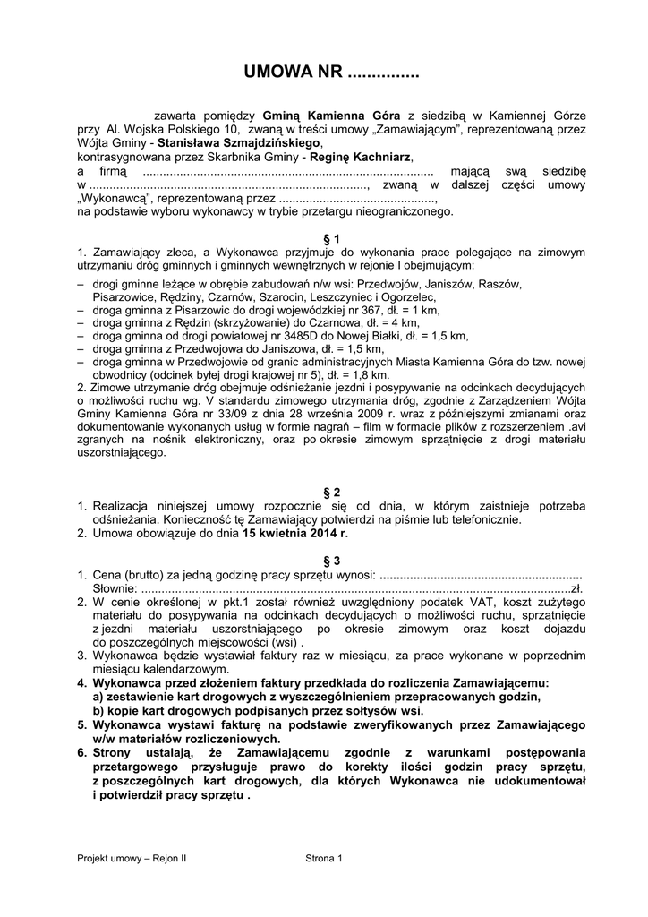 UMOWA NR ............... zawarta pomiędzy Gminą Kamienna Góra z siedzibą w Kamiennej Górze przy Al. Wojska Polskiego 10, zwaną w treści umowy „Zamawiającym”, reprezentowaną przez Wójta Gminy - Stanisława Szmajdzińskiego, kontrasygnowana przez Skarbnika Gminy - Reginę Kachniarz, a firmą ...................................................................................... mającą swą siedzibę w .................................................................................., zwaną w dalszej części umowy „Wykonawcą”, reprezentowaną przez .............................................., na podstawie wyboru wykonawcy w trybie przetargu nieograniczonego. §1 1. Zamawiający zleca, a Wykonawca przyjmuje do wykonania prace polegające na zimowym utrzymaniu dróg gminnych i gminnych wewnętrznych w rejonie I obejmującym: – drogi gminne leżące w obrębie zabudowań n/w wsi: Przedwojów, Janiszów, Raszów, Pisarzowice, Rędziny, Czarnów, Szarocin, Leszczyniec i Ogorzelec, – droga gminna z Pisarzowic do drogi wojewódzkiej nr 367, dł. = 1 km, – droga gminna z Rędzin (skrzyżowanie) do Czarnowa, dł. = 4 km, – droga gminna od drogi powiatowej nr 3485D do Nowej Białki, dł. = 1,5 km, – droga gminna z Przedwojowa do Janiszowa, dł. = 1,5 km, – droga gminna w Przedwojowie od granic administracyjnych Miasta Kamienna Góra do tzw. nowej obwodnicy (odcinek byłej drogi krajowej nr 5), dł. = 1,8 km. 2. Zimowe utrzymanie dróg obejmuje odśnieżanie jezdni i posypywanie na odcinkach decydujących o możliwości ruchu wg. V standardu zimowego utrzymania dróg, zgodnie z Zarządzeniem Wójta Gminy Kamienna Góra nr 33/09 z dnia 28 września 2009 r. wraz z późniejszymi zmianami oraz dokumentowanie wykonanych usług w formie nagrań – film w formacie plików z rozszerzeniem .avi zgranych na nośnik elektroniczny, oraz po okresie zimowym sprzątnięcie z drogi materiału uszorstniającego. §2 1. Realizacja niniejszej umowy rozpocznie się od dnia, w którym zaistnieje potrzeba odśnieżania. Konieczność tę Zamawiający potwierdzi na piśmie lub telefonicznie. 2. Umowa obowiązuje do dnia 15 kwietnia 2014 r. 1. 2. 3. 4. 5. 6. §3 Cena (brutto) za jedną godzinę pracy sprzętu wynosi: ............................................................ Słownie: ...............................................................................................................................zł. W cenie określonej w pkt.1 został również uwzględniony podatek VAT, koszt zużytego materiału do posypywania na odcinkach decydujących o możliwości ruchu, sprzątnięcie z jezdni materiału uszorstniającego po okresie zimowym oraz koszt dojazdu do poszczególnych miejscowości (wsi) . Wykonawca będzie wystawiał faktury raz w miesiącu, za prace wykonane w poprzednim miesiącu kalendarzowym. Wykonawca przed złożeniem faktury przedkłada do rozliczenia Zamawiającemu: a) zestawienie kart drogowych z wyszczególnieniem przepracowanych godzin, b) kopie kart drogowych podpisanych przez sołtysów wsi. Wykonawca wystawi fakturę na podstawie zweryfikowanych przez Zamawiającego w/w materiałów rozliczeniowych. Strony ustalają, że Zamawiającemu zgodnie z warunkami postępowania przetargowego przysługuje prawo do korekty ilości godzin pracy sprzętu, z poszczególnych kart drogowych, dla których Wykonawca nie udokumentował i potwierdził pracy sprzętu . Projekt umowy – Rejon II Strona 1 7. Wykonawca jest obowiązany do posprzątania z jezdni materiału uszortstniającego do końca kwietnia 2014 r. Sprawdzenie wykonania sprzątnięcia materiału uszorstniającego z dróg gminnych zostanie przeprowadzony przez pracowników Urzędu Gminy wraz Wykonawcą. 8. W przypadku nie wykonania prac związanych z posprzątaniem dróg gminnych w określonym terminie, Zamawiającemu przysługuje prawo do zlecenia wykonania zastępczego ze środków zabezpieczenia należytego wykonania umowy. §4 W czasie prowadzenia akcji odśnieżania Wykonawca jest zobowiązany do zapewnienia z nim kontaktu telefonicznego, celem zgłaszania uwag i potrzeb dotyczących wykonywanej usługi. Numer telefonu kontaktowego Wykonawcy: .................................................... §5 Przepracowane godziny muszą być potwierdzone w karcie drogowej przez sołtysa wsi w której prowadzone były prace. W karcie musi być podany dokładny czas rozpoczęcia i zakończenia pracy w danej wsi i tylko taka karta będzie stanowić podstawę do wystawienia faktury. Czas pracy nie może obejmować dojazdu do danej wsi. §6 1. Prace, wymienione w § 1, będą wykonywane według V standardu zimowego utrzymania dróg, który obejmuje odśnieżanie jezdni i posypywanie na odcinkach decydujących o możliwości ruchu, w miejscach zasp odśnieżony będzie co najmniej jeden pas ruchu z wykonaniem mijanek. Dopuszcza się: - śnieg luźny do 16 godz., - zajeżdżony nabój śnieżny i zaspy do 24 godz., - przerwy w komunikacji do 24 godz., - gołoledź pośniegowa oraz gołoledź do 8 godz. 2. Do posypywania jezdni Wykonawca będzie używał środków niechemicznych (piasek o średnicy cząstek od 0,1 do 1 mm i kruszywo naturalne lub sztuczne o uziarnieniu do 4 mm) oraz środków chemicznych zgodnie z Rozporządzeniem Ministra Środowiska z dnia 27 października 2005 r. w sprawie rodzajów i warunków stosowania środków, jakie mogą być używane na drogach publicznych oraz ulicach i placach (Dz.U. z 2005 r., nr 230, poz.1960). 3. Wykonawca będzie rozpoczynał odśnieżanie we wczesnych godzinach rannych, tak aby umożliwić dowóz dzieci do szkół. 4. Odśnieżanie i posypywanie ma być realizowane jedną jednostką sprzętową. Prace realizowane odrębnie dwoma jednostkami - odrębne odśnieżanie i odrębne posypywanie wymaga każdorazowo zgody Zamawiającego. 5. Wykonawca jest zobowiązany do sprzątnięcia z jezdni materiału uszorstniającego po okresie zimowym. §7 Zabezpieczenie należytego wykonan