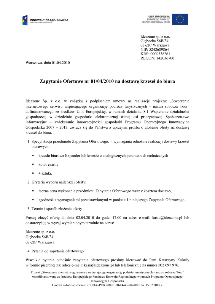 Ideazone sp. z o.o. Głębocka 56B/34 03-287 Warszawa NIP: 5242689864 KRS: 0000338261 REGON: 142036700 Warszawa. dnia 01.04.2010 Zapytanie Ofertowe nr 01/04/2010 na dostawę krzeseł do biura Ideazone Sp. z o.o. w związku z podpisaniem umowy na realizację projektu: „Stworzenie internetowego serwisu wspierającego organizację podróży turystycznych – nazwa robocza Tour” dofinansowanego ze środków Unii Europejskiej, w ramach działania 8.1 Wspieranie działalności gospodarczej w dziedzinie gospodarki elektronicznej ósmej osi priorytetowej Społeczeństwo informacyjne – zwiększanie innowacyjności gospodarki Programu Operacyjnego Innowacyjna Gospodarka 2007 – 2013, zwraca się do Państwa z uprzejmą prośbą o złożenie oferty na dostawę krzeseł do biura. 1. Specyfikacja przedmiotu Zapytania Ofertowego: - wymagania odnośnie realizacji dostawy krzeseł biurowych: krzesło biurowe Expander lub krzesło o analogicznych parametrach technicznych kolor czarny 4 sztuki. 2. Kryteria wyboru najlepszej oferty: łączna cena wykonania przedmiotu Zapytania Ofertowego wraz z kosztem dostawy, zgodność z wymaganiami przedstawionymi w punkcie 1 niniejszego Zapytania Ofertowego. 3. Termin i sposób złożenia oferty Proszę złożyć ofertę do dnia 02.04.2010 do godz. 17.00 na adres e-mail: [email protected] lub dostarczyć ją w wyżej wymienionym terminie na adres: Ideazone sp. z o.o. Głębocka 56B/34 03-287 Warszawa 4. Pytania do zapytania ofertowego Wszelkie pytania odnośnie zapytania ofertowego prosimy kierować do Pani Katarzyny Kukuły w formie pisemnej na: adres e-mail: [email protected] lub telefonicznie na numer 502 697 976. Projekt „Stworzenie internetowego serwisu wspierającego organizację podróży turystycznych – nazwa robocza Tour” współfinansowany ze środków Europejskiego Funduszu Rozwoju Regionalnego w ramach Programu Operacyjnego Innowacyjna Gospodarka Umowa o dofinansowanie nr UDA–POIG.08.01.00-14-436/09-00 z dn. 15.02.2010 r. 5. Zastrzeżenia Ideazone spółka z o.o. zastrzega sobie prawo do modyfikacji lub unieważnienia niniejszego Zapytania Ofertowego w każdym momencie bez podania przyczyny. W szczególności Ideazone spółka z o.o. zastrzega sobie prawo do wydłużenia postępowania dot. wyboru wykonawcy przedmiotu zamówienia o dodatkowe etapy. W przypadku podjęcia jednej z powyższych decyzji, Spółka niezwłocznie poinformuje o niej mailem (na adresy mailowe na które przesłano niniejsze zapytanie ofertowe) wszystkich Oferentów. Płatność zostanie zrealizowana przelewem na podstawie poprawnie wystawionej faktury/faktur przez dostawcę, dostarczonej/ych do Ideazone Sp. z o.o. za pośrednictwem poczty, kuriera lub dostawy osobistej. Nie dopuszcza się realizacji płatności na podstawie faktury pro forma. Zamawiający zastrzega sobie prawo do przesłania pytań od poszczególnych Oferentów wraz z odpowiedziami na złożone pytania do wszystkich Oferentów biorących udział w postępowaniu, bez podania nazw Oferentów, którzy zadali pytania. Z poważaniem, Paweł Chybel Prezes Zarządu Ideazone Sp. z o.o. 2 Zapytanie Ofertowe nr 01/04/2010 na dostawę krzeseł do biura Projekt „Stworzenie internetowego serwisu wspierającego organizację podróży turystycznych – nazwa robocza Tour” współfinansowany ze środków Europejskiego Funduszu Rozwoju Regionalnego w ramach Programu Operacyjnego Innowacyjna Gospodarka Umowa o dofinansowanie nr UDA–POIG.08.01.00-14-436/09-00 z dn. 15.02.2010 r.