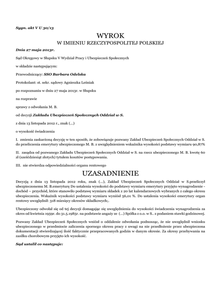 Sygn. akt V U 30/13 WYROK W IMIENIU RZECZYPOSPOLITEJ POLSKIEJ Dnia 27 maja 2013r. Sąd Okręgowy w Słupsku V Wydział Pracy i Ubezpieczeń Społecznych w składzie następującym: Przewodniczący: SSO Barbara Odelska Protokolant: st. sekr. sądowy Agnieszka Leśniak po rozpoznaniu w dniu 27 maja 2013r. w Słupsku na rozprawie sprawy z odwołania M. B. od decyzji Zakładu Ubezpieczeń Społecznych Oddział w S. z dnia 13 listopada 2012 r., znak (...) o wysokość świadczenia I. zmienia zaskarżoną decyzję w ten sposób, że zobowiązuje pozwany Zakład Ubezpieczeń Społecznych Oddział w S. do przeliczenia emerytury ubezpieczonego M. B. z uwzględnieniem wskaźnika wysokości podstawy wymiaru 90,87% II. zasądza od pozwanego Zakładu Ubezpieczeń Społecznych Oddział w S. na rzecz ubezpieczonego M. B. kwotę 60 zł (sześćdziesiąt złotych) tytułem kosztów postępowania. III. nie stwierdza odpowiedzialności organu rentowego UZASADNIENIE Decyzją z dnia 13 listopada 2012 roku, znak (...), Zakład Ubezpieczeń Społecznych Oddział w S.przeliczył ubezpieczonemu M. B.emeryturę Do ustalenia wysokości do podstawy wymiaru emerytury przyjęto wynagrodzenie dochód – przychód, które stanowiło podstawę wymiaru składek z 20 lat kalendarzowych wybranych z całego okresu ubezpieczenia. Wskaźnik wysokości podstawy wymiaru wyniósł 56,01 %. Do ustalenia wysokości emerytury organ rentowy uwzględnił: 318 miesięcy okresów składkowych;. Ubezpieczony odwołał się od tej decyzji domagając się uwzględnienia do wysokości świadczenia wynagrodzenia za okres od kwietnia 1959r. do 31.5.1985r. na podstawie angaży ze (...) Spółka z o.o. w S.. z podaniem stawki godzinowej. Pozwany Zakład Ubezpieczeń Społecznych wniósł o oddalenie odwołania podnosząc, że nie uwzględnił wniosku ubezpieczonego w przedmiocie zaliczenia spornego okresu pracy z uwagi na nie przedłożenie przez ubezpieczona dokumentacji stwierdzającej ilość faktycznie przepracowanych godzin w danym okresie. Za okresy przebywania na zasiłku chorobowym przyjęto ich wysokość. Sąd ustalił co następuje: Decyzja z dnia 25.11.2006r. Zakład Ubezpieczeń Społecznych Oddział w S. przyznał ubezpieczonemu prawo do emerytury od dnia 17.11. 2006 roku tj. od osiągnięcia wieku emerytalnego. Prawo do emerytury zostało zawieszone z uwagi na prawo do więcej niż jednego świadczenia w zbiegu /k-19/ Ubezpieczony wielokrotnie ubiegał się o zmianę wysokości świadczenia przedkładając systematycznie nowe dowody w sprawie. Ostatni wniosek został złożony 8.10.2012r. wraz z dokumentami uzyskanymi ze (...)(...)/k-135 i dalsze nienumerowane/. Pozwany u dokonał przeliczenia świadczenia ale nie w takim zakresie jakiego oczekiwał ubezpieczony. dowód: decyzja z 13.11.2012r. karty nie numerowane/ Ubezpieczony zaskarżył tą decyzję. Do ustalenia podstawy wymiaru emerytury ustalono przeciętną podstawę wymiaru składek na ubezpieczenie społeczne z 20 lar kalendarzowych wybranych z całego okresu ubezpieczenia, a wysokość podstawy wymiaru wyniosła 56.01%. Z dostarczonych przez ubezpieczonego angaży wynikało, że ubezpieczony pracując w (...) w latach 1963 do 31.5.1985r. w 1963r. był wynagradzany wg III grupy natomiast od 1.4.1963 do 1.4.1964 wg V grupy, od 1.9.1966r. posiadał IV grupe ze stawka 8,30 zł/h. Również IV grupę posiadał od 3.11.1966r. VI od 1.10.1972r., VIII od 1.9.1978r. ze stawka 16,50 zł/ h VIII grupa również od 28.5.1979r. IX grupa od 1.1.1983r. w stawce 54,50 zł, VI grupa od 1.10.1984r. – 57 zł. Nadto przebywał na zwolnieniu lekarskim a zachowały się karty zasiłkowe na podstawie których możliwe jest odtworzenie wynagrodzeń. Celem ustalenia wysokości wynagrodzenia uzyskiwanego przez ubezpieczonego w okresie zatrudnienia w (...) w S.dopuszczono dowód z opinii biegłej, która wyliczyła wynagrodzenia: za rok 1964- 19.460,98 złotych za rok 1965- 23.550,44 złotych za rok 1966- 22.362,40 złotych za rok 1967- 21.803,75 złotych za rok 1968- 24.124,47 złotych za rok 1969 – 25.427,33złotych za rok 1970 – 23.197,81 złotych za rok 1971 – 27.107,90 złotych za rok 1972 – 28.469,00 złotych za rok 1973 – 30.634,50 złotych za rok 1974 – 35.167,00 złotych za rok 1975 – 35.319,00 złotych za rok1976 -43.475,53 złotych za rok 1977 – 41.852,72 złotych za rok 1978 – 38.539,50 złotych za rok 1979 – 62.032,00 złotych za rok 1970 – 66.042,00 złotych za rok 1981 – 82.135,00 złotych za rok 1982 – 135.470,00 złotych za rok 1983 – 158.232,00 złotych za rok 1984 – 166.590,00 złotych za rok 1985 – 75.268,00 złotych Dowód: opinia biegłej k– 32 do 46 a.s. Przy uwzględnieniu wynagrodzeń uzyskiwanych w (...)w S.Wskaźnik Wysokości Podstawy Wymiary z 20 najkorzystniejszych lat z okresu zatrudnienia wzrósł do 90.87 %. Dowód: symulacja zmian k -57 Sąd zważył co następuje: Odwołanie ubezpieczonego zasługuje na uwzględnienie. Postępowanie w sprawach emerytalnych jest dwuetapowe. Przed organem rentowym „sprawa emerytalna” ma charakter administracyjnoprawny, a w postępowaniu stosuje się przepisy kodeksu postępowania administracyjnego (art. 180 kpa). Na etapie postępowania odwoławczego sprawa o wysokość świadczenia – uprzednio administracyjna – staje się sprawą cywilną w rozumieniu art.1 kpc. Do jej rozpoznania stosuje się przepisy kodeksu postępowania cywilnego. Zasadniczym celem tego postępowania jest rozstrzygnięcie sprawy po dostatecznym wszechstronnym wyjaśnieniu jej okoliczności spornych. Ubezpieczony jako strona faktycznie słabsza korzysta ze wzmożonej ochrony procesowej, którą gwarantują szczególne przepisy proceduralne dotyczące postępowania w sprawach z zakresu ubezpieczeń społecznych zawarte w dziale III rozdziały 1 i 3 kpc. Nie budzi wątpliwości fakt, że do prawidłowego ustalenia wysokości przysługującej ubezpieczonej emerytury należy stosować przepisy rozdziału 4 ustawy z dni