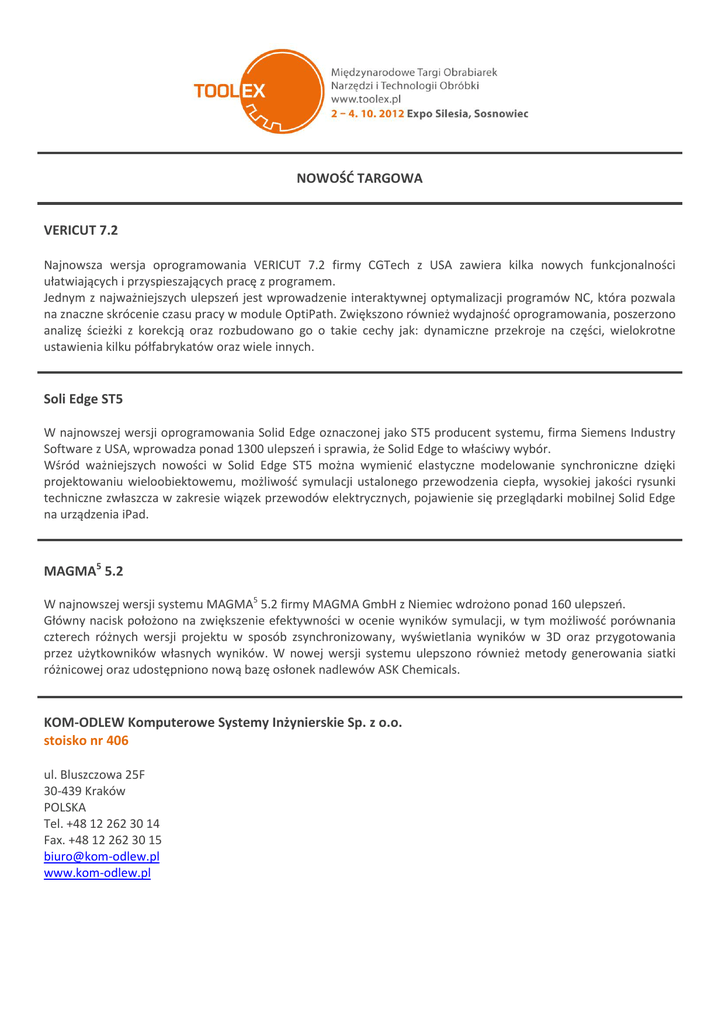 NOWOŚĆ TARGOWA VERICUT 7.2 Najnowsza wersja oprogramowania VERICUT 7.2 firmy CGTech z USA zawiera kilka nowych funkcjonalności ułatwiających i przyspieszających pracę z programem. Jednym z najważniejszych ulepszeń jest wprowadzenie interaktywnej optymalizacji programów NC, która pozwala na znaczne skrócenie czasu pracy w module OptiPath. Zwiększono również wydajność oprogramowania, poszerzono analizę ścieżki z korekcją oraz rozbudowano go o takie cechy jak: dynamiczne przekroje na części, wielokrotne ustawienia kilku półfabrykatów oraz wiele innych. Soli Edge ST5 W najnowszej wersji oprogramowania Solid Edge oznaczonej jako ST5 producent systemu, firma Siemens Industry Software z USA, wprowadza ponad 1300 ulepszeń i sprawia, że Solid Edge to właściwy wybór. Wśród ważniejszych nowości w Solid Edge ST5 można wymienić elastyczne modelowanie synchroniczne dzięki projektowaniu wieloobiektowemu, możliwość symulacji ustalonego przewodzenia ciepła, wysokiej jakości rysunki techniczne zwłaszcza w zakresie wiązek przewodów elektrycznych, pojawienie się przeglądarki mobilnej Solid Edge na urządzenia iPad. MAGMA5 5.2 W najnowszej wersji systemu MAGMA5 5.2 firmy MAGMA GmbH z Niemiec wdrożono ponad 160 ulepszeń. Główny nacisk położono na zwiększenie efektywności w ocenie wyników symulacji, w tym możliwość porównania czterech różnych wersji projektu w sposób zsynchronizowany, wyświetlania wyników w 3D oraz przygotowania przez użytkowników własnych wyników. W nowej wersji systemu ulepszono również metody generowania siatki różnicowej oraz udostępniono nową bazę osłonek nadlewów ASK Chemicals. KOM-ODLEW Komputerowe Systemy Inżynierskie Sp. z o.o. stoisko nr 406 ul. Bluszczowa 25F 30-439 Kraków POLSKA Tel. +48 12 262 30 14 Fax. +48 12 262 30 15 [email protected] www.kom-odlew.pl