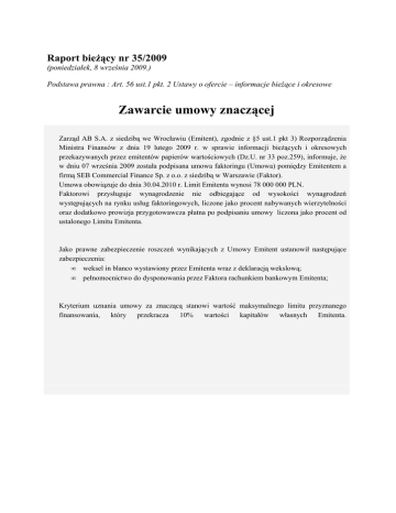Raport bieŜący nr 35/2009 (poniedziałek, 8 września 2009.) Podstawa prawna : Art. 56 ust.1 pkt. 2 Ustawy o ofercie – informacje bieŜące i okresowe Zawarcie umowy znaczącej Zarząd AB S.A. z siedzibą we Wrocławiu (Emitent), zgodnie z §5 ust.1 pkt 3) Rozporządzenia Ministra Finansów z dnia 19 lutego 2009 r. w sprawie informacji bieŜących i okresowych przekazywanych przez emitentów papierów wartościowych (Dz.U. nr 33 poz.259), informuje, Ŝe w dniu 07 września 2009 została podpisana umowa faktoringu (Umowa) pomiędzy Emitentem a firmą SEB Commercial Finance Sp. z o.o. z siedzibą w Warszawie (Faktor). Umowa obowiązuje do dnia 30.04.2010 r. Limit Emitenta wynosi 78 000 000 PLN. Faktorowi przysługuje wynagrodzenie nie odbiegające od wysokości wynagrodzeń występujących na rynku usług faktoringowych, liczone jako procent nabywanych wierzytelności oraz dodatkowo prowizja przygotowawcza płatna po podpisaniu umowy liczona jako procent od ustalonego Limitu Emitenta. Jako prawne zabezpieczenie roszczeń wynikających z Umowy Emitent ustanowił następujące zabezpieczenia: • weksel in blanco wystawiony przez Emitenta wraz z deklaracją wekslową; • pełnomocnictwo do dysponowania przez Faktora rachunkiem bankowym Emitenta; Kryterium uznania umowy za znaczącą stanowi wartość maksymalnego limitu przyznanego finansowania, który przekracza 10% wartości kapitałów własnych Emitenta.