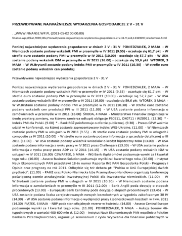 PRZEWIDYWANE NAJWAŻNIEJSZE WYDARZENIA GOSPODARCZE 2 V - 31 V . .,WWW.FINANSE.WP.PL (2011-05-02 00:00:00) finanse.wp.pl/kat,7069,title,Przewidywane-najwazniejsze-wydarzenia-gospodarcze-2-V-31-V,wid,13369097,wiadomosc.html Poniżej najważniejsze wydarzenia gospodarcze w dniach 2 V - 31 V PONIEDZIAŁEK, 2 MAJA - W Niemczech zostanie podany wskaźnik PMI w przemyśle w IV 2011 (9.55) - oczekuje się 61,7 pkt - W strefie euro zostanie podany PMI w przemyśle w IV 2011 (10.00) - oczekuje się 57,7 pkt - W USA zostanie podany wskaźnik ISM w przemyśle w IV 2011 (16.00) - oczekuje się 59,6 pkt WTOREK, 3 MAJA - W W.Brytanii zostanie podany indeks PMI w przemyśle w IV 2011 (10.30) - W strefie euro zostanie podany wskaźnik cen produkcj Przewidywane najważniejsze wydarzenia gospodarcze 2 V - 31 V Poniżej najważniejsze wydarzenia gospodarcze w dniach 2 V - 31 V PONIEDZIAŁEK, 2 MAJA - W Niemczech zostanie podany wskaźnik PMI w przemyśle w IV 2011 (9.55) - oczekuje się 61,7 pkt - W strefie euro zostanie podany PMI w przemyśle w IV 2011 (10.00) - oczekuje się 57,7 pkt - W USA zostanie podany wskaźnik ISM w przemyśle w IV 2011 (16.00) - oczekuje się 59,6 pkt WTOREK, 3 MAJA W W.Brytanii zostanie podany indeks PMI w przemyśle w IV 2011 (10.30) - W strefie euro zostanie podany wskaźnik cen produkcji PPI w III 2011 (11.00) - W USA zostanie podana informacja o zamówieniach w przemyśle w III 2011 (16.00) ŚRODA, 4 MAJA - Ministerstwo Finansów zorganizuje w środę przetarg zamiany, na którym zamierza odkupić obligacje PS0511, OK0711 i WZ0911. (12.30) * Indeks PMI dla Polski. (9.00) * - Bank BGŻ poinformuje o ofercie publicznej. (9.30) - Prezes GPW weźmie udział w konferencji, na której zostanie zaprezentowany indeks WIG-Ukraine. (11.00) - W Niemczech zostanie podany PMI w usługach w IV 2011 (9.55) - W strefie euro zostanie podany PMI w usługach i composite za IV 2011 (10.00) - W strefie euro zostanie podana informacja o sprzedaży detalicznej w III 2011 (11.00) - W USA zostanie podany wskaźnik wniosków o kredyt hipoteczny MBA (13.00) - W USA zostanie podana informacja z rynku pracy w IV 2011 przez Challengera (13.30) - W USA zostanie podana informacja z rynku pracy przez ADP za IV 2011 (14.15) - W USA zostanie podany wskaźnik ISM w usługach w IV 2011 (16.00) CZWARTEK, 5 MAJA - ING Bank śląski omówi podsumuje wyniki za I kwartał tego roku. (10.00) - Asseco Business Solution podsumuje wyniki za I kwartał tego roku. (10.00) - Instytut Nauk Ekonomicznych PAN przedstawi 18-ty numer Raportu INE PAN Gospodarka Polski - Prognozy i Opinie oraz prognozy na rok 2011. Odbędzie się też debata pt: "Polska w Unii Europejskiej dwóch prędkości". (11.00) - PAIiIZ oraz Polsko-Niemiecka Izba Przemysłowo-Handlowa organizują konferencję poświęconą ocenie atrakcyjności inwestycyjnej Polski dla inwestorów niemieckich. (11.00) - W W.Brytanii zostanie podany PMI w usługach w IV 2011 (10.30) - W Niemczech zostanie podana informacja o zamówieniach w przemyśle w III 2011 (12.00) - Bank Anglii poda decyzję o stopach procentowych (13.00) - Europejski Bank Centralny poda decyzję o stopach procentowych (13.45) - W USA zostanie podana liczba zarejestrowanych nowych bezrobotnych w tygodniu zakończonym 30 IV (14.30) - W USA zostanie podana informacja o wydajności pracy i jednostkowych kosztach w I kw. 2011 (14.30) PIĄTEK, 6 MAJA - NBP poda stan oficjalnych rezerw w kwietniu. (14.00) - Asseco Central Europe podsumuje wyniki za I kwartał tego roku. (11.00) PONIEDZIAŁEK, 9 MAJA - Aukcja bonów 46tygodniowych o wartości 400-600 mln zł. (12.00) - Instytut Nauk Ekonomicznych PAN wspólnie z Polskim Bankiem Przedsiębiorczości, organizuje seminarium z cyklu Wyzwania dla finansów publicznych w Polsce, pt.: "Deregulacja w biznesie - jak wesprzeć polską przedsiębiorczość?". (11.00) - Horst Kohler, były prezydent Niemiec wygłosi w SGH wykład na temat reformy międzynarodowego systemu walutowego. (15.30) WTOREK, 10 MAJA - Pierwszy dzień posiedzenia RPP. - Zetkama omówi wyniki finansowe za I kw. 2011 r. (9.00) - NG2 skomentuje wyniki finansowe za I kw. 2011 r. (10.00) Ułatwienia i uproszczenia dla biznesu to temat konferencji Służby Celnej. (11.00) - Instytut Nauk Ekonomicznych PAN, wspólnie z Polskim Towarzystwem Ekonomicznym, organizuje seminarium z udziałem prof. Kazimierza Łaskiego pt.: "Dlaczego kryzys dotknął niektóre kraje Europejskiej Unii Walutowej, a nie inne kraje Unii Europejskiej?". (11.00) *- Grupa Pfleiderer Grajewo SA przedstawi wyniki finansowe spółki za I kwartał 2011 roku, a następnie zaprezentuje nowości produktowe oraz planowane przez Grupe Pfleiderer Grajewo aktywności rynkowe. (12.30) ŚRODA, 11 MAJA - GUS opublikuje dane o przeciętnym wynagrodzeniu miesięcznym w I kw. 2011 r. (14.00) - Decyzja RPP. - Centrum Stosunków Międzynarodowych oraz Central & Eastern Europe Development Initiative organizują seminarium: "Co dla Europy Środkowej oznaczał globalny kryzys finansowy?". Podczas seminarium dr Anders Aslund, Ekspert z Instytutu Petersona w Waszyngtonie, zaprezentuje swoje tezy w oparciu o niedawno wydaną książkę "Ostatni będą pierwszymi". Prof. Witold Orłowski odniesie się do zaprezentowanych tez. (10.00) * - Coface Poland oraz Credit Agricole CIB przedstawią prognozę dla światowej gospodarki. (11.00) *- Konferencja współorganizowana przez Google, Polską Konfederację Pracodawców Prywatnych "Lewiatan" i Boston Consulting Group z okazji ogłoszenia raportu Boston Consulting Group: "Polska Internetowa - jak internet dokonuje transformacji polskiej gospodarki". (11.00) ŚRODA-CZWARTEK, 11-12 MAJA Spotkanie Liderów Bankowości "Banking Forum 2011". Projekt współtworzony jest z prezesami banków oraz operatorami telekomunikacyjnymi, wchodzącymi w skład Rady Programowej. Spotkanie jest neutralną i merytoryczną platformą wymiany poglądów pomiędzy wszystkimi podmiotami mającymi wpływ na przyszłość i kształt polski