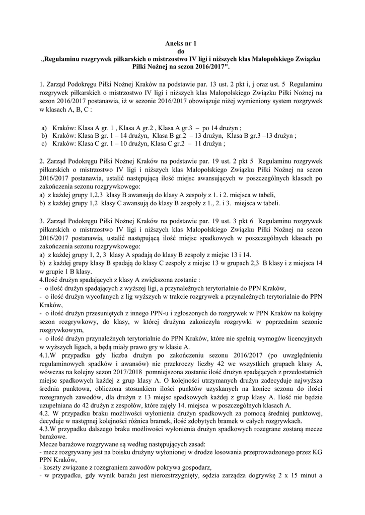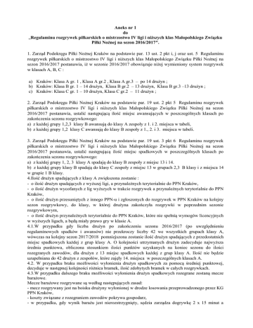 Aneks nr 1 do „Regulaminu rozgrywek piłkarskich o mistrzostwo IV ligi i niższych klas Małopolskiego Związku Piłki Nożnej na sezon 2016/2017". 1. Zarząd Podokręgu Piłki Nożnej Kraków na podstawie par. 13 ust. 2 pkt i, j oraz ust. 5 Regulaminu rozgrywek piłkarskich o mistrzostwo IV ligi i niższych klas Małopolskiego Związku Piłki Nożnej na sezon 2016/2017 postanawia, iż w sezonie 2016/2017 obowiązuje niżej wymieniony system rozgrywek w klasach A, B, C : a) Kraków: Klasa A gr. 1 , Klasa A gr.2 , Klasa A gr.3 – po 14 drużyn ; b) Kraków: Klasa B gr. 1 – 14 drużyn, Klasa B gr.2 – 13 drużyn, Klasa B gr.3 –13 drużyn ; c) Kraków: Klasa C gr. 1 – 10 drużyn, Klasa C gr.2 – 11 drużyn ; 2. Zarząd Podokręgu Piłki Nożnej Kraków na podstawie par. 19 ust. 2 pkt 5 Regulaminu rozgrywek piłkarskich o mistrzostwo IV ligi i niższych klas Małopolskiego Związku Piłki Nożnej na sezon 2016/2017 postanawia, ustalić następującą ilość miejsc awansujących w poszczególnych klasach po zakończenia sezonu rozgrywkowego: a) z każdej grupy 1,2,3 klasy B awansują do klasy A zespoły z 1. i 2. miejsca w tabeli, b) z każdej grupy 1,2 klasy C awansują do klasy B zespoły z 1., 2. i 3. miejsca w tabeli. 3. Zarząd Podokręgu Piłki Nożnej Kraków na podstawie par. 19 ust. 3 pkt 6 Regulaminu rozgrywek piłkarskich o mistrzostwo IV ligi i niższych klas Małopolskiego Związku Piłki Nożnej na sezon 2016/2017 postanawia, ustalić następującą ilość miejsc spadkowych w poszczególnych klasach po zakończenia sezonu rozgrywkowego: a) z każdej grupy 1, 2, 3 klasy A spadają do klasy B zespoły z miejsc 13 i 14. b) z każdej grupy klasy B spadają do klasy C zespoły z miejsc 13 w grupach 2,3 B klasy i z miejsca 14 w grupie 1 B klasy. 4.Ilość drużyn spadających z klasy A zwiększona zostanie : - o ilość drużyn spadających z wyższej ligi, a przynależnych terytorialnie do PPN Kraków, - o ilość drużyn wycofanych z lig wyższych w trakcie rozgrywek a przynależnych terytorialnie do PPN Kraków, - o ilość drużyn przesuniętych z innego PPN-u i zgłoszonych do rozgrywek w PPN Kraków na kolejny sezon rozgrywkowy, do klasy, w której drużyna zakończyła rozgrywki w poprzednim sezonie rozgrywkowym, - o ilość drużyn przynależnych terytorialnie do PPN Kraków, które nie spełnią wymogów licencyjnych w wyższych ligach, a będą miały prawo gry w klasie A. 4.1.W przypadku gdy liczba drużyn po zakończeniu sezonu 2016/2017 (po uwzględnieniu regulaminowych spadków i awansów) nie przekroczy liczby 42 we wszystkich grupach klasy A, wówczas na kolejny sezon 2017/2018 pomniejszona zostanie ilość drużyn spadających z przedostatnich miejsc spadkowych każdej z grup klasy A. O kolejności utrzymanych drużyn zadecyduje najwyższa średnia punktowa, obliczona stosunkiem ilości punktów uzyskanych na koniec sezonu do ilości rozegranych zawodów, dla drużyn z 13 miejsc spadkowych każdej z grup klasy A. Ilość nie będzie uzupełniana do 42 drużyn z zespołów, które zajęły 14. miejsca w poszczególnych klasach A. 4.2. W przypadku braku możliwości wyłonienia drużyn spadkowych za pomocą średniej punktowej, decyduje w następnej kolejności różnica bramek, ilość zdobytych bramek w całych rozgrywkach. 4.3.W przypadku dalszego braku możliwości wyłonienia drużyn spadkowych rozegrane zostaną mecze barażowe. Mecze barażowe rozgrywane są według następujących zasad: - mecz rozgrywany jest na boisku drużyny wyłonionej w drodze losowania przeprowadzonego przez KG PPN Kraków, - koszty związane z rozegraniem zawodów pokrywa gospodarz, - w przypadku, gdy wynik barażu jest nierozstrzygnięty, sędzia zarządza dogrywkę 2 x 15 minut a następnie serię rzutów karnych do wyłonienia zwycięzcy. 4.4. W przypadku, gdy liczba drużyn po zakończeniu sezonu 2016/2017 (po uwzględnieniu regulaminowych spadków i awansów) przekroczy 42 we wszystkich grupach klasy A, o spadku kolejnych drużyn zadecyduje najniższa średnia punktowa, obliczona stosunkiem ilości punktów uzyskanych na koniec sezonu do ilości rozegranych zawodów, dla drużyn z kolejnych równorzędnych miejsc spadkowych każdej z grup klasy A tak, aby każda grupa klasy A w sezonie rozgrywkowym 2017/2018 liczyła po 14 drużyn. 4.5. W przypadku braku możliwości wyłonienia drużyn spadkowych za pomocą średniej punktowej, decyduje w następnej kolejności różnica bramek, ilość zdobytych goli . 4.6. W przypadku dalszego braku możliwości wyłonienia drużyn spadkowych rozegrane zostaną mecze barażowe według zasad jak w pkt 4.3. 4.7. W przypadku wycofania drużyn z rozgrywek są one uznawane za spadkowe bez względu na grupę klasy A, w której występowały w czasie rozgrywek. Jeżeli w danej grupie klasy A wycofa się więcej niż 2 drużyny to wszystkie uznawane są za spadkowe i pomniejszają ilość drużyn spadkowych w pozostałych grupach klasy A. Utrzymana zostaje drużyna z najwyższą średnią punktową z równorzędnych miejsc spadkowych w poszczególnych grupach klasy A. 4.8. Ilość drużyn spadających z klasy B zwiększona zostanie : - o ilość drużyn spadających z wyższej ligi, a przynależnych terytorialnie do PPN Kraków, - o ilość drużyn wycofanych z lig wyższych w trakcie rozgrywek a przynależnych terytorialnie do PPN Kraków, - o ilość drużyn przesuniętych z innego PPN- u i zgłoszonych do rozgrywek w PPN Kraków na kolejny sezon rozgrywkowy, do klasy, w której drużyna zakończyła rozgrywki w poprzednim sezonie rozgrywkowym, - o ilość drużyn przynależnych terytorialnie do PPN Kraków, które nie spełnią wymogów licencyjnych w wyższych ligach, a będą miały prawo gry w klasie B. 4.9. W przypadku gdy liczba drużyn po zakończeniu sezonu 2016/2017 (po uwzględnieniu regulaminowych spadków i awansów) nie przekroczy liczby 42 we wszystkich grupach klasy B, wówczas na kolejny sezon 2017/2018 ilość nie będzie 