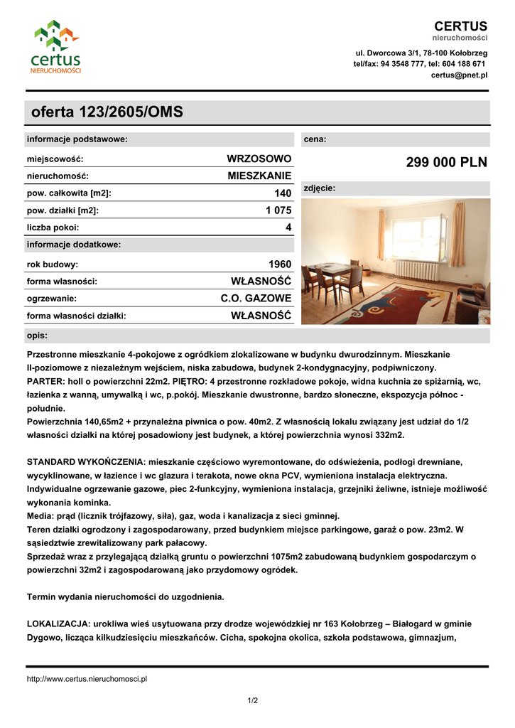 CERTUS nieruchomości ul. Dworcowa 3/1, 78-100 Kołobrzeg tel/fax: 94 3548 777, tel: 604 188 671 [email protected] oferta 123/2605/OMS informacje podstawowe: cena: miejscowość: WRZOSOWO nieruchomość: MIESZKANIE 140 pow. całkowita [m2]: 299 000 PLN zdjęcie: 1 075 pow. działki [m2]: 4 liczba pokoi: informacje dodatkowe: 1960 rok budowy: WŁASNOŚĆ forma własności: ogrzewanie: C.O. GAZOWE forma własności działki: WŁASNOŚĆ opis: Przestronne mieszkanie 4-pokojowe z ogródkiem zlokalizowane w budynku dwurodzinnym. Mieszkanie II-poziomowe z niezależnym wejściem, niska zabudowa, budynek 2-kondygnacyjny, podpiwniczony. PARTER: holl o powierzchni 22m2. PIĘTRO: 4 przestronne rozkładowe pokoje, widna kuchnia ze spiżarnią, wc, łazienka z wanną, umywalką i wc, p.pokój. Mieszkanie dwustronne, bardzo słoneczne, ekspozycja północ południe. Powierzchnia 140,65m2 + przynależna piwnica o pow. 40m2. Z własnością lokalu związany jest udział do 1/2 własności działki na której posadowiony jest budynek, a której powierzchnia wynosi 332m2. STANDARD WYKOŃCZENIA: mieszkanie częściowo wyremontowane, do odświeżenia, podłogi drewniane, wycyklinowane, w łazience i wc glazura i terakota, nowe okna PCV, wymieniona instalacja elektryczna. Indywidualne ogrzewanie gazowe, piec 2-funkcyjny, wymieniona instalacja, grzejniki żeliwne, istnieje możliwość wykonania kominka. Media: prąd (licznik trójfazowy, siła), gaz, woda i kanalizacja z sieci gminnej. Teren działki ogrodzony i zagospodarowany, przed budynkiem miejsce parkingowe, garaż o pow. 23m2. W sąsiedztwie zrewitalizowany park pałacowy. Sprzedaż wraz z przylegającą działką gruntu o powierzchni 1075m2 zabudowaną budynkiem gospodarczym o powierzchni 32m2 i zagospodarowaną jako przydomowy ogródek. Termin wydania nieruchomości do uzgodnienia. LOKALIZACJA: urokliwa wieś usytuowana przy drodze wojewódzkiej nr 163 Kołobrzeg – Białogard w gminie Dygowo, licząca kilkudziesięciu mieszkańców. Cicha, spokojna okolica, szkoła podstawowa, gimnazjum, http://www.certus.nieruchomosci.pl 1/2 CERTUS nieruchomości ul. Dworcowa 3/1, 78-100 Kołobrzeg tel/fax: 94 3548 777, tel: 604 188 671 [email protected] ośrodek zdrowia, kompleks sportowy z boiskami i kortami tenisowymi, plac zabaw dla dzieci, przystanek kolejowy i autobusowy. Odległość do Dygowa 7km, odległość do Kołobrzegu 15km. W celu uzyskania pełnej informacji o ofercie prosimy o kontakt telefoniczny, bądź mailowy. http://www.certus.nieruchomosci.pl 2/2