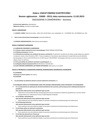 Dobra: ZAKUP ENERGII ELEKTRYCZNEJ Numer ogłoszenia: 55600 - 2013; data zamieszczenia: 11.02.2013 OGŁOSZENIE O ZAMÓWIENIU - dostawy Zamieszczanie ogłoszenia: obowiązkowe. Ogłoszenie dotyczy: zamówienia publicznego. SEKCJA I: ZAMAWIAJĄCY I. 1) NAZWA I ADRES: Wójt Gminy Dobra , Dobra 233, 34-642 Dobra, woj. małopolskie, tel. 18 3330020, faks 18 3330020 wew. 200. Adres strony internetowej zamawiającego: www.gminadobra.pl • I. 2) RODZAJ ZAMAWIAJĄCEGO: Administracja samorządowa. SEKCJA II: PRZEDMIOT ZAMÓWIENIA II.1) OKREŚLENIE PRZEDMIOTU ZAMÓWIENIA II.1.1) Nazwa nadana zamówieniu przez zamawiającego: ZAKUP ENERGII ELEKTRYCZNEJ. II.1.2) Rodzaj zamówienia: dostawy. II.1.3) Określenie przedmiotu oraz wielkości lub zakresu zamówienia: Przedmiotem zamówienia jest Zakup energii elektrycznej zgodnie z przepisami ustawy z dnia 10 kwietnia 1997 r. Prawo energetyczne. Szacunkowe zapotrzebowanie energii elektrycznej dla obiektów Zamawiającego w okresie od 01.04.2013 do 31.12.2014 wynosi 1 091,98 MWh. Zamawiający informuje, że proces zmiany sprzedawcy odbywa się po raz pierwszy. II.1.4) Czy przewiduje się udzielenie zamówień uzupełniających: nie. II.1.5) Wspólny Słownik Zamówień (CPV): 09.00.00.00-3, 09.30.00.00-2. II.2) CZAS TRWANIA ZAMÓWIENIA LUB TERMIN WYKONANIA: Zakończenie: 31.12.2014. SEKCJA III: INFORMACJE O CHARAKTERZE PRAWNYM, EKONOMICZNYM, FINANSOWYM I TECHNICZNYM III.1) WADIUM Informacja na temat wadium: Nie dotyczy III.2) ZALICZKI Czy przewiduje się udzielenie zaliczek na poczet wykonania zamówienia: nie • III.3) WARUNKI UDZIAŁU W POSTĘPOWANIU ORAZ OPIS SPOSOBU DOKONYWANIA OCENY SPEŁNIANIA TYCH WARUNKÓW • III. 3.1) Uprawnienia do wykonywania określonej działalności lub czynności, jeżeli przepisy prawa nakładają obowiązek ich posiadania Opis sposobu dokonywania oceny spełniania tego warunku o Wykonawca musi posiadać aktualnie obowiązującą koncesję na prowadzenie działalności gospodarczej w zakresie obrotu energią elektryczną, wydaną przez Prezesa Urzędu Regulacji Energetyki • III.3.2) Wiedza i doświadczenie Opis sposobu dokonywania oceny spełniania tego warunku o • Ocena spełniania warunku dokonana będzie na postawie oświadczenia przedstawionego przez Wykonawcę III.3.3) Potencjał techniczny Opis sposobu dokonywania oceny spełniania tego warunku o • Ocena spełniania warunku dokonana będzie na postawie oświadczenia przedstawionego przez Wykonawcę III.3.4) Osoby zdolne do wykonania zamówienia Opis sposobu dokonywania oceny spełniania tego warunku o • Ocena spełniania warunku dokonana będzie na postawie oświadczenia przedstawionego przez Wykonawcę III.3.5) Sytuacja ekonomiczna i finansowa Opis sposobu dokonywania oceny spełniania tego warunku o Ocena spełniania warunku dokonana będzie na postawie oświadczenia przedstawionego przez Wykonawcę III.4) INFORMACJA O OŚWIADCZENIACH LUB DOKUMENTACH, JAKIE MAJĄ DOSTARCZYĆ WYKONAWCY W CELU POTWIERDZENIA SPEŁNIANIA WARUNKÓW UDZIAŁU W POSTĘPOWANIU ORAZ NIEPODLEGANIA WYKLUCZENIU NA PODSTAWIE ART. 24 UST. 1 USTAWY • III.4.1) W zakresie wykazania spełniania przez wykonawcę warunków, o których mowa w art. 22 ust. 1 ustawy, oprócz oświadczenia o spełnieniu warunków udziału w postępowaniu, należy przedłożyć: • • koncesję, zezwolenie lub licencję III.4.2) W zakresie potwierdzenia niepodlegania wykluczeniu na podstawie art. 24 ust. 1 ustawy, należy przedłożyć: • oświadczenie o braku podstaw do wykluczenia • aktualny odpis z właściwego rejestru, jeżeli odrębne przepisy wymagają wpisu do rejestru, w celu wykazania braku podstaw do wykluczenia w oparciu o art. 24 ust. 1 pkt 2 ustawy, wystawiony nie wcześniej niż 6 miesięcy przed upływem terminu składania wniosków o dopuszczenie do udziału w postępowaniu o udzielenie zamówienia albo składania ofert, a w stosunku do osób fizycznych oświadczenie w zakresie art. 24 ust. 1 pkt 2 ustawy • III.4.3) Dokumenty podmiotów zagranicznych Jeżeli wykonawca ma siedzibę lub miejsce zamieszkania poza terytorium Rzeczypospolitej Polskiej, przedkłada: III.4.3.1) dokument wystawiony w kraju, w którym ma siedzibę lub miejsce zamieszkania potwierdzający, że: • nie otwarto jego likwidacji ani nie ogłoszono upadłości - wystawiony nie wcześniej niż 6 miesięcy przed upływem terminu składania wniosków o dopuszczenie do udziału w postępowaniu o udzielenie zamówienia albo składania ofert III.7) Czy ogranicza się możliwość ubiegania się o zamówienie publiczne tylko dla wykonawców, u których ponad 50 % pracowników stanowią osoby niepełnosprawne: nie SEKCJA IV: PROCEDURA IV.1) TRYB UDZIELENIA ZAMÓWIENIA IV.1.1) Tryb udzielenia zamówienia: licytacja elektroniczna. IV.2) KRYTERIA OCENY OFERT IV.2.1) Kryteria oceny ofert: najniższa cena. IV.3) ZMIANA UMOWY Czy przewiduje się istotne zmiany postanowień zawartej umowy w stosunku do treści oferty, na podstawie której dokonano wyboru wykonawcy: tak Dopuszczalne zmiany postanowień umowy oraz określenie warunków zmian 1. Cena ulega zmianie wyłącznie w przypadku ustawowej zmiany stawki podatku VAT lub ustawowej zmianie opodatkowania energii elektrycznej podatkiem akcyzowym. 2. Na wniosek Zamawiającego możliwe jest zwiększenie lub zmniejszenie ilości punktów odbioru wymienionych w szczegółowym Opisie Przedmiotu Zamówienia, zmiana nie może przekroczyć 15%. 3. Z przyczyn formalno-prawnych zamawiający dopuszcza zmianę terminu rozpoczęcia wykonania zamówienia z zastrzeżeniem granicznego terminu wykonania zamówienia do 31.12.2014 r. 4. zmiany w strukturze organizacyjnej Wykonawcy lub Zamawiającego, dotyczące określonych w umowie nazw, adresów. Strony niezwłocznie poinformują się pisemnie o tych zmianach, 5. zmiany osób reprezentujących strony; Strony niezwłocznie poinformują się pisemnie o tych zmianach IV.4) INFORMACJE ADMINISTRACYJNE IV.4.5) Termin związania ofertą: okres w dniach: 30 (