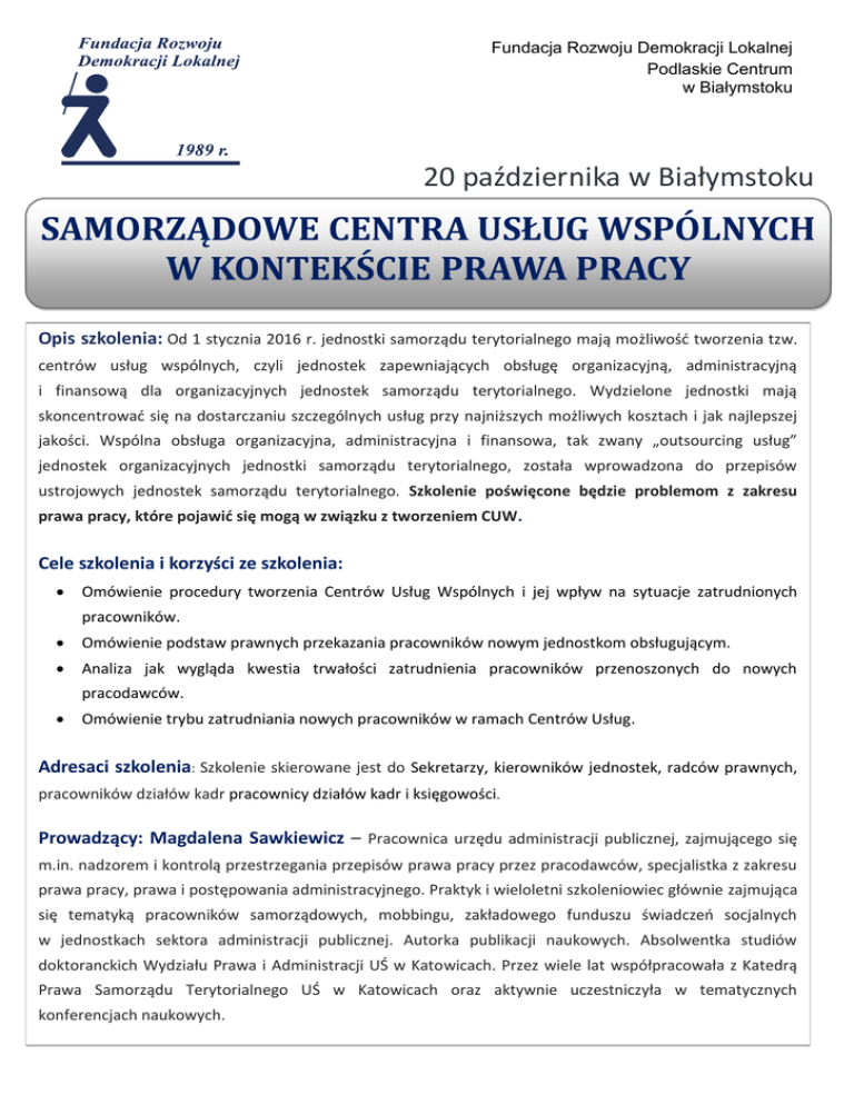 Fundacja Rozwoju Demokracji Lokalnej Podlaskie Centrum w Białymstoku 20 października w Białymstoku SAMORZĄDOWE CENTRA USŁUG WSPÓLNYCH W KONTEKŚCIE PRAWA PRACY Opis szkolenia: Od 1 stycznia 2016 r. jednostki samorządu terytorialnego mają możliwość tworzenia tzw. centrów usług wspólnych, czyli jednostek zapewniających obsługę organizacyjną, administracyjną i finansową dla organizacyjnych jednostek samorządu terytorialnego. Wydzielone jednostki mają skoncentrować się na dostarczaniu szczególnych usług przy najniższych możliwych kosztach i jak najlepszej jakości. Wspólna obsługa organizacyjna, administracyjna i finansowa, tak zwany „outsourcing usług” jednostek organizacyjnych jednostki samorządu terytorialnego, została wprowadzona do przepisów ustrojowych jednostek samorządu terytorialnego. Szkolenie poświęcone będzie problemom z zakresu prawa pracy, które pojawić się mogą w związku z tworzeniem CUW. Cele szkolenia i korzyści ze szkolenia: Omówienie procedury tworzenia Centrów Usług Wspólnych i jej wpływ na sytuacje zatrudnionych pracowników. Omówienie podstaw prawnych przekazania pracowników nowym jednostkom obsługującym. Analiza jak wygląda kwestia trwałości zatrudnienia pracowników przenoszonych do nowych pracodawców. Omówienie trybu zatrudniania nowych pracowników w ramach Centrów Usług. Adresaci szkolenia: Szkolenie skierowane jest do Sekretarzy, kierowników jednostek, radców prawnych, pracowników działów kadr pracownicy działów kadr i księgowości. Prowadzący: Magdalena Sawkiewicz – Pracownica urzędu administracji publicznej, zajmującego się m.in. nadzorem i kontrolą przestrzegania przepisów prawa pracy przez pracodawców, specjalistka z zakresu prawa pracy, prawa i postępowania administracyjnego. Praktyk i wieloletni szkoleniowiec głównie zajmująca się tematyką pracowników samorządowych, mobbingu, zakładowego funduszu świadczeń socjalnych w jednostkach sektora administracji publicznej. Autorka publikacji naukowych. Absolwentka studiów doktoranckich Wydziału Prawa i Administracji UŚ w Katowicach. Przez wiele lat współpracowała z Katedrą Prawa Samorządu Terytorialnego UŚ w Katowicach oraz aktywnie uczestniczyła w tematycznych konferencjach naukowych. Program szkolenia: 1. Jednostki obsługiwane i jednostki obsługujące – pojęcia wynikające z nowych, obowiązujących przepisów prawa. 2. Sposób tworzenia CUW. - Uchwała rady. - Porozumienie o świadczeniu wspólnych usług. 3. Formy organizacyjne CUW. 4. Co stanie się z dotychczasowymi zespołami obsługi jednostek samorządowych (m.in. oświatowych) i innymi zespołami? Co z ich pracownikami? 5. Czy zawsze CUW będzie nowym pracodawcą samorządowym? 6. Podstawy prawne przekazania pracowników dotychczasowych zespołów obsługi jednostek samorządowych. 7. Podstawy prawne przekazania pracowników jednostek obsługiwanych do jednostek obsługujących – ustawa o pracownikach samorządowych czy Kodeks pracy. 8. Obowiązki związane z przekazaniem pracowników – pomocnicze wzory dokumentów. 9. Kontynuacja stosunku pracy czy zawarcie nowego stosunku pracy? 10. Czy pracownicy dotychczas wykonujący obowiązki, które zostały przekazane do CUW mają zapewnioną gwarancję zatrudnienia? 11. Tryb zatrudniania nowych pracowników w ramach CUW. 12. Zmiany organizacyjne w tym zmiany zakresów obowiązków pracowników wykonujących obowiązki CUW w ramach urzędów gmin, starostw powiatowych, urzędów wojewódzkich. 13. Problemy praktyczne z zakresu prawa pracy związane z centrami usług wspólnych – m.in. dokumentacja pracownicza, fundusz świadczeń socjalnych, dodatkowe wynagrodzenie roczne, związki zawodowe. 14. Indywidualne konsultacje. SZKOLENIE: SAMORZĄDOWE CENTRA USŁUG WSPÓLNYCH W KONTEKŚCIE PRAWA PRACY Miejsce: DANE D O K ON T AK T U : Fundacja Rozwoju Demokracji Lokalnej Podlaskie Centrum ul. Choroszczańska 31 15-732 Białystok (Dawny budynek Wyższej Szkoły Ekonomicznej) tel./fax. 85 732 17 88, 85 732 94 84 e-mail: [email protected] w w w. frd l.b ia lys tok .p l OS OB A D O K ONT A K TU : Agnieszka Lipińska [email protected] Urszula Szczesiul [email protected] Marlena Dojlidko [email protected] SALA SZKOLENIOWA FRDL-PC ul. Choroszczańska 31, 15-732 Białystok (dawny budynek WSE) Termin i godzina: 20 października 2016 r. godz. 10.00-15.00 Cena: 345 zł/os. +23% VAT Rabat: 10% - za zgłoszenie 2 lub więcej osób Zwolnione z VAT przy finansowaniu szkolenia ze środków publicznych. Cena zawiera materiały szkoleniowe, zaświadczenie o ukończeniu szkolenia, lunch i serwis kawowy. Zgłoszenia: Wypełnioną kartę zgłoszenia (zamieszczona poniżej) należy przesłać faksem lub mailem do 12 października 2016 r. Płatność przelewem na podstawie faktury otrzymanej po szkoleniu. Karta zgłoszenia (e-mail: [email protected], fax 85 732 94 84) (prosimy o wypełnienie drukowanymi literami) Dane do faktury: .......................................................................................................................................................................... Adres............................................................................................................................................................................................. NIP................................................................................................................................................................................................. L.p. Imię i nazwisko Dział/Wydział Tel. kontaktowy e-mail 1. 2. 3. Zgodnie z Ustawą o Ochronie Danych Osobowych z dnia 29.08.1997 r. wyrażam zgodę na przetwarzanie moich danych osobowych dla potrzeb działalności szkoleniowej FRDL Podlaskie Centrum - Oświadczam, że udział w szkoleniu finansowany jest w co najmniej 70% ze środków publicznych lub samorządowych, w związku z tym proszę o wystawienie faktury zwolnionej z podatku VAT. …………