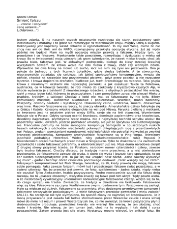 Anatol Ulman Śmierć fałszu „...cnocie i wstydowi cenę ustawili...” („Odprawa...”) Jestem zdania, iż na naszych oczach ostatecznie rozstrzyga się stary, podstawowy spór intelektualny i moralny. I to gdzie się rozstrzyga! W wierzbowym kraju, między Odrą a Bugiem. Dokonywany jest kapitalny wkład Polaków w ogólnoludzkość. To my nad Wisłą, mimo że nie chcą nas ani do Unii, ani do NATO, rozwiązujemy przeklętą opozycję etyczną. Już jej nigdy później nie będzie! Mam na myśli opozycję między prawdą a fałszem. Między tym, co prawdziwe i co fałszywe. Przekonanie takie powziąłem, rozmyślając i dyskutując o mleku od krowy. Bo w świadomość moją uderzyło jak grom twierdzenie, że nawet mleko krowie, choć jak prawda białe, fałszywe jest. W aktualnym podręczniku biologii do klasy trzeciej licealnej wyczytałem bowiem, że krowa wcale nie robi mleka z trawy, zbóż czy wonnych ziółek. Wprawdzie żre owe trawy na mokro lub sucho, lecz nie nimi się żywi ani przetwarza. Ona je pakuje do jednego z tych licznych żołądków, gdzie siedzą bakterie. A te stworzonka, nieprzyzwoicie objadając się celulozą, jak jakieś społeczeństwo konsumpcyjne, mnożą się obficie, chociaż na szczęście bez przyjemności płciowej, gdyż przez podział, a nie rozpustne łączenie. I krowa dopiero to draństwo, białkowe już, trawi przerabiając na mleczko. Taka głupia krowa z niewinnymi oczkami nie napoczętej panienki, a jak oszukuje! Także ta fioletowa, austriacka, co w telewizji twierdzi, że robi mleko do czekolady z kryształowo czystych Alp, w istocie wytwarza je z bakterii! Z niewidocznego robactwa, z ohydnych pełzaczków! Nie wierzę, rzekł z mocą jeden taki, któremu to przeczytałem. I sam pomyślałem zaraz: nie wierzę! Mleko z prątków, krętków, a takiego! Chociaż z kolei nie ma, co fałszowane by nie było. Bilety komunikacji miejskiej. Banderole alkoholowe i papierosowe. Wszelkiej maści banknoty. Paszporty, dowody osobiste i rejestracyjne. Dokumenty celne, urodzenia, śmierci, dziewictwa oraz inne. Masowo fałszowane są rzeczy, to znaczy ubranka. Amerykańskie dżinsy fabrykuje się w Grójcu i Kutnie. Kalesony włoskie eleganckie na wsi pod Mławą. Paryską bieliznę z metkami, że tworzona jest na ostatnim piętrze wieży Eiffla, szyje się na linii otwockiej. Wymienione fałszuje się w Polsce. Gdyby sprawę ocenić branżowo, dominuje papiernictwo oraz krawiectwo, dziedziny najprostsze, prymitywne rzecz można. Nic z najwyższej techniki schyłku wieku! Bo popatrzmy: wódki, owszem, jeszcze podrabiać umiemy, ale już ze spirytusu coś subtelniejszego nie. Francuskie perfumy na bazie samogonu komponują Samojedzi w opuszczonych ruskich bazach rakietowych z odchodów niedźwiedzi polarnych chłeptających ropę z przerdzewiałych rur! Polacy, znękani powstaniami narodowymi, wód kolońskich nie potrafią! Najwyżej ze zwykłej kranowej plejstoceńską. Komputery amerykańskie fałszowane są w Ping-Pongu. Telewizory japońskie podrabiają Hotentoci. Wideo, niby południowokoreańskie, robią Papuasi z holenderskich części machanych przez Indian w Singapurze. Tylko te drukowane (na zachodnich kopiarkach) i szyte fałszować potrafimy, a elektronicznych już nie. Moja duma narodowa cierpi! Z drugiej strony przyznać trzeba, że Polakom, narodowi numer czterdzieści i cztery, zawsze było trudno fałszować. Choćby dlatego, że tradycję mamy przeciwną, a w niej utwierdzone przekonanie, że fałszowanie zawsze się wyda. A skoro się wyda i jeszcze karę spowoduje, to po co? Bardzo niepragmatyczne jest. To już Rej tak urządził nasz naród. „Fałsz zawżdy wynurzyć się musi” - gadał i tworząc obraz człowieka poczciwego dodawał: „Fałsz wszędy się nie zatai”. Fałszywych kompromitował też Piotr Skarga, twierdząc, że źli, kiedy prawdą nie mogą, fałszem sobie pomagają. Fałsz zawsze fałszem, mówił lud i przestrzegał: fałszem świat przejdziesz, a w ćwierci utkniesz. No, bo przecież jest pewne, że fałsz, szalbierstwo – żadna sztuka, nigdy nieba nie oszuka! Tylko Aleksander, hrabia przyszywany, Fredro nowocześnie szukał dla fałszu dróg rozwoju, bo to „płaszcz obszerny”, wszystko znaczy się łatwo pod nim ukryć. Tędy poszło wielu. A że niedorozwój cywilizacyjny uniemożliwił konkurencyjne fałszowanie rzeczy, wzięto się za to, do czego sprzętu nie trzeba. Zwłaszcza, że tradycji w dziedzinie nie brakowało. Fałszowane więc są idee. Fałszowane są czyny. Konfiskowane owym, rozdawane tym. Fałszowane są zasługi. Małe są większe od dużych. Fałszowane są przymioty. Więc dodawane prymitywnym tumanom i odbierane rzeczywiście posiadającym. „I wiele fałszywych proroków powstanie i wielu zwiodą” (24,11). Na szczęście nie tyle wymyślono, bo sposób znany co najmniej od średniowiecza, ile z mocą przywracana jest zasada tak ładnie sformułowana przez Wieszcza: czucie i wiara silniej mówi do mnie niż rozum i prawo! Wystarczy jak ów, co nie uwierzył, że krowa pożyteczny płyn z drobnoustrojów produkuje, powiedzieć twardo: nie wierzę! Nie wierzę, że ten złodziej, choć może i kradnie. Nie wierzę, że ten tuman jest, choć na to wygląda. I tak dalej i coraz powszechniej. Zatem prawda jest siłą wiary. Wystarczy mocno wierzyć, by zniknął fałsz. Bo może w istocie nigdy go nie było, tylko wiary zabrakło w piękno, dobro, miłosierdzie? Pożyteczny sposób! Sycyna, nr 13/1995, 18 VI 1995