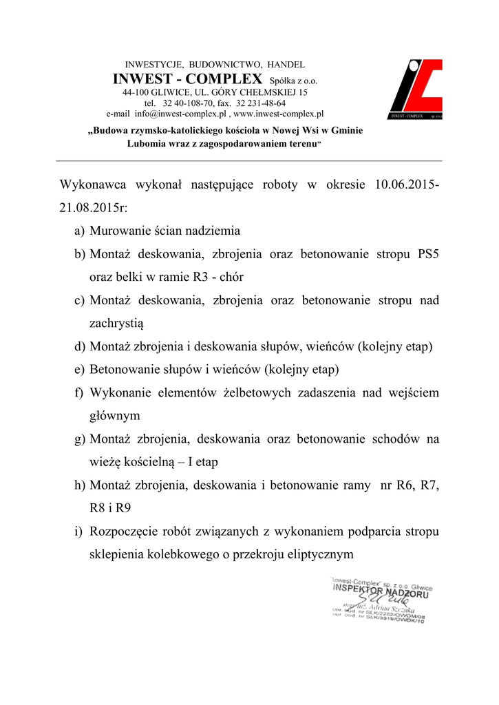 INWESTYCJE, BUDOWNICTWO, HANDEL INWEST - COMPLEX Spółka z o.o. 44-100 GLIWICE, UL. GÓRY CHEŁMSKIEJ 15 tel. 32 40-108-70, fax. 32 231-48-64 e-mail [email protected] , www.inwest-complex.pl INWEST - COMPLEX sp. z o.o. „Budowa rzymsko-katolickiego kościoła w Nowej Wsi w Gminie Lubomia wraz z zagospodarowaniem terenu” Wykonawca wykonał następujące roboty w okresie 10.06.201521.08.2015r: a) Murowanie ścian nadziemia b) Montaż deskowania, zbrojenia oraz betonowanie stropu PS5 oraz belki w ramie R3 - chór c) Montaż deskowania, zbrojenia oraz betonowanie stropu nad zachrystią d) Montaż zbrojenia i deskowania słupów, wieńców (kolejny etap) e) Betonowanie słupów i wieńców (kolejny etap) f) Wykonanie elementów żelbetowych zadaszenia nad wejściem głównym g) Montaż zbrojenia, deskowania oraz betonowanie schodów na wieżę kościelną – I etap h) Montaż zbrojenia, deskowania i betonowanie ramy nr R6, R7, R8 i R9 i) Rozpoczęcie robót związanych z wykonaniem podparcia stropu sklepienia kolebkowego o przekroju eliptycznym