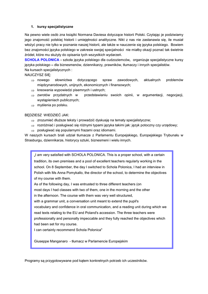 1. kursy specjalistyczne Na pewno wiele osób zna książki Normana Daviesa dotyczące historii Polski. Czytając je podziwiamy jego znajomość polskiej historii i umiejętności analityczne. Nikt z nas nie zastanawia się, ile musiał włożyć pracy nie tylko w poznanie naszej historii, ale także w nauczenie się języka polskiego. Bowiem bez znajomości języka polskiego w zakresie swojej specjalności nie miałby okazji poznać tak świetnie źródeł, które mu służyły do opisania tych wszystkich wydarzeń. SCHOLA POLONICA - szkoła języka polskiego dla cudzoziemców, organizuje specjalistyczne kursy języka polskiego – dla biznesmenów, dziennikarzy, prawników, tłumaczy i innych specjalistów. Na kursach specjalistycznych : NAUCZYSZ SIĘ: słownictwa dotyczącego spraw zawodowych, aktualnych problemów ⇒ nowego międzynarodowych, unijnych, ekonomicznych i finansowych; ⇒ kreowania wypowiedzi pisemnych i ustnych; przedstawianiu swoich opinii, w argumentacji, negocjacji, ⇒ zwrotów przydatnych w wystąpieniach publicznych; ⇒ myślenia po polsku. BĘDZIESZ WIEDZIEĆ JAK: ⇒ zrozumieć dłuższe teksty i prowadzić dyskusję na tematy specjalistyczne; ⇒ rozróżniać i posługiwać się różnymi typami języka takimi jak: język potoczny czy urzędowy; ⇒ posługiwać się popularnymi frazami oraz idiomami. W naszych kursach brali udział tłumacze z Parlamentu Europejskiego, Europejskiego Trybunału w Strasburgu, dziennikarze, historycy sztuki, biznesmeni i wielu innych. I am very satisfied with SCHOLA POLONICA. This is a proper school, with a certain " tradition, its own premises and a pool of excellent teachers regularly working in the school. On 8 September, the day I switched to Schola Polonica, I had an interview in Polish with Ms Anna Pomykallo, the director of the school, to determine the objectives of my course with them. As of the following day, I was entrusted to three different teachers (on most days I had classes with two of them, one in the morning and the other in the afternoon. The course with them was very well structured, with a grammar unit, a conversation unit meant to extend the pupil's vocabulary and confidence in oral communication, and a reading unit during which we read texts relating to the EU and Poland's accession. The three teachers were professionally and personally impeccable and they fully reached the objectives which had been set for my course. I can certainly recommend Schola Polonica" Giuseppe Manganaro - tłumacz w Parlamencie Europejskim Programy są przygotowywane pod kątem konkretnych potrzeb ich uczestników.