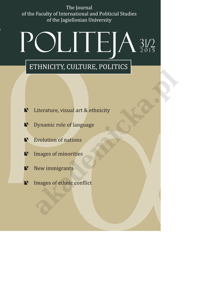 ad e ak ic ka . m pl Publisher: Fundacja Centrum Dokumentacji Czynu Niepodległościowego Al. Mickiewicza 22, 30-059 Kraków [email protected] Distribution: www.akademicka.pl ISSN 1733-6716 ad e Editor: Justyna Wójcik pl ‘POLITEJA. The Journal of the Faculty of International and Political Studies of the Jagiellonian University’ ul. Piłsudskiego 13, room 209 31-110 Krakow tel.: 12 663 34 74, fax: 12 421 53 65 [email protected] www.politeja.wsmip.uj.edu.pl ic ka . Publication released in two versions: electronic and printed. The primary version of the journal is the electronic format. Reviewers Saad Abudayeh ( Jordan University) Jolanta Ambrosewicz-Jacobs ( Jagiellonian University) Roman Bäcker (Nicolaus Copernicus University in Toruń) Szymon Bachrynowski (SWPS – University of Social Sciences and Humanities) Monika Banaś ( Jagiellonian University) Marek Bankowicz ( Jagiellonian University) Włodzimierz Bernacki ( Jagiellonian University) Dariusz Bolechów (Uniwersity of Wrocław) Maksim Bulachtin (Perm University) Wojciech Burszta (SWPS – University of Social Sciences and Humanities) Adam Chmielewski (Uniwersity of Wrocław) Joachim Diec ( Jagiellonian University) Artur Demchuk (Lomonosov Moscow State University) Andrzej Dudek ( Jagiellonian University) Bogdan Góralczyk (Uniwersity of Warsaw) Sławomir Kapralski (Pedagogical University of Cracow) Wojciech Kaute (University of Silesia in Katowice) Wawrzyniec Konarski ( Jagiellonian University) Leszek Korporowicz ( Jagiellonian University) Krzysztof Kościelniak ( Jagiellonian University) Barbara Krauz-Mozer ( Jagiellonian University) Paulina Kewes (University of Oxford) Jan Lencznarowicz ( Jagiellonian University) Krzysztof Liedel (Collegium Civitas) Marek Maciejewski (Uniwersity of Wrocław) Gerhard Meiser (Universität Halle) Włodzimierz Mich (Maria Curie-Skłodowska University in Lublin) Ewa Michna ( Jagiellonian University) Jan Muś (SWPS – University of Social Sciences and Humanities) Tadeusz Paleczny ( Jagiellonian University) Jarosław Rokicki (Andrzej Frycz Modrzewski Krakow University) Izabella Rusinowa (Uniwersity of Warsaw) Andrea Schmidt (Pecs University) Mieczysław Smoleń ( Jagiellonian University) Lech Sokół (SWPS – University of Social Sciences and Humanities) Barbara Stoczewska ( Jagiellonian University) Lucjan Suchanek (State Higher Vocational School in Oświęcim) Krzysztof Szczerski ( Jagiellonian University) Jerzy Szczupaczyński (Uniwersity of Warsaw) Dariusz Szpoper (Uniwersity of Gdańsk) Janusz J. Węc ( Jagiellonian University) Elżbieta Wiącek ( Jagiellonian University) Andrzej Wierzbicki (Uniwersity of Wrocław) Howard Williams (Aberystwyth University) Ryszard Zięba (Uniwersity of Warsaw) m Sustaining institutions: Ministry of Science and Higher Education and Faculty of International and Political Studies of the Jagiellonian University. Front cover: Łukasz Fyderek Typesetting and layout: Studio ANATTA www.anatta.pl ak Published in the e-book form plus 150 paper copies Ilość punktów na liście BMNiSzW: 13 pkt. “Politeja” is Studies of th field of broad invite academ submit schol same time rev final decision process. The discipline. Formal re 1. Texts 2. The notes biblio 3. On th 4. The t tion o exam uj.edu 5. Footn the “P The Journal of the Faculty of International and Political Studies of the Jagiellonian University POLITEJA NO. 8 (31/2) Kraków 2015 Ethnicity, Culture, Politics ad e m ic ka . Editorial Board Prof. Jerzy Axer (Uniwersytet Warszawski) Prof. Andrea Ciampani (LUMSA, Roma) Prof. Břetislav Dančak (Masaryk University, Brno) Prof. Rahul Peter Das (Martin-Luther-Universität Halle-Wittenberg) Prof. Taras Finikov (KROK University, Kyiv) Prof. Saleh K. Hamarneh ( Jordan University) Prof. Ferenc Hörcher (Pázmány Péter Catholic University, Budapest) Prof. Alvydas Jokubaitis (Vilnius University) Prof. Wiesław Kozub-Ciembroniewicz (Instytut Nauk Politycznych i Stosunków Międzynarodowych UJ) Prof. Zdzisław Mach (Instytut Europeistyki UJ) Prof. Andrzej Mania (Instytut Nauk Politycznych i Stosunków Międzynarodowych UJ) Prof. Tadeusz Paleczny (Instytut Studiów Międzykulturowych UJ) Prof. Dorota Praszałowicz (Instytut Amerykanistyki i Studiów Polonijnych UJ) Prof. Anna Raźny (Instytut Rosji i Europy Wschodniej UJ) Prof. John Robertson (Cambridge University) Prof. Irena Stawowy-Kawka (Instytut Nauk Politycznych i Stosunków Międzynarodowych UJ) Prof. Noël O’Sullivan (University of Hull) Prof. Adam Walaszek (Instytut Amerykanistyki i Studiów Polonijnych UJ) Prof. Andrey Yuriyevich Shutov (Lomonosov Moscow State University) Prof. Andrzej Zięba (Instytut Nauk Politycznych i Stosunków Międzynarodowych UJ) pl Edited by Wawrzyniec Konarski, Karolina Golemo and Małgorzata Kołaczek Chief Editor Prof. Bogdan Szlachta (Instytut Nauk Politycznych i Stosunków Międzynarodowych UJ) ak Managing Editors Dr hab. Dorota Pietrzyk-Reeves (Instytut Nauk Politycznych i Stosunków Międzynarodowych UJ) Dr Arkadiusz Górnisiewicz (Instytut Nauk Politycznych i Stosunków Międzynarodowych UJ) Table of Contents 5 Wawrzyniec Konarski, Karolina Golemo, Małgorzata Kołaczek, Preface Literature, visual art & ethnicity 11 Małgorzata Ossowska-Czader, The Rushdie Affair – Politics, Culture and Ethnicity in Hanif Kureishi’s The Black Album Dynamic role of language Wawrzyniec Konarski, The Application of Language as a Tool for Ethnopolitics in Europe – Selected Remarks 67 ic ka . 45Laszlo Marácz, The Politics of Language Policies: Hungarian Linguistic Minorities in Central Europe pl 27 Roman Szul, (In)Equality of Languages in the EU and Its Economic and Political Consequences Evolution of nations Antonio Violante, From black hole to the pearl of the Mediterranean: a new idea of nation for independent Montenegro 93 Peter Smuk, The Concept of the Nation in the Fundamental Law of Hungary m 81 ad e Images of minorities 111 Joanna Talewicz-Kwiatkowska, Roma immigrants in Western Europ