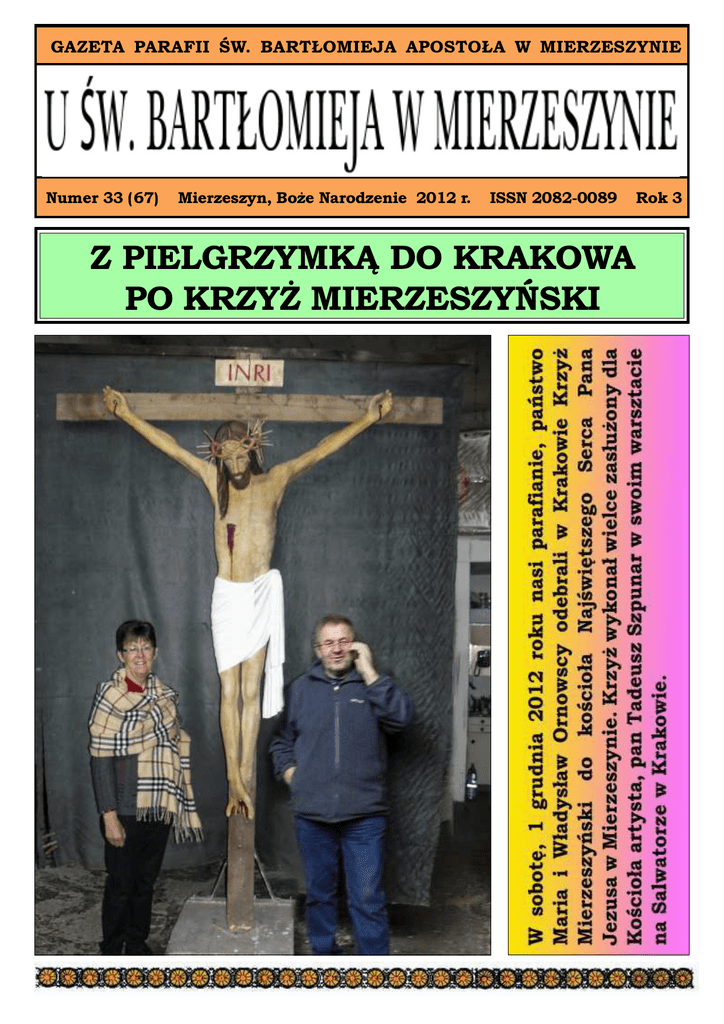GAZETA PARAFII ŚW. BARTŁOMIEJA APOSTOŁA W MIERZESZYNIE Numer 33 (67) Mierzeszyn, Boże Narodzenie 2012 r. ISSN 2082-0089 Z PIELGRZYMKĄ DO KRAKOWA PO KRZYŻ MIERZESZYŃSKI Rok 3 U ŒW. BART£OMIEJA W MIERZESZYNIE - nr 33(67) Boże Narodzenie 2012 2 PRZED NAMI PAN JEZUS NA KRZYŻU Wreszcie dociera do nas informacja od ks. Andrzeja, figura Pana Jezusa jest gotowa. Nie zastanawiamy się długo. Pakujemy manatki i ruszamy w drogę. Jest południe w piątek. Zamierzamy przenocować na Jasnej Górze. Autostradę A1 do Torunia, dalej drogę od Kowala do Strykowa pokonujemy bez żadnych problemów. Ale, pozostał jeszcze odcinek z Torunia do wylotu z Włocławka, no i przebicie się przez Łódź. Tych odcinków nie polecamy, zwłaszcza w piątek. Mimo wszystko udało się, zdążyliśmy na Apel Jasnogórski. W sobotę wcześnie rano po paciorku, śniadaniu i pożegnaniu z Matką Jasnogórską ruszamy do Krakowa. To już rzut beretem. Z panem Tadeuszem Szpunarem, artystą rzeźbiarzem, umówieni jesteśmy na dziesiątą. Na drodze niewielkie korki, ale się udało. Jesteśmy trzy minuty przed umówioną godziną. Wchodzimy do pracowni i ... oniemieliśmy z wrażenia i zachwytu. Przed nami Pan Jezus na Krzyżu - wielki, potężny, wręcz porażający - uczący pokory. Mamy mało czasu, chcemy szybko wracać. Przy małej czarnej szybka rozmowa, trochę o historii, sztuce i oczywiście życiu. Pod krzyżem stają niewiasty w sumie trzy: Marysia oraz żona i córka pana Tadeusza. Trzeba naszą figurę zdjąć z prowizorycznego - roboczego krzyża, na którym był rzeźbiony, zabezpieczyć i zapakować - na materace w samochodzie; jeszcze pasy bezpieczeństwa, czyli zamocowanie. Gotowe. Szok, pan Tadeusz ukradkiem ociera łzy. Co się stało, pyta Marysia? Tak bywa i często mi się zdarza, iż trudno mi rozstać się z moimi pracami. Przecież razem w pracowni spędziliśmy ponad pół roku. Powiem prawdę. Ja najchętniej bym zostawił tę rzeźbę w mojej pracowni. Ale trudno, niech służy pogłębianiu wiary w Waszej parafii - zakończył artysta na pożegnanie. Droga powrotna bez korków, utrudnień, bez żadnych problemów szybko minęła. W późnych godzinach wieczornych z naszym Pasażerem szczęśliwie docieramy do pana Józefa - artysty kaszubskiego w Barwiku koło Pomieczyna. ... I już czekamy na sygnał do przewozu całego ołtarza. MARYSIA I WŁADEK ORNOWSCY KRZYŻ i CZŁOWIEK Już niebawem będąc w kościele Najświętszego Serca Pana Jezusa w Mierzeszynie zobaczymy nowy ołtarz boczny. W centrum ołtarza będzie widoczna pokaźnych rozmiarów rzeźba Jezusa Ukrzyżowanego. To dzieło znakomitego artysty pana Tadeusza Szpunara z Krakowa. Kim jest rzeźbiarz, spod którego rąk ,,wyszła” ta niesamowita postać Chrystusa? Tadeusz Szpunar urodził się 3 listopada 1929 roku w Soninie k. Łańcuta. Studiował w pracowni Xawerego Dunikowskiego na Wydziale rzeźby Akademii Sztuk Pięknych w Krakowie (1950-1956). Debiutował na wystawie ,,Xawery Dunikowski i jego uczniowie” (Warszawa 1955). Brał udział w kilkudziesięciu wystawach zbiorowych w kraju i za granicą. Realizuje rzeźby związane z architekturą, od 1960 roku głównie sakralną. Uczestniczył w konkursach na projekty rzeźb pomnikowych, w których zdobył liczne nagrody i wyróżnienia. Jego prace znajdują się w zbiorach Muzeum Narodowego w Krakowie i w Warszawie oraz w zbiorach prywatnych. Mieszka i pracuje w Krakowie. Rzeźba Chrystusa z Mierzeszyna wyszła więc z rąk znakomitego Mistrza. Przez przeszło pięćdziesiąt lat Mistrz z Krakowa wykonał 31 dużych rzeźb Chrystusa Ukrzyżowanego, dziesiątki figur Madonny i Świętych Pańskich. W rozmowie ze mną pan Tadeusz Szpunar stwierdził, że rzeźba Chrystusa dla Mierzeszyna jest chyba jego ostatnią pracą takiego formatu. Ta praca nad Ukrzyżowanym trwała od kwietnia do końca listopada 2012 roku. Trudno sobie wyobrazić, że to dzieło wykonał 83. letni człowiek. A jednak! A jednak Bóg posługuje się takimi ludźmi. Mistrz z Krakowa życzył nam: ,,Niech ta rzeźba tylko pomaga ludziom zbliżyć się do Boga” Krótkie zdanie, ale jakże głębokie... Niech tak się dzieje! Bardzo dziękuję panu Tadeuszowi Szpunarowi za wykonanie wielkiego dzieła dla kościoła Najświętszego Serca Pana Jezusa w Mierzeszynie. Dziękuję państwu Marii i Władysławowi Ornowskim za trud przywiezienia rzeźby z Krakowa. Dziękuję wszystkim drogim Ofiarodawcom tego dzieła. Chrystus nas odkupił przez swoją mękę na Krzyżu. Niech Krzyż Mierzeszyński o tym nam nieustannie przypomina. Szczęść Boże! ks. ANDRZEJ SOWIŃSKI U ŒW. BART£OMIEJA W MIERZESZYNIE - nr 33(67) Boże Narodzenie 2012 3 Mierzeszyn, Boże Narodzenie 2012 roku Drodzy Parafianie! W naszej polskiej tradycji Święta Bożego Narodzenia przeżywane są w wyjątkowej atmosferze rodzinnej. Wigilijny i świąteczny stół gromadzi wokół Nowonarodzonego całe pokolenia Polek i Polaków, którzy zachowując tradycje ojców w geście pojednania przełamują się białym opłatkiem, by następnie z radosnym sercem uczestniczyć w uroczystej Pasterce. Tak jest także u nas, w Parafii św. Bartłomieja Apostoła w Mierzeszynie. Moi Drodzy! Życzę Wam z okazji Świąt Narodzenia Pańskiego i Nowego Roku Pańskiego 2013 pokornego zapatrzenia się w tajemnicę żłóbka oraz odpowiedzialności za własny los, rodziny, parafii i Ojczyzny. Przyjmijcie Chrystusa do Waszych domów i otwórzcie się na błogosławieństwo, które On przynosi. Tylko bowiem w ten sposób Wasze serca i domy opromienione zostaną miłością i pokojem, a Waszej zmęczonej odwadze przybędzie mocy Bożych, czego Wam z całego serca życzę, obejmując moją szczerą modlitwą. ks. ANDRZEJ SOWIŃSKI proboszcz Parafii św. Bartłomieja Apostoła w Mierzeszynie U ŒW. BART£OMIEJA W MIERZESZYNIE - nr 33(67) Boże Narodzenie 2012 4 INGRES KSIĘDZA BISKUPA DIECEZJALNEGO RYSZARDA KASYNY DO BAZYLIKI KATEDRALNEJ W PELPLINIE Ks. Arcybis