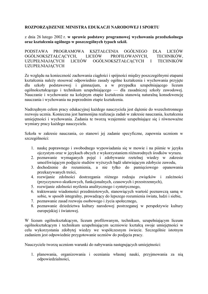 ROZPORZĄDZENIE MINISTRA EDUKACJI NARODOWEJ I SPORTU z dnia 26 lutego 2002 r. w sprawie podstawy programowej wychowania przedszkolnego oraz kształcenia ogólnego w poszczególnych typach szkół. PODSTAWA PROGRAMOWA KSZTAŁCENIA OGÓLNEGO DLA LICEÓW OGÓLNOKSZTAŁCĄCYCH, LICEÓW PROFILOWANYCH, TECHNIKÓW, UZUPEŁNIAJĄCYCH LICEÓW OGÓLNOKSZTAŁCĄCYCH I TECHNIKÓW UZUPEŁNIAJĄCYCH Ze względu na konieczność zachowania ciągłości i spójności między poszczególnymi etapami kształcenia należy stosować odpowiednio zasady ogólne kształcenia i wychowania przyjęte dla szkoły podstawowej i gimnazjum, a w przypadku uzupełniającego liceum ogólnokształcącego i technikum uzupełniającego — dla zasadniczej szkoły zawodowej. Nauczanie i wychowanie na kolejnym etapie kształcenia stanowią naturalną konsekwencję nauczania i wychowania na poprzednim etapie kształcenia. Nadrzędnym celem pracy edukacyjnej każdego nauczyciela jest dążenie do wszechstronnego rozwoju ucznia. Konieczna jest harmonijna realizacja zadań w zakresie nauczania, kształcenia umiejętności i wychowania. Zadania te tworzą wzajemnie uzupełniające się i równoważne wymiary pracy każdego nauczyciela. Szkoła w zakresie nauczania, co stanowi jej zadanie specyficzne, zapewnia uczniom w szczególności: 1. naukę poprawnego i swobodnego wypowiadania się w mowie i na piśmie w języku ojczystym oraz w językach obcych z wykorzystaniem różnorodnych środków wyrazu. 2. poznawanie wymaganych pojęć i zdobywanie rzetelnej wiedzy w zakresie umożliwiającym podjęcie studiów wyższych bądź ułatwiającym zdobycie zawodu, 3. dochodzenie do rozumienia, a nie tylko do pamięciowego opanowania przekazywanych treści, 4. rozwijanie zdolności dostrzegania różnego rodzaju związków i zależności (przyczynowo-skutkowych, funkcjonalnych, czasowych i przestrzennych), 5. rozwijanie zdolności myślenia analitycznego i syntetycznego, 6. traktowanie wiadomości przedmiotowych, stanowiących wartość poznawczą samą w sobie, w sposób integralny, prowadzący do lepszego rozumienia świata, ludzi i siebie, 7. poznawanie zasad rozwoju osobowego i życia społecznego, 8. poznawanie dziedzictwa kultury narodowej postrzeganej w perspektywie kultury europejskiej i światowej. W liceum ogólnokształcącym, liceum profilowanym, technikum, uzupełniającym liceum ogólnokształcącym i technikum uzupełniającym uczniowie kształcą swoje umiejętności w celu wykorzystania zdobytej wiedzy we współczesnym świecie. Szczególnie istotnym zadaniem jest odpowiednie przygotowanie uczniów do podjęcia pracy. Nauczyciele tworzą uczniom warunki do nabywania następujących umiejętności: 1. planowania, organizowania i oceniania własnej nauki, przyjmowania za nią odpowiedzialności, 2. skutecznego porozumiewania się w różnych sytuacjach, prezentacji własnego punktu widzenia i uwzględniania poglądów innych ludzi, poprawnego posługiwania się językiem ojczystym, językami obcymi oraz przygotowywania do publicznych wystąpień, 3. efektywnego współdziałania w zespole, budowania więzi międzyludzkich, podejmowania indywidualnych i grupowych decyzji, skutecznego działania na gruncie zachowania obowiązujących norm, 4. rozwiązywania problemów w twórczy sposób, 5. poszukiwania, porządkowania i wykorzystywania informacji z różnych źródeł, efektywnego posługiwania się technologiami informacyjnymi i komunikacyjnymi, 6. odnoszenia do praktyki zdobytej wiedzy oraz tworzenia potrzebnych doświadczeń i nawyków, 7. rozwijania sprawności umysłowych oraz osobistych zainteresowań, 8. przyswajania sobie metod i technik negocjacyjnego rozwiązywania konfliktów i problemów społecznych. W swojej pracy wychowawczej nauczyciele wspierają rodziców w realizacji ich zadań wychowawczych, tak aby umożliwiać uczniom przejmowanie odpowiedzialności za własne życie i rozwój osobowy. Nauczyciele tworzą w szkole środowisko sprzyjające zarówno wszechstronnemu rozwojowi osobowemu uczniów (w wymiarze fizycznym — w tym zdrowotnym, psychicznym, intelektualnym, moralnym i duchowym), jak i ich rozwojowi społecznemu, wspierając przy tym: 1. rozwijanie dociekliwości poznawczej, ukierunkowanej na poszukiwanie prawdy, dobra i piękna w świecie, 2. poczucie użyteczności zarówno poszczególnych przedmiotów nauczania, jak i całej edukacji na danym etapie, 3. dążenie do dobra w jego wymiarze indywidualnym i społecznym, umiejętne godzenie dobra własnego z dobrem innych, odpowiedzialności za siebie z odpowiedzialnością za innych, wolności własnej z wolnością innych, 4. poszukiwanie, odkrywanie i dążenie na drodze rzetelnej pracy do osiągnięcia wielkich celów życiowych i wartości ważnych dla odnalezienia własnego miejsca w świecie, 5. przygotowywanie się do życia w rodzinie, w społeczności lokalnej i w państwie, 6. dążenie do rozpoznawania wartości moralnych, dokonywania wyborów i hierarchizacji wartości, 7. kształtowanie w sobie postawy dialogu, umiejętności słuchania innych i rozumienia ich poglądów. Uczniowie liceów ogólnokształcących, liceów profilowanych, techników, a także uzupełniających liceów ogólnokształcących i techników uzupełniających są przygotowywani w szczególności do podejmowania wyzwań współczesnego świata, takich jak: integracja, globalizacja, wymiana informacji, postęp naukowo-techniczny. Wszechstronny rozwój ucznia oraz zrównoważony rozwój kraju wymagają, aby osnowę programów nauczania i programów wychowania w liceach ogólnokształcących, liceach profilowanych, technikach, uzupełniających liceach ogólnokształcących i technikach uzupełniających stanowiły równocześnie: otwartość na świat, ale i tożsamość oparta na dziedzictwie kultury własnej ojczyzny; wiedza ogólna i umiejętność jej praktycznego wykorzystywania, ale także zdolność rozumienia i definiowania zmiennej rzeczywistości; śmiałe