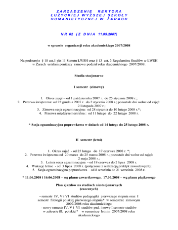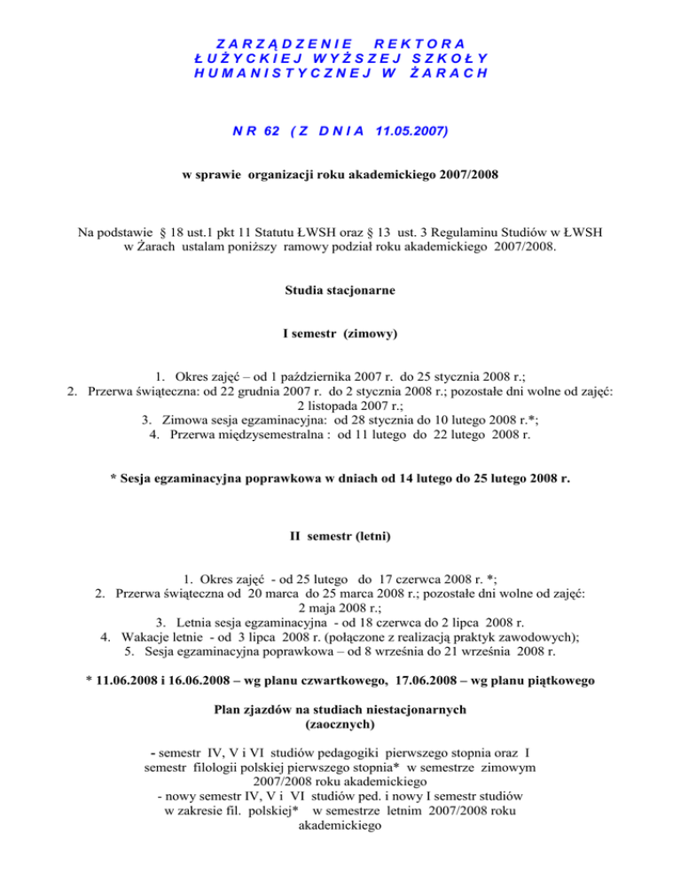 ZARZĄDZENIE REKTORA ŁUŻYCKIEJ WYŻSZEJ SZKOŁY HUMANISTYCZNEJ W ŻARACH N R 62 ( Z D N I A 11.05.2007) w sprawie organizacji roku akademickiego 2007/2008 Na podstawie § 18 ust.1 pkt 11 Statutu ŁWSH oraz § 13 ust. 3 Regulaminu Studiów w ŁWSH w Żarach ustalam poniższy ramowy podział roku akademickiego 2007/2008. Studia stacjonarne I semestr (zimowy) 1. Okres zajęć – od 1 października 2007 r. do 25 stycznia 2008 r.; 2. Przerwa świąteczna: od 22 grudnia 2007 r. do 2 stycznia 2008 r.; pozostałe dni wolne od zajęć: 2 listopada 2007 r.; 3. Zimowa sesja egzaminacyjna: od 28 stycznia do 10 lutego 2008 r.*; 4. Przerwa międzysemestralna : od 11 lutego do 22 lutego 2008 r. * Sesja egzaminacyjna poprawkowa w dniach od 14 lutego do 25 lutego 2008 r. II semestr (letni) 1. Okres zajęć - od 25 lutego do 17 czerwca 2008 r. *; 2. Przerwa świąteczna od 20 marca do 25 marca 2008 r.; pozostałe dni wolne od zajęć: 2 maja 2008 r.; 3. Letnia sesja egzaminacyjna - od 18 czerwca do 2 lipca 2008 r. 4. Wakacje letnie - od 3 lipca 2008 r. (połączone z realizacją praktyk zawodowych); 5. Sesja egzaminacyjna poprawkowa – od 8 września do 21 września 2008 r. * 11.06.2008 i 16.06.2008 – wg planu czwartkowego, 17.06.2008 – wg planu piątkowego Plan zjazdów na studiach niestacjonarnych (zaocznych) - semestr IV, V i VI studiów pedagogiki pierwszego stopnia oraz I semestr filologii polskiej pierwszego stopnia* w semestrze zimowym 2007/2008 roku akademickiego - nowy semestr IV, V i VI studiów ped. i nowy I semestr studiów w zakresie fil. polskiej* w semestrze letnim 2007/2008 roku akademickiego Zjazd I II III IV V VI VII VIII IX X XI Semestr - zimowy Data 21-23 września 2007 r. 5-7 października 2007 r. 19-21 października 2007 r. 3-4 listopada 2007 r. 16-18 listopada 2007 r. 30 listopada – 2 grudnia 2007 r. 14-16 grudnia 2007 r. 4-6 stycznia 2008 r. 18-20 stycznia 2008 r. 1-3 lutego 2008 r. 15-17 lutego 2008 r. Zjazd I II III IV V VI VII VIII IX X XI Semestr - letni Data 29 lutego-2 marca 2008 r. 14-16 marca 2008 r. 28-30 marca 2008 r. 11-13 kwietnia 2008 r. 25-27 kwietnia 2008 r. 9-11 maja 2008 r. 23-25 maja 2008 r. 6-8 czerwca 2008 r. 20-22 czerwca 2008 r. 27-29 czerwca 2008 r. 4-6 lipca 2008 r. - semestr I , II, III studiów pedagogiki pierwszego stopnia w semestrze zimowym 2007/2008 roku akademickiego - nowy semestr I, II i III studiów ped. I st. i II semestr studiów fil. polskiej pierwszego stopnia * w semestrze letnim 2007/2008 roku akademickiego Semestr I – zimowy Semestr II - letni Zjazd Data Zjazd Data I 28-30 września 2007 r. I 7-9 marca 2008 r. II 12-14 października 2007 r. II 28-30 marca 2008 r., III 26-28 października 2007 r. III 4-6 kwietnia 2008 r. IV 9-10 listopada 2007 r. IV 18-20 kwietnia 2008 r. V 23-25 listopada 2007 r. V 4 maja 2008 r. VI 7-9 grudnia 2007 r. VI 16 -18 maja 2008 r. VII 11-13 stycznia 2008 r. VII 30-31 maja i 1 czerwca 2008 VIII 25-27 stycznia 2008 r. VIII 13-15 czerwca 2008 r. IX 8-10 lutego 2008 r. IX 20-22 czerwca 2008 r. X 15 -17lutego 2008 r. X 27-29 czerwca 2008 r. XI 22-24 lutego 2008 r. XI 4-6 lipca 2008 r. * pod warunkiem uzyskania uprawnienia do prowadzenia tego kierunku studiów Egzaminy i zaliczenia na studiach niestacjonarnych będzie można uzyskiwać w trakcie poszczególnych semestrów, w ramach tzw. sesji ciągłej. Przewiduje się ponadto następujące terminy poprawkowych sesji egzaminacyjnych dla słuchaczy studiów zaocznych: po zakończeniu zajęć w semestrze zimowym, w dniach 25 lutego - 9 marca 2008 roku oraz po zakończeniu zajęć w semestrze letnim, w dniach: 8-21 września 2008 roku. W przypadku uzyskania uprawnień do prowadzenia zajęć na studiach magisterskich (II stopnia) na kierunku pedagogika planuje się następujące terminy zajęć: - w semestrze zimowym dla I semestru tych studiów wg kalendarza dla I, II i III semestru studiów I stopnia, w semestrze letnim dla II już semestru st. magisterskich wg kalendarza także dla I, II i III semestru studiów I stopnia; - w semestrze letnim dla naboru śródrocznego studiów magisterskich w zakresie pedagogiki wg kalendarza dla IV, V i VI semestru studiów pierwszego stopnia. Rektor ŁWSH dr hab. Wiesław Jamrożek prof. ŁWSH