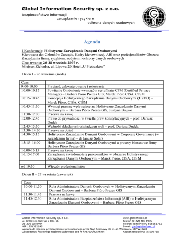 Global Information Security sp. z o.o. bezpieczeństwo informacji zarządzanie ryzykiem ochrona danych osobowych Agenda I Konferencja: Holistyczne Zarządzanie Danymi Osobowymi Kierowana do: Członków Zarządu, Kadry kierowniczej, ABI oraz profesjonalistów Obszaru Zarządzania firmą, ryzykiem, audytem i ochrony danych osobowych Czas trwania: 26-28 września 2007 r. Miejsce: Zielonka, ul. Lipowa 20 Hotel „U Pietrzaków” Dzień I – 26 września (środa) Czas 9:00-10:00 10:00-10:15 10:15-10:45 10:45-11:30 11:30-12:00 12:00-12:45 12:45-13:30 13:30- 14:30 14:30-15:15 15:15- 16:00 16.00-16.15 16.15-17.00 od 19:30 Przyjazd, zakwaterowanie i rejestracja Powitanie Omówienie wymogów certyfikatu CPM (Certified Privacy Manager) – Barbara Pióro Prezes GIS; Marek Pióro CISA, CISM Koncepcja Holistycznego Zarządzania Danymi Osobowymi (HZDO) – Marek Pióro, CISA, CISM Wymogi prawne wpływające na Holistyczne Zarządzanie Danymi Osobowymi – Barbara Pióro Prezes GIS, Justyna Brejwo Przerwa na kawę Prawo do prywatności w świetle praw konstytucyjnych – prof. Dariusz Dudek Ważność składanych oświadczeń woli – prof. Dariusz Dudek Przerwa na obiad Holistyczne Zarządzanie Danymi Osobowymi w Corporate Governance (w zarządzaniu firmą) – dr Janusz Solarz Holistyczne Zarządzanie Danymi Osobowymi a procesy biznesowe firmy – Barbara Pióro Prezes GIS Przerwa na kawę Zarządzanie świadomością pracowników w obszarze Holistycznego Zarządzania Danymi Osobowymi – Marek Pióro, CISA, CISM Wieczór profesjonalistów Dzień II – 27 września (czwartek) Czas 10:00-11.30 11.30-11.45 11.45-12.30 Rola Administratora Danych Osobowych w Holistycznym Zarządzaniu Danymi Osobowymi – Barbara Pióro Prezes GIS Przerwa na kawę Rola Administratora Bezpieczeństwa Informacji (ABI) w Holistycznym Zarządzaniu Danymi Osobowymi – Barbara Pióro Prezes GIS Global Information Security sp. z o.o. www.globinfosec.pl ul. Królowej Jadwigi 7 lok. 16 Telefon (0-22) 406 1985 05-200 Wołomin Telefon komórkowy 605651763 NIP 1251382695 E-mail: [email protected] wpisana do rejestru przedsiębiorców prowadzonego przez Sąd Rejonowy dla m.st. Warszawy, XIV Wydział Gospodarczy Krajowego Rejestru Sądowego pod nr KRS 0000254640; Kapitał zakładowy: 75.000 PLN Global Information Security sp. z o.o. bezpieczeństwo informacji zarządzanie ryzykiem ochrona danych osobowych 12.30-12.45 12.45-13.30 13:30-14.30 14:30-15:15 15.15-15.30 15.30-16.15 16.15-17.00 od 19:30 Przerwa na kawę Wpływ orzeczeń sądów na procesy biznesowe – Mec Arwid Mednis Przerwa na obiad Kontrola Wewnętrzna (COSO) i Zarządzanie Ryzykiem (COSO ERM) w Holistycznym Zarządzaniu Danymi Osobowymi – dr Janusz Solarz Przerwa na kawę Koncepcja audytu (opartego o ryzyko) obszaru Holistycznego Zarządzania Danymi Osobowymi – Marek Pióro, CISA, CISM Dokumentacja w Holistycznym Zarządzaniu Danymi Osobowymi – Barbara Pióro Prezes GIS Wieczór niespodzianka Dzień III – 28 września (piątek) Czas 10:00-10.45 10.45-11.00 11.00-12.00 12:00-12.30 12:30-13:00 13:00 Holistyczne Zarządzanie Danymi Osobowymi – zarządzanie dokumentacją w praktyce – Bogdan Babiak, Trident Software Group Przerwa na kawę Podsumowanie Holistycznego Zarządzania Danymi Osobowymi – Marek Pióro, CISA, CISM Wręczenie zaświadczeń uczestnictwa w Konferencji – Marek Pióro, CISA, CISM, Konsultacje indywidualne z uczestnikami Konferencji Obiad Organizator zastrzega prawo zmiany Agendy Global Information Security sp. z o.o. www.globinfosec.pl ul. Królowej Jadwigi 7 lok. 16 Telefon (0-22) 406 1985 05-200 Wołomin Telefon komórkowy 605651763 NIP 1251382695 E-mail: [email protected] wpisana do rejestru przedsiębiorców prowadzonego przez Sąd Rejonowy dla m.st. Warszawy, XIV Wydział Gospodarczy Krajowego Rejestru Sądowego pod nr KRS 0000254640; Kapitał zakładowy: 75.000 PLN