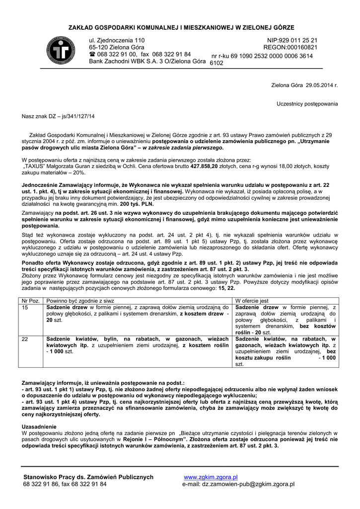 Z A KŁ AD G O S P O DA R K I KO M U NAL N E J I M IE S Z KA NI O W E J W Z IE L O N E J G Ó RZ E ul. Zjednoczenia 110 NIP:929 011 25 21 65-120 Zielona Góra REGON:000160821 068 322 91 00, fax 068 322 91 84 nr r-ku 69 1090 2532 0000 0006 3614 Bank Zachodni WBK S.A. 3 O/Zielona Góra 6102 Zielona Góra 29.05.2014 r. Uczestnicy postępowania Nasz znak DZ – js/341/127/14 Zakład Gospodarki Komunalnej i Mieszkaniowej w Zielonej Górze zgodnie z art. 93 ustawy Prawo zamówień publicznych z 29 stycznia 2004 r. z póź. zm. informuje o unieważnieniu postępowania o udzielenie zamówienia publicznego pn. „Utrzymanie pasów drogowych ulic miasta Zielona Góra” – w zakresie zadania pierwszego. W postępowaniu oferta z najniższą ceną w zakresie zadania pierwszego została złożona przez: „TAXUS” Małgorzata Guran z siedzibą w Ochli. Cena ofertowa brutto 427.858,20 złotych, cena r-g wynosi 18,00 złotych, koszty zakupu materiałów – 20%. Jednocześnie Zamawiający informuje, że Wykonawca nie wykazał spełnienia warunku udziału w postępowaniu z art. 22 ust. 1. pkt. 4), tj w zakresie sytuacji ekonomicznej i finansowej. Wykonawca nie wykazał, iż posiada opłaconą polisę, a w przypadku jej braku inny dokument potwierdzający, że jest ubezpieczony od odpowiedzialności cywilnej w zakresie prowadzonej działalności na kwotę gwarancyjną min. 200 tyś. PLN. Zamawiający na podst. art. 26 ust. 3 nie wzywa wykonawcy do uzupełnienia brakującego dokumentu mającego potwierdzić spełnienie warunku w zakresie sytuacji ekonomicznej i finansowej, gdyż mimo uzupełnienia konieczne jest unieważnienie postępowania. Stąd też wykonawca zostaje wykluczony na podst. art. 24 ust. 2 pkt 4), tj. nie wykazali spełnienia warunków udziału w postępowaniu. Oferta zostaje odrzucona na podst. art. 89 ust. 1 pkt 5) ustawy Pzp, tj. została złożona przez wykonawcę wykluczonego z udziału w postępowaniu o udzielenie zamówienia lub niezaproszonego do składania ofert. Ofertę wykonawcy wykluczonego uznaje się za odrzuconą – art. 24 ust. 4 ustawy Pzp. Ponadto oferta Wykonawcy zostaje odrzucona, gdyż zgodnie z art. 89 ust. 1 pkt. 2) ustawy Pzp, jej treść nie odpowiada treści specyfikacji istotnych warunków zamówienia, z zastrzeżeniem art. 87 ust. 2 pkt. 3. Złożony przez Wykonawcę formularz cenowy jest niezgodny ze specyfikacją istotnych warunków zamówienia i nie jest możliwe jego poprawienie przez zamawiającego na podstawie art. 87 ust. 2 pkt. 3 ustawy Pzp. Powyższe dotyczy modyfikacji opisów zadania w następujących pozycjach cenowych złożonego formularza cenowego: 15, 22. Nr Poz. 15 Powinno być zgodnie z siwz Sadzenie drzew w formie piennej, z zaprawą dołów ziemią urodzajną do połowy głębokości, z palikami i systemem drenarskim, z kosztem drzew 20 szt. 22 Sadzenie kwiatów, bylin, na rabatach, w gazonach, wieżach kwiatowych itp. z uzupełnieniem ziemi urodzajnej, z kosztem roślin - 1 000 szt. W ofercie jest Sadzenie drzew w formie piennej, z zaprawą dołów ziemią urodzajną do połowy głębokości, z palikami i systemem drenarskim, bez kosztów roślin - 20 szt. Sadzenie kwiatów, na rabatach, w gazonach, wieżach kwiatowych itp. z uzupełnieniem ziemi urodzajnej, bez kosztu zakupu roślin - 1 000 szt. Zamawiający informuje, iż unieważnia postępowanie na podst.: - art. 93 ust. 1 pkt 1) ustawy Pzp, tj. nie złożono żadnej oferty niepodlegającej odrzuceniu albo nie wpłynął żaden wniosek o dopuszczenie do udziału w postępowaniu od wykonawcy niepodlegającego wykluczeniu; - art. 93 ust. 1 pkt 4) ustawy Pzp, tj. cena najkorzystniejszej oferty lub oferta z najniższą ceną przewyższą kwotę, którą zamawiający zamierza przeznaczyć na sfinansowanie zamówienia, chyba że zamawiający może zwiększyć tę kwotę do ceny najkorzystniejszej oferty. Uzasadnienie W postępowaniu złożono jedną ofertę na zadanie pierwsze pn „Bieżące utrzymanie czystości i pielęgnacja terenów zielonych w pasach drogowych ulic usytuowanych w Rejonie I – Północnym”. Złożona oferta zostaje odrzucona ponieważ jej treść nie odpowiada treści specyfikacji istotnych warunków zamówienia, z zastrzeżeniem art. 87 ust. 2 pkt. 3. Stanowisko Pracy ds. Zamówień Publicznych 68 322 91 86, fax 68 322 91 84 www.zgkim.zgora.pl e-mail: [email protected] Ponadto cena złożonej w postępowaniu oferty przewyższa kwotę jaką zamawiający może przeznaczyć na sfinansowanie zamówienia, tj. kwotę 369.644,31 złotych. Zamawiający nie może zwiększyć kwoty jaką zamierza przeznaczyć na sfinansowanie zamówienia do ceny najniższej oferty. Otrzymują: 1) „TAXUS” Małgorzata Guran, ul. Zielonogórska 1, 66-006 Ochla 2) HORTICULTURA Przedsiębiorstwo Specjalnych Robót Ogrodniczych Dagmara Szczecińska Ul. J. Bema 1, Zjednoczenia 5, 67-100 Nowa Sól 3) Zakład Utrzymania i Urządzania Terenów Zieleni Lech Rabiza, Ul. Kingi 9, 65-215 Zielona Góra 4) Firma Wielobranżowa „DEMAR” Waldemar Tomiak, ul. Budowlana 6, 65-386 Zielona Góra 5) Dział Usług Komunalnych 6) AA Z-CA DYREKTORA ds. Gospodarki Mieszkaniowej (-) Wiktor Fanajło Stanowisko Pracy ds. Zamówień Publicznych 68 322 91 86, fax 68 322 91 84 www.zgkim.zgora.pl e-mail: [email protected]