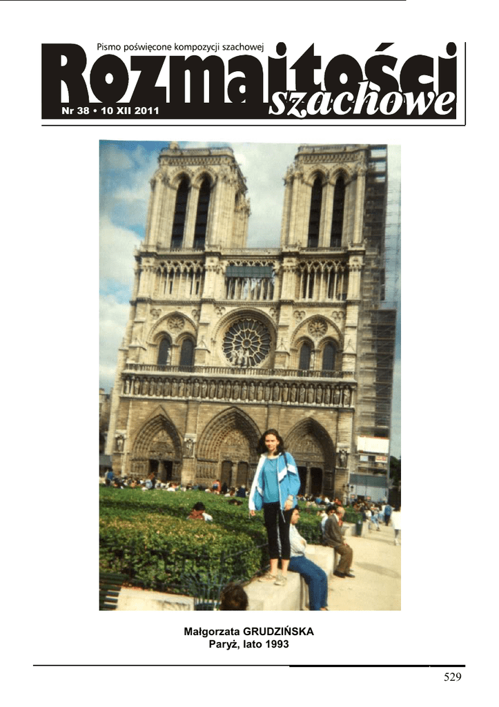 4. MEMORIAŁ MAŁGORZATY GRUDZIŃSKIEJ 2011 Nr 38 • 10 XII 2011 Małgorzata GRUDZIŃSKA ParyŜ, lato 1993 Rozmaitości Szachowe * nr 38 * 10 XII 2011 529 4. MEMORIAŁ MAŁGORZATY GRUDZIŃSKIEJ 2011 Wspomnienie JuŜ szesnaście lat minęło od chwili, gdy 30 stycznia 1995 roku odeszła tragicznie śp. Małgorzata Grudzińska, pogrąŜając w bólu liczne grono rodziny, przyjaciół i znajomych. Ukończyła dopiero 19 lat, bo urodziła się 6 stycznia 1976 roku, i stawała – jak się wszystkim wówczas wydawało – przed perspektywą rychłej realizacji ambitnych zamierzeń, do których sposobiła się od pierwszych świadomych chwil swego Ŝycia. Rodzice – Henryk i ElŜbieta – z radością obserwowali Jej wielkie zamiłowanie do podróŜy i wszelkiego rodzaju wędrówek przejawiające się aktywnym, pełnym entuzjazmu, uczestnictwem w niezliczonych obozach, koloniach letnich i zimowych, rajdach, zapoczątkowane od najmłodszych klas szkoły podstawowej. Tę turystyczną pasję realizowała równieŜ i w latach późniejszych, gdy została uczennicą szkoły średniej. Fascynacja ta uległa wtedy pogłębieniu o przeŜycia religijne, będące skutkiem włączenia się do ekumenicznego ruchu młodzieŜy brata Rogera i udziału w noworocznych spotkaniach w Taizé, Wiedniu, ParyŜu... Czynnie wykorzystywała kaŜdą chwilę swego krótkiego Ŝycia. Obdarzona była wszechstronnymi uzdolnieniami i zainteresowaniami. Jej talenty plastyczne muzyczne pozwalały sądzić, Ŝe i w nadchodzących latach uraduje bliskich i przyjaciół osiągnięciami takŜe i w tych dziedzinach. Interesowała się równieŜ grą w szachy. Rozegrała ze swym ojcem wiele partii szachowych. Wysoko ceniła równieŜ kaŜdy wysiłek fizyczny. Ostatnie swe letnie wakacje spędziła na wytęŜonej pracy fizycznej w Niemczech. Osiągała znakomite wyniki w nauce. Szkołę Podstawową nr 8 im. Władysława Broniewskiego w Jeleniej Górze ukończyła 18 czerwca 1991 roku z wynikiem bardzo dobrym. Od 1 września tego roku stała się uczennicą I Liceum Ogólnokształcącego im. Stefana śeromskiego w Jeleniej Górze. WyróŜniała się tutaj wyjątkowymi uzdolnieniami humanistycznymi. Była Osobą wspaniałą i nieprzeciętną, chlubą i dumą całej swej licznej rodziny, oczekującej, Ŝe do dotychczasowych darów serca, rozumu, talentu i pracy w przyszłości dołoŜy Ona nowe, jeszcze wspanialsze. Dlatego Jej tragiczna śmierć była prawdziwym wstrząsem nie tylko dla rodziny, lecz i wszystkich, którzy Ją znali, kochali i podziwiali. W swą ostatnią podróŜ wyruszyła 2 lutego 1995 roku. Towarzyszyli Jej zrozpaczeni rodzice, krewni, przyjaciele, znajomi, koledzy szkolni i dyrekcja I Liceum Ogólnokształcącego im . Stefana śeromskiego w Jeleniej Górze. Na czele Ŝałobnego konduktu kroczył poczet sztandarowy Szkoły. W czasie pisemnej części egzaminu maturalnego 1995 roku Jej krzesło pozostało puste. Śp. Małgorzata prosi o westchnienie do Boga. 530 Rozmaitości Szachowe * nr 38 * 10 XII 2011 4. MEMORIAŁ MAŁGORZATY GRUDZIŃSKIEJ 2011 Ein Nachruf Am 30.Januar 2011 vergehen 16 Jahre seit dem tragischen Ableben von Małgorzata Grudzińska – Eltern und Familienangehörigen, Freunde und Bekkanten auf immer im Schmerz hinterlassend. Geboren am 6. Januar 1976 war Sie erst 19 Jahre alt und stand – wie alle erhofften – vor der Perspektive einer baldigen Verwirklichung Ihrer hochstrebigen Vorhaben, die Sie bereits ab den ersten bewußten Momenten Ihres Lebens hatte. Ihre Eltern – Henryk und ElŜbieta – beobachteten mit großer Freude Ihre Vorliebe für Reisen und alle Arten von Wandern: enthusiastisch und aktiv hatte Sie in unzähligen dergleichen Veranstaltungen teilgenommen; Kinder– und Jugendferienlager, Ausflüge und alle Formen von dergleichen Betätigung hatte Sie mit Vorliebe mitgemacht – auch in Ihrer späteren Jahren – als Schülerin der Oberschule. Diese Faszination wurde mit religiösen Aspekten bereichert, als Sie sich der ökumenischen Bewegung des Bruders Roger anschloß und in den Neujahrstreffen in Taizé, Wien und Paris teilgenommen hat. Kein Augenblick in Ihrem so kurzen Leben war leer. Mit vielen Talenten ausgestattet, hatte man vermuten können, daß Ihre musikalischen und künsterischen Begabungen auch in den kommenden Jahren Ihren Angehörigen Freude bereiten werden. Sie interessierte sich auch für das Schachspiel: viele Stunden verbrachte Sie mit Ihrem Vater am Schachbrett. Harte Arbeit war Ihr auch nicht fremd– in Ihren letzten Sommerferien arbeitete Sie in Deutschland. Ihre Schulergebnisse waren von hoher Qualität. Die Władysław Broniewski – Grundschule beendete Sie am 18.06.1991 mit sehr gutem Ergebnis. Ab dem 1. September wurde Sie Lyzealschülerin an der Gesamtbildenden Stefan śeromski – Oberschule in Jelenia Góra. Hier zeichnete Sie sich mit undurchschnittlichen Begabungen für humanistische Fächer aus.Sie war eine ausgezeichnete und außergewöhnliche Person, eine Zierde und Ehre für Ihre zahlreichen Familienangehörigen, die Hoffnung hegten, daß Sie zu den vorhandenen Gaben des Herzens, des Verstandes, der Begabungen und der Arbeitsamkeit– neue, andere, großartigere hinzufügen würde. Deshalb war Ihr tragisches Ende ein Weltenzusammenbruch nicht nur für Ihre Familienangehörigen– für alle, die Sie kannten, bewunderten und liebten. In der für alle bitterschweren Stunde der letzten Reise begleiteten Sie Ihre Eltern, Familienangehörigen, Freunde und Bekannten, unzählige Schulkameraden/innen und die Schulleitung. Die Spitze des Trauerzuges bildete die Fahnengruppe der Schule. In der Maturitätsprüfung im selben Jahr blieb Ihr Stuhl leer. S. G. Małgorzata bittet um ein Stoßgebet. Rozmaitości Szachowe * nr 38 * 10 XII 2011 531 4. MEMORIAŁ MAŁGORZATY GRUDZIŃSKIEJ 2011 4. MEMORIAŁ MAŁGORZATY GRUDZIŃSKIEJ 2011 ROZSTRZYGNIĘCIE KONKURSU Otrzymaliśmy 207 kompozycji 66 autorów reprezentujących 24 następujące państwa; Argentyna , Bia