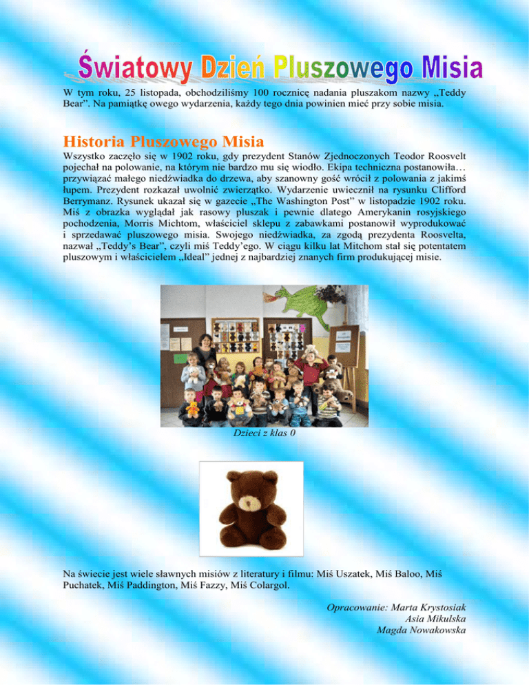 W tym roku, 25 listopada, obchodziliśmy 100 rocznicę nadania pluszakom nazwy „Teddy Bear”. Na pamiątkę owego wydarzenia, kaŜdy tego dnia powinien mieć przy sobie misia. Historia Pluszowego Misia Wszystko zaczęło się w 1902 roku, gdy prezydent Stanów Zjednoczonych Teodor Roosvelt pojechał na polowanie, na którym nie bardzo mu się wiodło. Ekipa techniczna postanowiła… przywiązać małego niedźwiadka do drzewa, aby szanowny gość wrócił z polowania z jakimś łupem. Prezydent rozkazał uwolnić zwierzątko. Wydarzenie uwiecznił na rysunku Clifford Berrymanz. Rysunek ukazał się w gazecie „The Washington Post” w listopadzie 1902 roku. Miś z obrazka wyglądał jak rasowy pluszak i pewnie dlatego Amerykanin rosyjskiego pochodzenia, Morris Michtom, właściciel sklepu z zabawkami postanowił wyprodukować i sprzedawać pluszowego misia. Swojego niedźwiadka, za zgodą prezydenta Roosvelta, nazwał „Teddy’s Bear”, czyli miś Teddy’ego. W ciągu kilku lat Mitchom stał się potentatem pluszowym i właścicielem „Ideal” jednej z najbardziej znanych firm produkującej misie. Dzieci z klas 0 Na świecie jest wiele sławnych misiów z literatury i filmu: Miś Uszatek, Miś Baloo, Miś Puchatek, Miś Paddington, Miś Fazzy, Miś Colargol. Opracowanie: Marta Krystosiak Asia Mikulska Magda Nowakowska