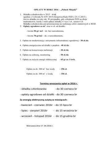 OPŁATY W ROKU 2016 – „Paluch Miejski” 1. Składka członkowska w 2015 - 6 zł. zgodnie z Uchwałą Nr 4/IV 2015r Krajowej Rady PZD z 25.11.2015 r. Jest to składka za cały rok. W przypadku, gdy członkami PZD są oboje małżonkowie, każdy z nich opłaca składkę w wys.3 zł., razem 6 zł. Składka członkowska jest przeznaczona na realizację celów statutowych w ROD. 2. Opłaty ogrodowe za m2, oraz w zł. od działki: - kwota 50 gr/ m2 – dz. bez nawodnienia, - kwota 70 gr/m2 – dz. z nawodnieniem, 3. Opłata na modernizację i utrzymanie infrastruktury ogrodowej - 30 zł./dz. 4. Opłata energetyczna od działki z prądem - 40 zł./dz. 5. Opłata na konserwacje melioracji - 20 zł./dz. 6. Opłata na ochronę, monitoring - 50 zł./dz. 7. Opłata za zużycie energii elektrycznej - 65 gr za 1 kwh. Opłata za dz. 300 m2 bez wody – 296 zł. Opłata za dz. 300 m2 z wodą – 356 zł. Terminy wnoszenia opłat w 2016 r. - składka członkowska - do 30 czerwca br - opłaty ogrodowe od działki - do 30 czerwca br Za energię elektryczną zużytą w miesiącach: - kwiecień - czerwiec 2016r - do 15 lipca br - lipiec - sierpień 2016r - do 15 września br - wrzesień - listopad 2016r - do 15 grudnia br Warszawa dnia 17. 04.2016 r.