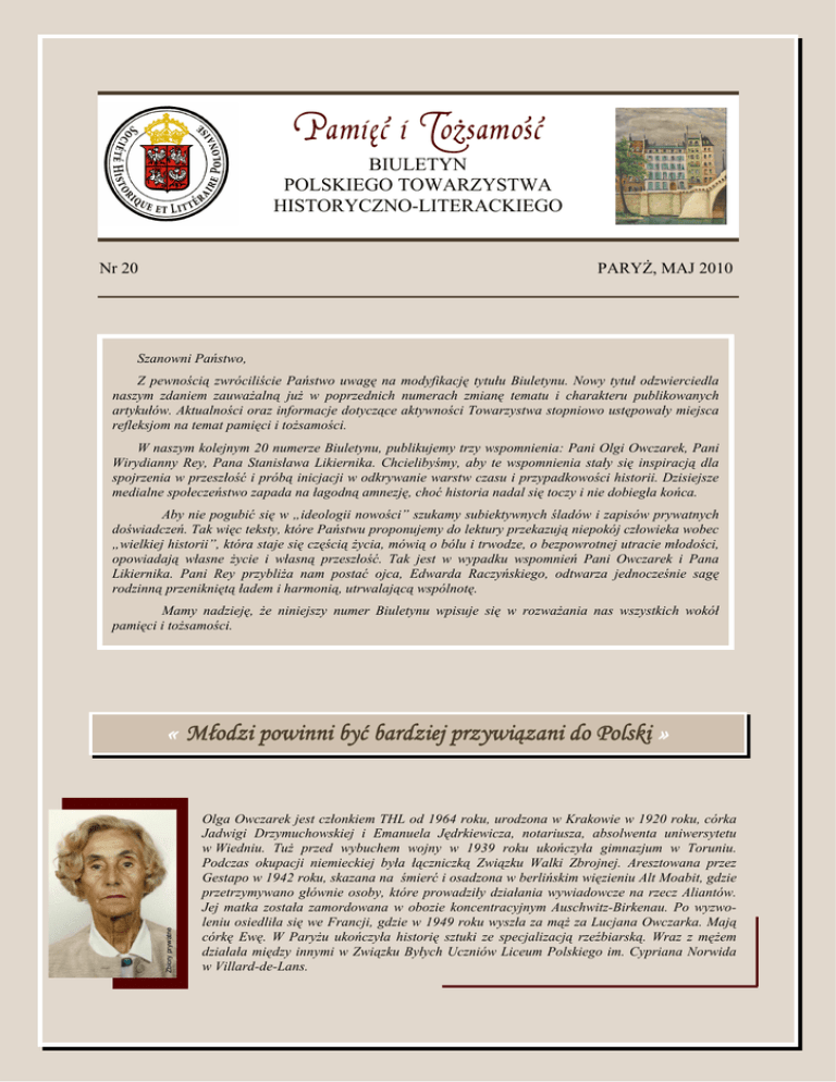 PAMIĘĆ i TOśSAMOŚĆ – BIULETYN THL 1 Pamięć i ToŜsamość BIULETYN POLSKIEGO TOWARZYSTWA HISTORYCZNO-LITERACKIEGO Nr 20 PARYś, MAJ 2010 Szanowni Państwo, Z pewnością zwróciliście Państwo uwagę na modyfikację tytułu Biuletynu. Nowy tytuł odzwierciedla naszym zdaniem zauwaŜalną juŜ w poprzednich numerach zmianę tematu i charakteru publikowanych artykułów. Aktualności oraz informacje dotyczące aktywności Towarzystwa stopniowo ustępowały miejsca refleksjom na temat pamięci i toŜsamości. W naszym kolejnym 20 numerze Biuletynu, publikujemy trzy wspomnienia: Pani Olgi Owczarek, Pani Wirydianny Rey, Pana Stanisława Likiernika. Chcielibyśmy, aby te wspomnienia stały się inspiracją dla spojrzenia w przeszłość i próbą inicjacji w odkrywanie warstw czasu i przypadkowości historii. Dzisiejsze medialne społeczeństwo zapada na łagodną amnezję, choć historia nadal się toczy i nie dobiegła końca. Aby nie pogubić się w „ideologii nowości” szukamy subiektywnych śladów i zapisów prywatnych doświadczeń. Tak więc teksty, które Państwu proponujemy do lektury przekazują niepokój człowieka wobec „wielkiej historii”, która staje się częścią Ŝycia, mówią o bólu i trwodze, o bezpowrotnej utracie młodości, opowiadają własne Ŝycie i własną przeszłość. Tak jest w wypadku wspomnień Pani Owczarek i Pana Likiernika. Pani Rey przybliŜa nam postać ojca, Edwarda Raczyńskiego, odtwarza jednocześnie sagę rodzinną przenikniętą ładem i harmonią, utrwalającą wspólnotę. Mamy nadzieję, Ŝe niniejszy numer Biuletynu wpisuje się w rozwaŜania nas wszystkich wokół pamięci i toŜsamości. Zbiory prywatne « Młodzi powinni być bardziej przywiązani do Polski » Olga Owczarek jest członkiem THL od 1964 roku, urodzona w Krakowie w 1920 roku, córka Jadwigi Drzymuchowskiej i Emanuela Jędrkiewicza, notariusza, absolwenta uniwersytetu w Wiedniu. TuŜ przed wybuchem wojny w 1939 roku ukończyła gimnazjum w Toruniu. Podczas okupacji niemieckiej była łączniczką Związku Walki Zbrojnej. Aresztowana przez Gestapo w 1942 roku, skazana na śmierć i osadzona w berlińskim więzieniu Alt Moabit, gdzie przetrzymywano głównie osoby, które prowadziły działania wywiadowcze na rzecz Aliantów. Jej matka została zamordowana w obozie koncentracyjnym Auschwitz-Birkenau. Po wyzwoleniu osiedliła się we Francji, gdzie w 1949 roku wyszła za mąŜ za Lucjana Owczarka. Mają córkę Ewę. W ParyŜu ukończyła historię sztuki ze specjalizacją rzeźbiarską. Wraz z męŜem działała między innymi w Związku Byłych Uczniów Liceum Polskiego im. Cypriana Norwida w Villard-de-Lans. PAMIĘĆ i TOśSAMOŚĆ – BIULETYN THL 2 Barbara Kłosowicz: Jest Pani członkiem THL. Jaki był pierwszy Pani kontakt z Towarzystwem? Olga Owczarek: Jak przyjechałam do Francji w 1947 roku, mąŜ opowiadał mi bardzo duŜo o Towarzystwie. Między innymi wspominał jak po zajęciu ParyŜa przez Niemców, jego ojciec przyjechał wozem i wywiózł wszystkie najwartościowsze ksiąŜki. Po wojnie, po moim przyjeździe do ParyŜa nie od razu chodziłam do Biblioteki. Po pierwsze byłam studentką bez grosza i musiałam jakoś przeŜyć. Dopiero duŜo później, równocześnie z męŜem, zostałam wprowadzona do Towarzystwa przez płk. Tadeusza Rudnickiego. Roku dokładnie nie pamiętam... Tylko raz podejrzałam: w przesyłce były plany fortyfikacji, które Niemcy zrobili na półwyspie helskim. Czasami wyjeŜdŜałam poza Warszawę do najbliŜszych miejscowości jak Pruszków i okolice (tam przychodziła poczta naszych agentów z terenu niemieckiego), nie dalej, poniewaŜ w czasie wojny komunikacja była bardzo ograniczona i Niemcy kontrolowali pasaŜerów w pociągach. Dokumenty dostarczałam do centrali ZWZ, która mieściła się na ulicy Polnej. Związek Jaszczurczy zajmował się między innymi wyrabianiem fałszywych papierów. Dostarczał je odbiorcom nie tylko na terenie Polski, ale równieŜ we Francji. Podobno były bardzo dobrze podrobione. Po wybuchu wojny była Pani łącznikiem organizacji „Związek Jaszczurczy” utworzonej w 1939 roku, której nazwa nawiązywała do historycznego Związku Jaszczurczego z XIV wieku, powołanego do walki z Zakonem KrzyŜackim. Jak przeŜyła Pani okupację? ZdąŜyłam zdać maturę w Toruniu jeszcze przed wojną w 1939 roku. Tego roku moja rodzina przeniosła się do Warszawy, gdzie moja starsza o dwa lata siostra juŜ studiowała w WyŜszej Szkole Handlowej. Wybuch wojny był dla mnie wielkim szokiem. Dopiero wtedy, kiedy Polska została zajęta przez Niemców zrozumiałam co oznaczały zabory Polski, katowania Polaków, bo właściwie wszystko się powtórzyło, tylko w sposób duŜo bardziej okrutny. Na początku wojny moja siostra wyszła za mąŜ za oficera, artylerzystę, Kazimierza Rzaniaka1. On mnie wprowadził do Związku Walki Zbrojnej2 (złoŜyłam przysięgę u księdza na Mokotowie), chociaŜ początkowo bardzo nie chciał, bo bał się odpowiedzialności, bał się o mnie. Sam zginął w czasie wojny, prawdopodobnie w Rosji. Napisano o nim ksiąŜkę3, którą przysłała mi siostra. Siostra przeŜyła wojnę. Nie mogła naleŜeć do Ŝadnej organizacji, miała malutkie dziecko. Kazimierz widział syna tylko raz w Ŝyciu. Wyjechał na Wschód w 1943 roku i juŜ nie wrócił. Ja byłam łącznikiem w Związku Walki Zbrojnej i w Związku Jaszczurczym. Przewoziłam papiery, plany, nie zaglądałam co zawierały, starałam się za duŜo nie wiedzieć dla bezpieczeństwa Związku. Pamięta Pani doskonale okoliczności aresztowania... Zostałam aresztowana 20 października 1942 roku. Ktoś z organizacji wsypał nie tylko mnie, ale bardzo wiele osób. To był Polak, który miał matkę staruszkę. W zamian za swoje zwolnienie poszedł na współpracę z Niemcami. Potem uciekł do Niemiec. Gestapo przyszło po mnie do domu. Po trzech dniach pobytu na Pawiaku wywieźli mnie do Berlina, do więzieni