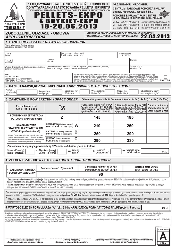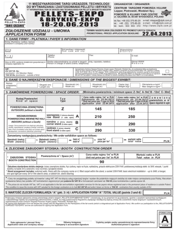 11 MIÊDZYNARODOWE TARGI URZ¥DZEÑ, TECHNOLOGII ORGANIZATOR / ORGANIZER: DO WYTWARZANIA I ZASTOSOWANIA PELLETU I BRYKIETU CENTRUM TARGOWE POMORZA I KUJAW 11th INTERNATIONAL FAIR OF DEVICES AND TECHNOLOGIES FOR PELLET & BRIQUETTE INDUSTRY P EL L ET S -EXP O & BRYKIET-EXPO ZG£OSZENIE UDZIA£U - UMOWA APPLICATION FORM ul. GAJOWA 34, 85-087 BYDGOSZCZ, POLAND tel./fax: +48 (52) 375-80-29 tel.: +48 (52) 375-80-28 tel. kom. 503 903 310 18-20.06.2013 “TANIE GRZANIE” Lepper, Piotrowski, Wodzieñ Sp.j. POMORZE & KUJAWY FAIR CENTRE e-mail: [email protected] e-mail: [email protected] h t t p : / / w w w. c t p i k . c o m . p l TERMIN NADSY£ANIA ZG£OSZEÑ PO PROMOCYJNYCH CENACH: PROMOTIONAL PRICES APPLICATION DEADLINE: 22.04.2013 1. DANE FIRMY - P£ATNIKA / PAYER`S INFORMATION Firma Wystawcy (pe³na nazwa) Exhibitor’s company (full name): Kod pocztowy i miejscowoœæ Post code and city: Ulica Street: Województwo District: Telefon Phone: K r a j Country: Fax: E-mail: Strona WWW Website: Wpis do KRS; ewidencji dzia³alnoœci gospodarczej nr Osoba odpowiedzialna za udzia³ w targach (imiê, nazwisko, telefon) Person in charge of stand (name, telephone): Company registration no: Upowa¿niamy Centrum Targowe Pomorza i Kujaw Lepper, Piotrowski, Wodzieñ Sp.j. do wystawiania faktur za œwiadczone us³ugi na rzecz naszej firmy bez podpisu nabywcy us³ug. Jesteœmy uprawnieni do otrzymywania faktur VAT. Zgodnie z Ustaw¹ z dnia 18.07.2002r. (Dz.U. Nr 144, pozycja. 1204) o œwiadczeniu us³ug drog¹ elektroniczn¹, wyra¿amy zgodê na otrzymywanie nformacji marketingowych od firmy CTPiK drog¹ elektroniczn¹. We authorize P&KFC to issue the invoice without our signature. TAK/YES We are VAT tax payers. I hereby declare my consent to receive marketing information from P&KFC on e-mail address. NIP: EU VAT ID. No: (contractor - EU Member State) TAX ID No: (contractor - outside of EU): 2. DANE O NAJWIÊKSZYM EKSPONACIE / DIMENSIONS OF THE BIGGEST EXHIBIT: Nazwa urz¹dzenia Kind: Szerokoœæ (m) Width (m) D³ugoœæ (m) Length (m) 3. ZAMÓWIENIE POWIERZCHNI / SPACE ORDER: Wysokoœæ (m) Height (m) Obci¹¿enie w kg/m2 Max weight in kg/m2 Ciê¿ar (kg) Weight (kg) (Minimalna powierzchnia / minimum space: Z- 9m;2 A- 9m;2 B - 12m;2 C- 30m)2 Rodzaj Powierzchni Kind of space Typ Type * Cena netto najmu 1m2 w PLN Zg³oszenie do 22.04.2013 * Unit net price per 1 sqm in PLN Application until 22.04.2013 * Cena netto najmu 1m2 w PLN Zg³oszenie po 22.04.2013 * Unit net price per 1 sqm in PLN Application after 22.04.2013 POWIERZCHNIA ZEWNÊTRZNA OUTDOORS (without a booth) Z 145 185 A 210 250 corner stand (2 sides open) B 250 290 czo³owa (3 strony otwarte) front stand (3 sides open) C 290 330 szeregowa (1 strona otwarta) NIEZABUDOWANA row stand (1 side open) POWIERZCHNIA WEWNÊTRZ HALI naro¿na (2 strony otwarte) INDOORS (without a booth) Uwaga: Cena powierzchni nie obejmuje zabudowy stoiska, wyposa¿enia i przy³¹czy (energii, wod-kan) Note: Price of exhibition area does not contain stand development, connections (electrical, plumming) Z a m a w i a n a2 powierzchnia w m Space required in sqm Zamawiamy nastêpuj¹c¹ powierzchniê / We order exhibition space as follows: Szerokoœæ (metry) Width (meters) x G³êbokoœæ (metry) Depth (meters) 2 x cena 1m iloœæ m22 = total m price per 1m2 wartoœæ netto = total value PLN 4. ZLECENIE ZABUDOWY STOISKA / BOOTH CONSTRUCTION ORDER * ZABUDOWA STOISKA * BOOTH CONSTRUCTION Powierzchnia m2 / Space (m2) Cena netto najmu 1m2 w PLN Unit net price per 1m2 in PLN Wartoœæ netto w PLN Total value in PLN 90 * Zabudowa standardowa stoiska obejmuje: œciany zewnêtrzne stoiska, fryz czo³owy, napis na fryzie, wyk³adzinê, gniazdo elektryczne 230V/1kW, podstawow¹ instalacjê elektr. do 3kW, wieszak, 1 punkt œwietlny na ka¿de 3m2p owierzchni, kosz na œmieci, sprz¹tanie stoiska * Stand arrangement includes: external walls, frieze with the company name on it, fitted carpet within the stand, a socket 230V/1kW, basic electrical installation - up to 3kW, a hanger, one spot light per every 3m2o f the stand’s area, a rubbish bin, stand cleaning * - Ceny nie uwzglêdniaj¹ podatku od towarów i us³ug VAT. VAT nie dotyczy us³ug organizacji targów i wystaw dla podatników maj¹cych siedzibê lub sta³e miejsce zamieszkania poza Polsk¹. Warunkiem wystawienia faktury bez podatku VAT kontrahentom zagranicznym jest podanie EU VAT ID w formularzach zamówieñ lub TAX ID przez kontrahentów z pañstw spoza UE. *- The prices do not include VAT tax. VAT is not applicable to the fair and exhibition organization services for the tax payers whose registered seat or the permanent place of residence is outside Poland. The condition to issue the invoice with VAT exluded for the foreign contractors is to hold EU VAT ID and write it down on forms or TAX ID - contractors from country outside of EU. 5. WARTOŒÆ ZLECEÑ FORMULARZA “A” (pkt. 3 i 4) / APPLICATION FORM “A” TOTAL VALUE (points 3 and 4): PLN Podpisuj¹cy niniejsze zg³oszenie-umowê potwierdzaj¹ udzia³ w targach „PELLETS-EXPO&BRYKIET-EXPO” i oœwiadczaj¹, ¿e s¹ uprawnieni do jej podpisania, zgodnie z zasadami reprezentacji wynikaj¹cymi z odpowiedniego rejestru lub posiadanego pe³nomocnictwa, a tak¿e, ¿e znaj¹ postanowienia Regulaminu (bêd¹cego nieod³¹czn¹ czêœci¹ umowy) dla uczestników imprez targowych i wystawienniczych, organizowanych przez Centrum Targowe Pomorza i Kujaw Lepper, Piotrowski, Wodzieñ Sp.j. By signing that Application Form we declare the comply with the Regulations for the Participants of the fair events (which is integrational part of Application Form). We confirm our participation to the „PELLETS-EXPO & BRIQUETTES-EXPO” and we are authorized for signing that Application Form. FORMULARZ ..................................................................... Data zg³oszenia i pieczêæ firmy Application date and company stamp .........................................................